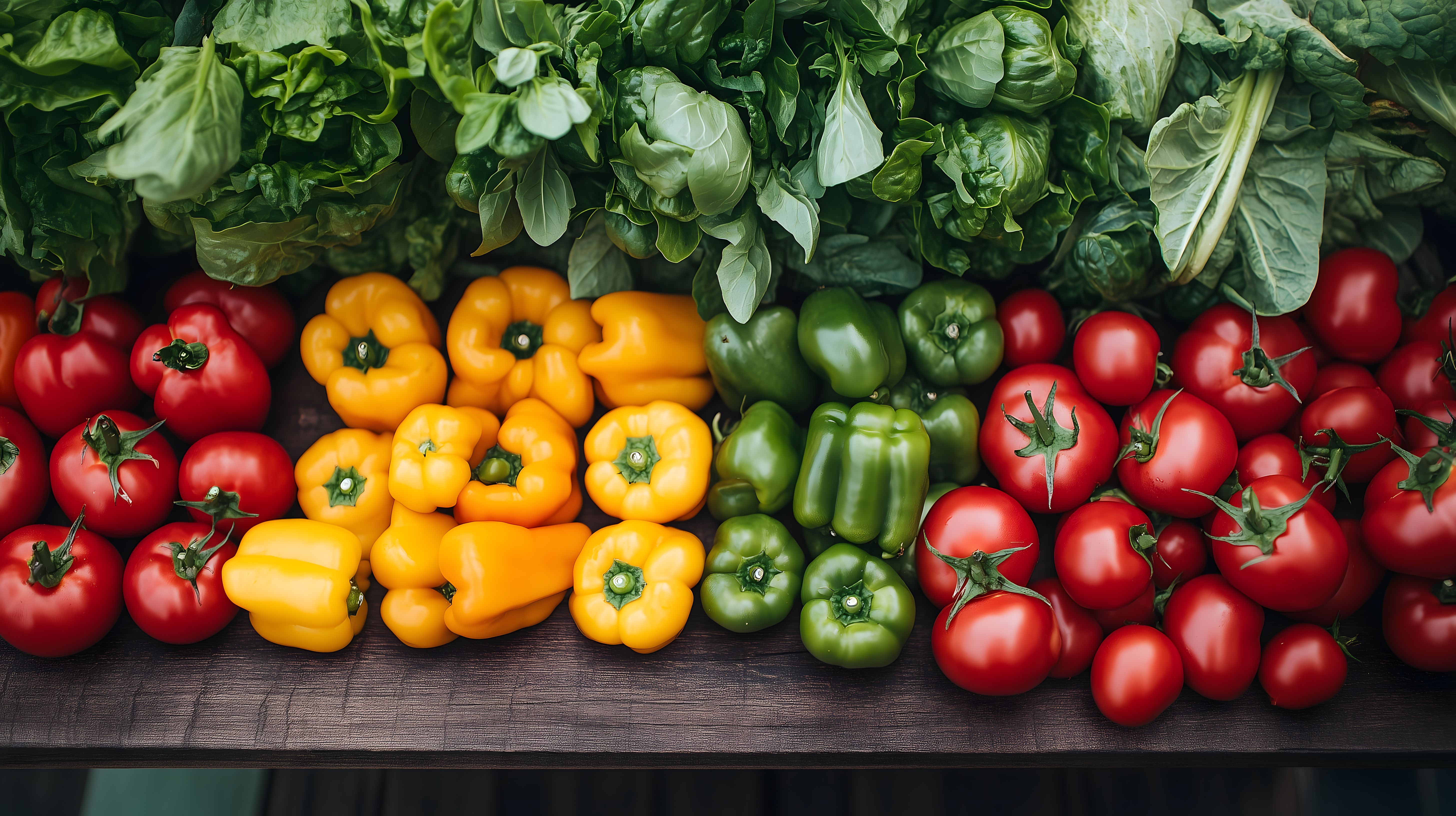 Dieses Bild zeigt eine bunte Auswahl an frischen Gemüsesorten, die auf einem hölzernen Untergrund angeordnet sind. Die Farben reichen von leuchtend roten Tomaten über saftig grüne Paprika bis hin zu orangefarbenen Paprikaschoten. Das Arrangement wirkt natürlich und lädt zum Genießen und Kochen ein. Das Foto ist ideal für den Einsatz in Blogs, Newslettern, Social-Media-Beiträgen oder Werbematerialien rund um gesunde Ernährung, Kochen und Lebensmittel. Dieses hochauflösende Stockfoto steht unter einer Creative-Commons-Lizenz zur Verfügung und kann kostenlos verwendet werden.