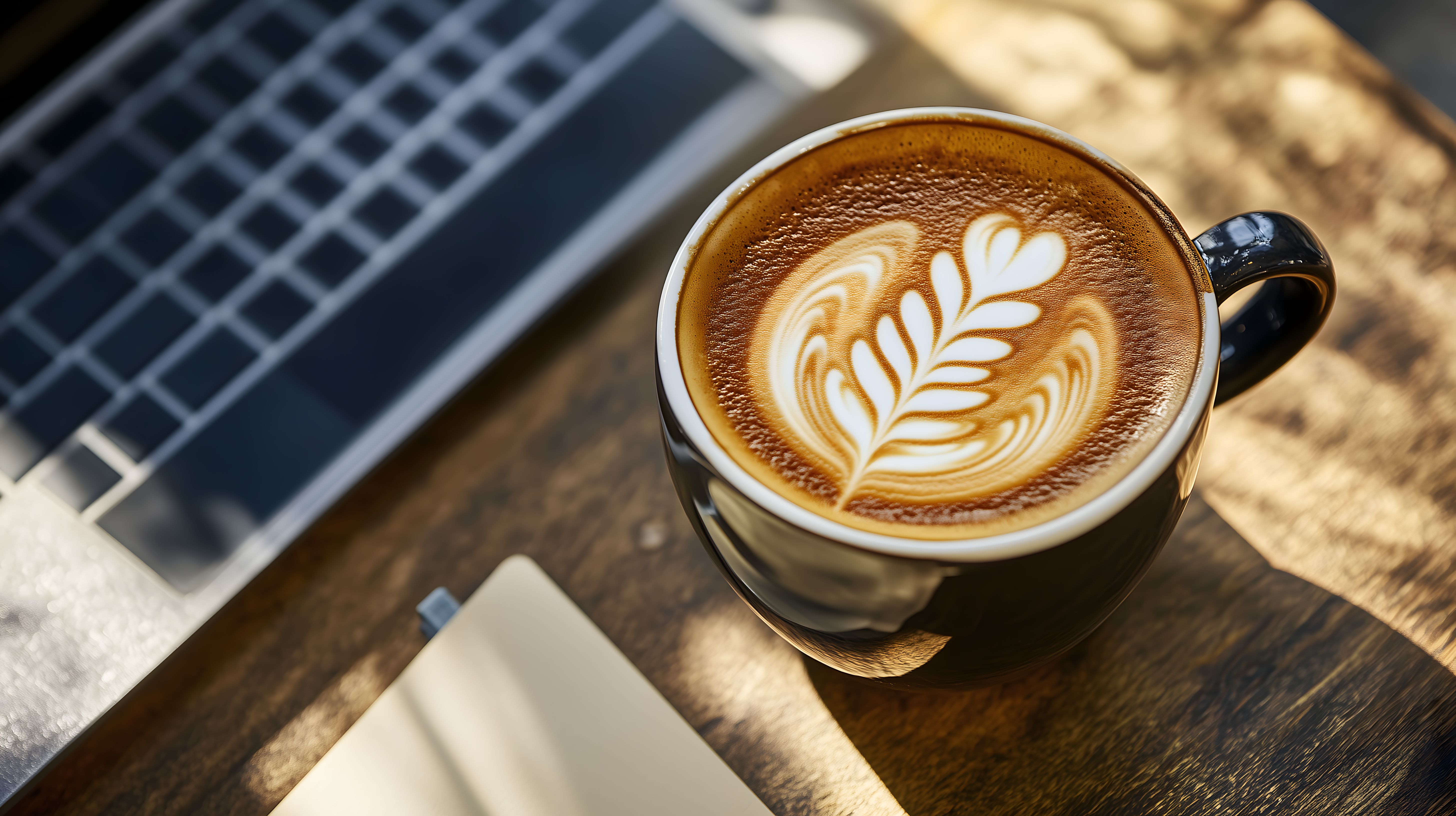 Dieses stimmungsvolle Foto zeigt eine Kaffeetasse mit kunstvoll gestaltetem Latte-Art auf einem Holztisch neben einem Laptop. Die Szene vermittelt eine gemütliche, entspannte Atmosphäre des Arbeitsalltags oder einer Kaffeepause. Die Fokussierung auf die Details des Kaffees, die Holzmaserung des Tischs und die Andeutung des Laptops schaffen eine einladende, natürliche Komposition. Dieses hochauflösende Stockfoto eignet sich hervorragend für Verwendungen in Blogs, Newslettern, auf Social-Media-Kanälen oder in Werbematerialien, die eine stimmungsvolle, arbeitsnahe Umgebung transportieren möchten. Es steht unter einer kostenlosen Creative-Commons-Lizenz zur Verfügung.