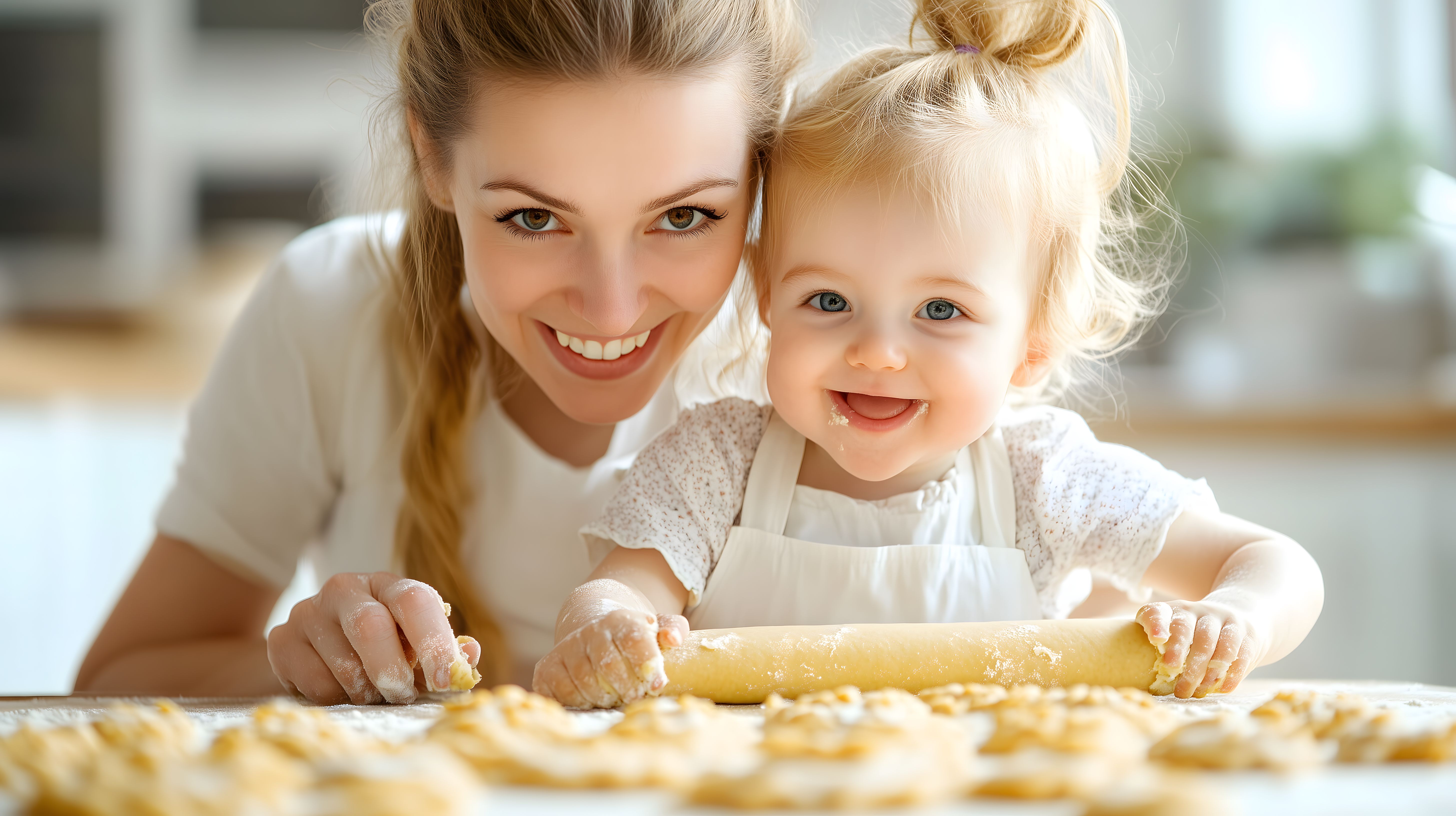 Das Foto zeigt eine lächelnde Mutter, die zusammen mit ihrem Kleinkind in der Küche Kekse backt. Sie sind beide in Schürzen gekleidet und haben Mehl an den Händen, was die Lebendigkeit und Freude des gemeinsamen Backens widerspiegelt. Das Bild vermittelt die Bindung und Verbundenheit zwischen Mutter und Kind sowie die Tradition des gemeinsamen Kochens und Backens. Das hochauflösende Stockfoto eignet sich hervorragend für Familienrezepte, Blogs zum Thema Elternschaft, Social-Media-Beiträge und Werbung für Kinderprodukte. Es steht unter einer Creative-Commons-Lizenz zur Verfügung.