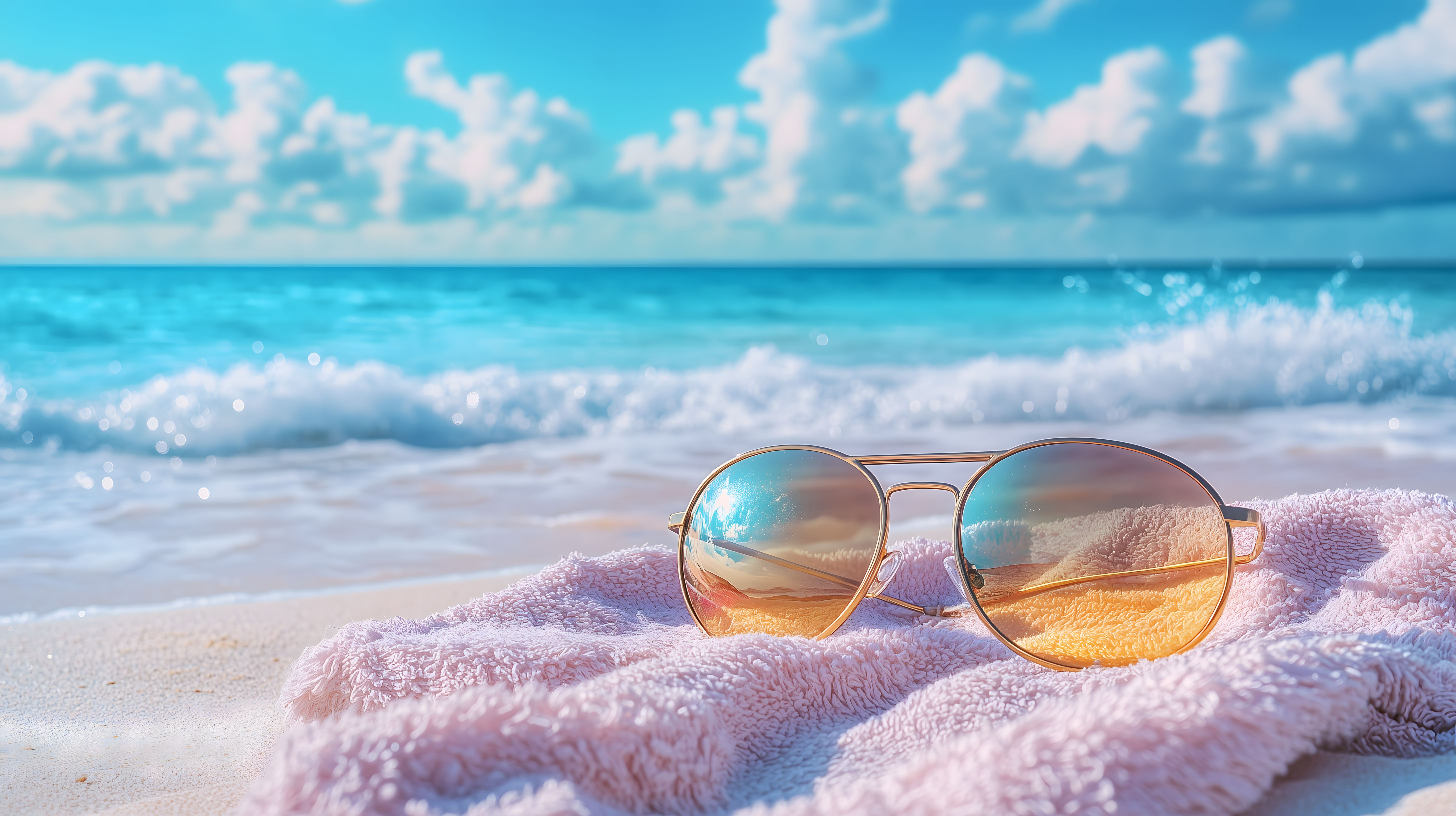 Dieses stimmungsvolle Foto zeigt eine Sonnenbrille auf einem flauschigen rosa Handtuch am Strand. Im Hintergrund erstreckt sich ein traumhafter Panoramablick auf den türkisfarbenen Ozean, der von weißen Schaumkronen umsäumt ist und sich unter einem blauen Himmel mit Wattewolken erstreckt. Das Foto vermittelt ein Gefühl von Erholung, Entspannung und Sommerfeeling. Es eignet sich perfekt als kostenloses Stockfoto für Blog-Beiträge, Social-Media-Posts, Werbekampagnen oder Newslettergestaltung in hoher Auflösung und unter Creative-Commons-Lizenz.