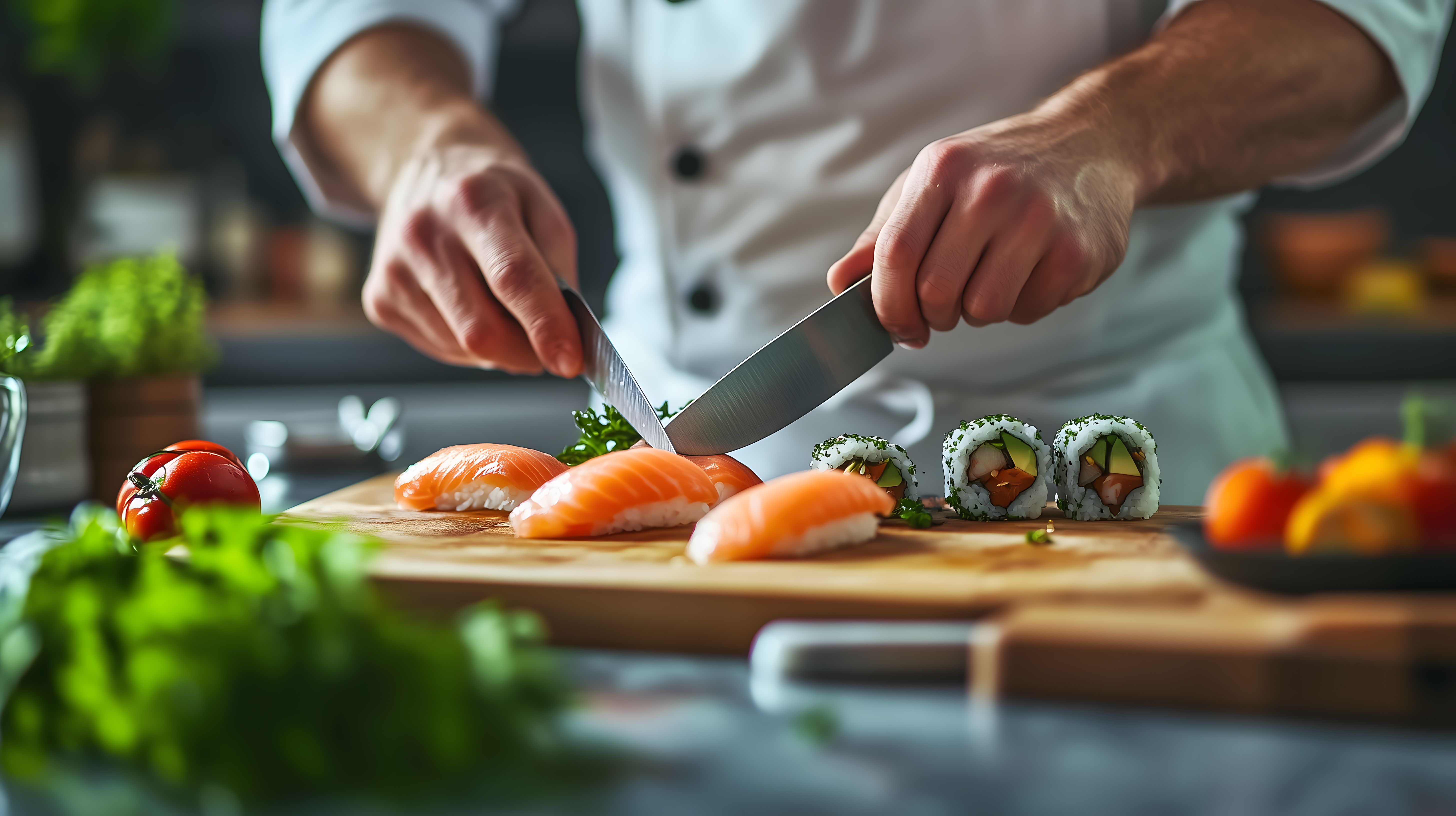 Dieses Bild zeigt einen Chefkoch, der saisonale Sushirollen in einer modernen Küche zubereitet. Er hält ein Messer in der Hand und schneidet frische, hochwertige Zutaten wie Lachs, Gurke und Meeresfrüchte auf einem Holzbrett. Im Hintergrund sind weitere Lebensmittel, Gewürze und Utensilien zu sehen, die auf eine professionelle Küche hinweisen. Die Komposition, Farbgestaltung und Perspektive machen das Bild sehr appetitlich und stimmungsvoll. Es eignet sich hervorragend als kostenloses Stockfoto für Blogs, Newsletter, Social-Media-Posts oder andere Werbeanwendungen in hoher Auflösung und unter Creative-Commons-Lizenz.
