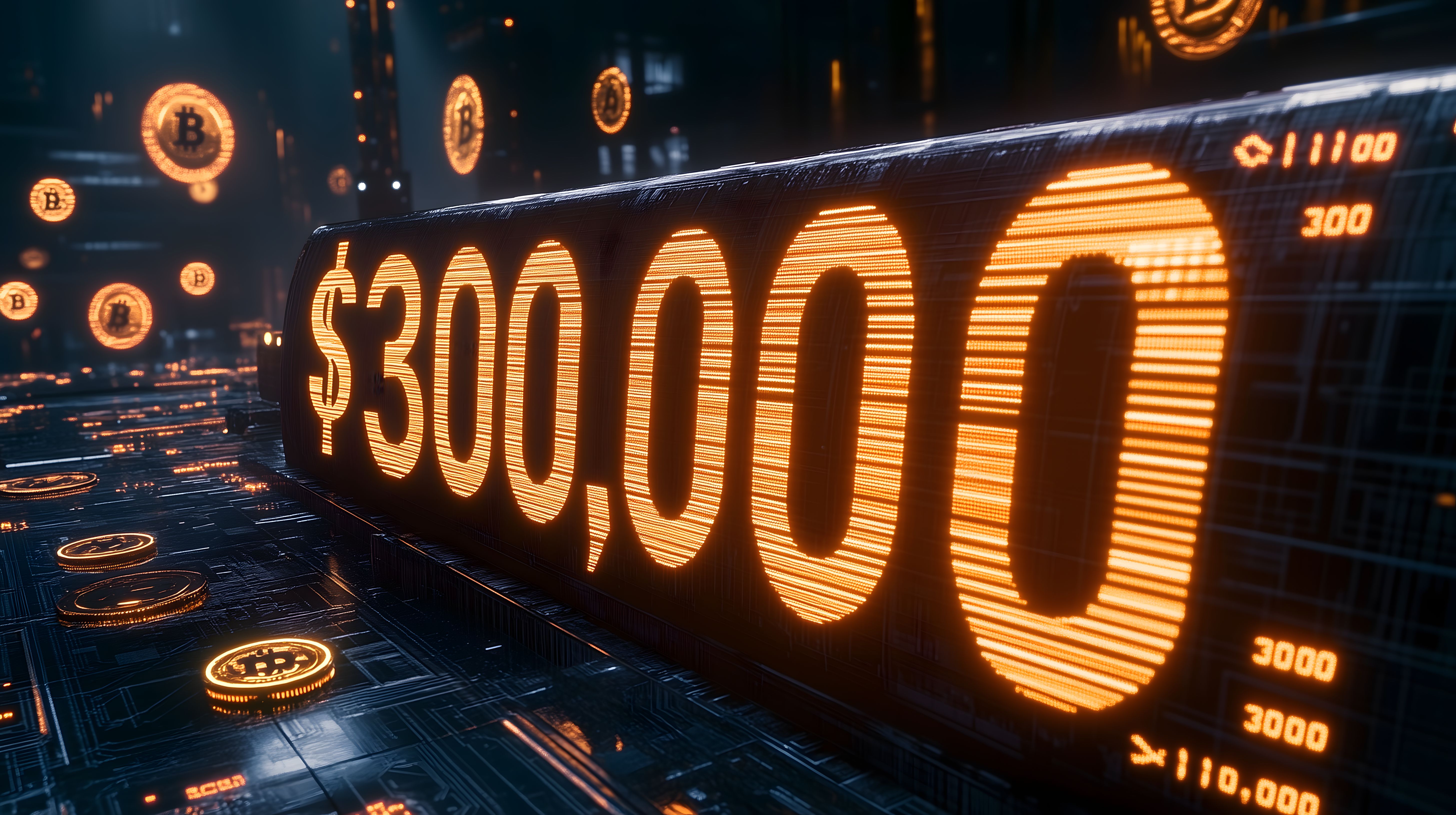 Das Bild zeigt eine futuristische digitale Anzeige, die den Wert von Bitcoin auf 300.000 US-Dollar darstellt. Die Zahl ist in leuchtenden orangefarbenen Ziffern auf einem schwarzen Hintergrund zu sehen, umgeben von kleineren Bitcoin-Symbolen, die ebenfalls orange leuchten. Das Motiv vermittelt den Eindruck eines hochpreisigen Krypto-Investments und passt gut zu Themen wie Finanzen, Technologie und digitale Währungen. Dieses hochauflösende Stockfoto ist unter einer Creative-Commons-Lizenz frei nutzbar und eignet sich hervorragend für Blog-Beiträge, Newsletter oder Social-Media-Werbung rund um das Thema Kryptowährungen.