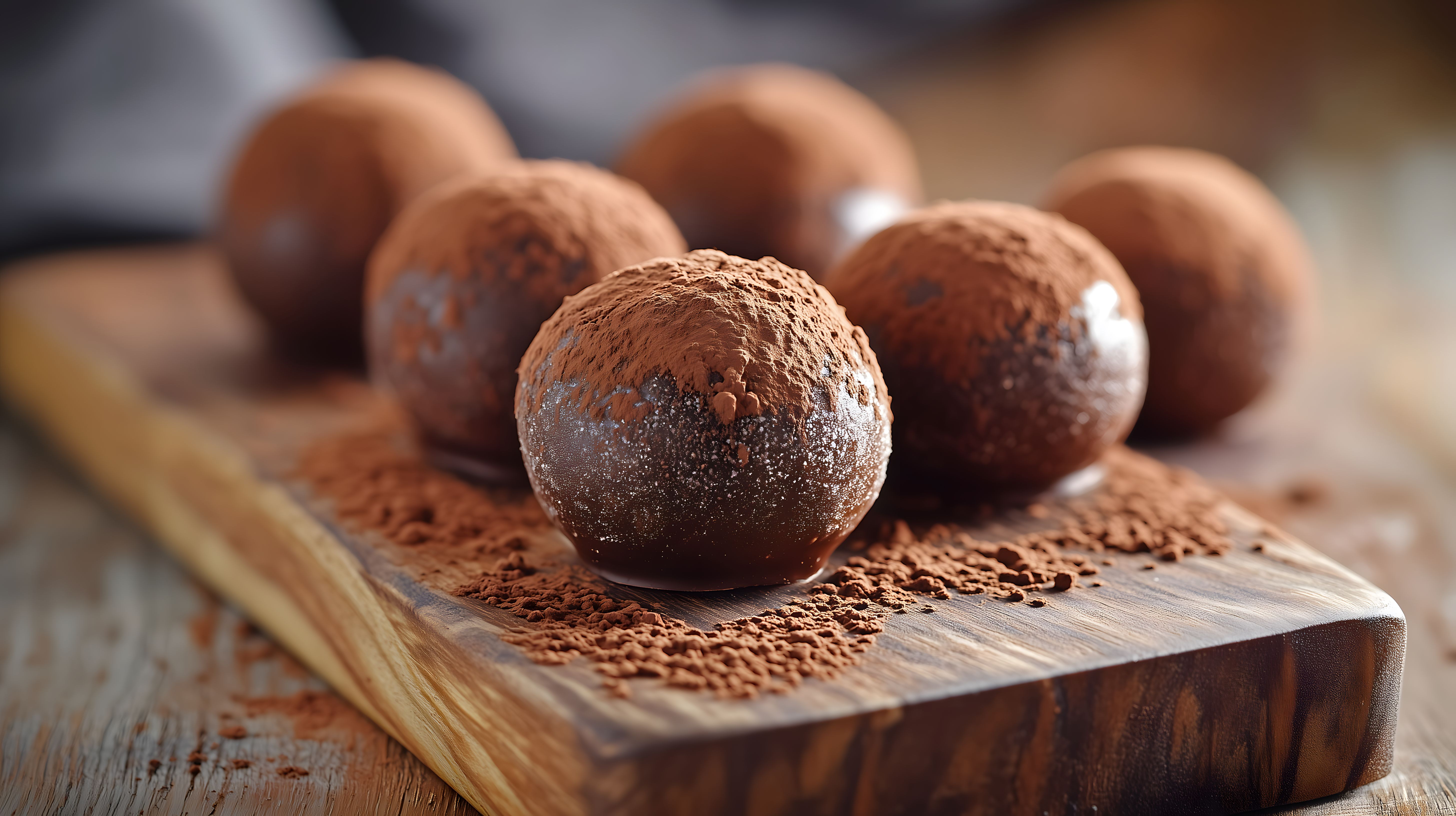 Dieses Bild zeigt eine Anordnung von leckeren, handgemachten Schokoladentrüffeln auf einem rustikalen Holzbrett. Die Trüffel sind mit feinem Kakaopulver bestäubt, was ihnen einen delikaten, dunklen Glanz verleiht. Die Komposition wirkt appetitlich und edel, ideal als Hintergrundbild für Foodblogbeiträge, Rezeptsammlungen oder Werbematerial für Schokolade und Feinkost. Dieses hochauflösende Stockfoto ist unter einer Creative-Commons-Lizenz frei verwendbar.