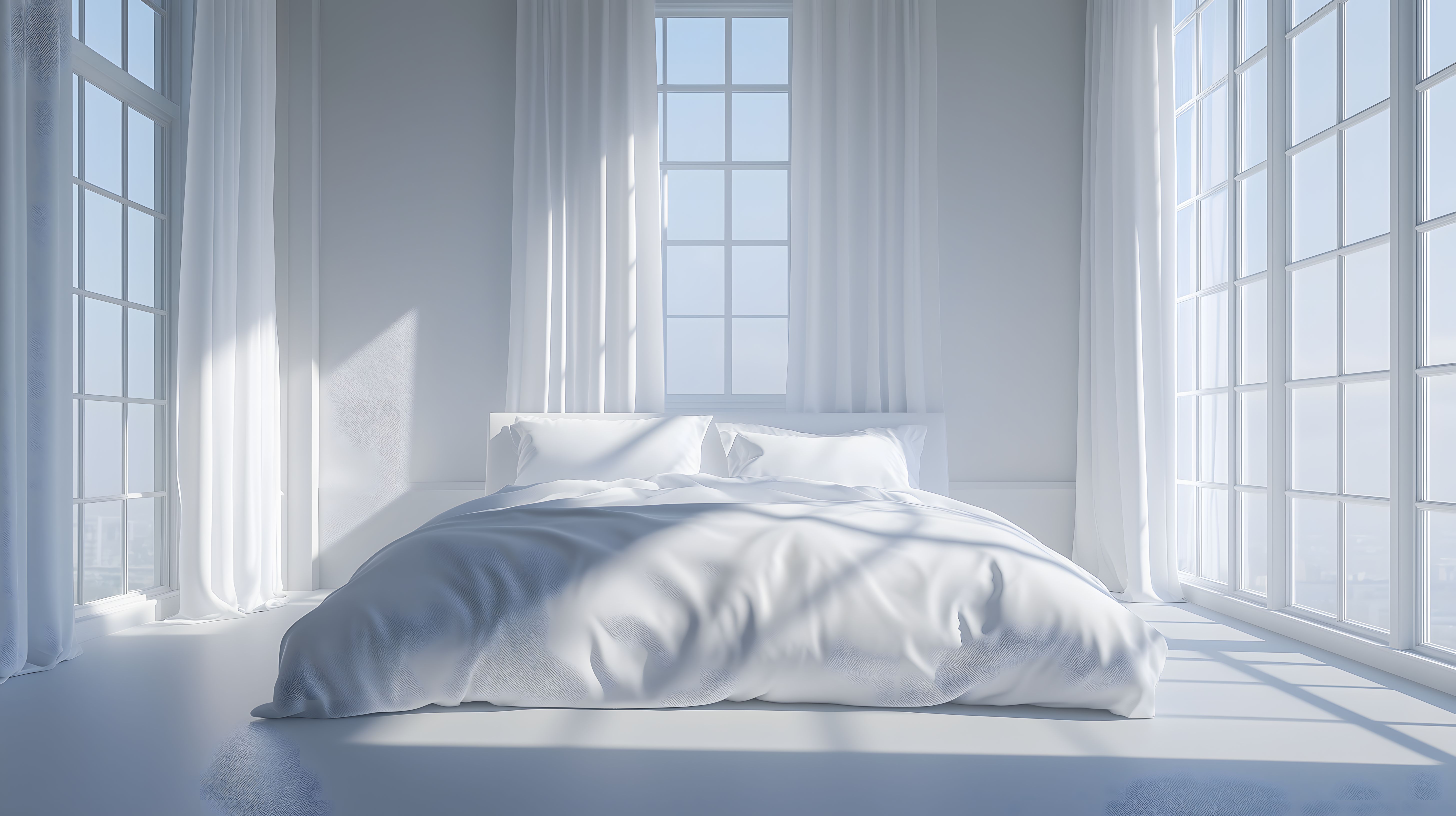 Dieses Foto zeigt ein helles, minimalistisch gestaltetes Schlafzimmer in Weiß und Grau. Der Fokus liegt auf einem großen Bett mit weißer Bettwäsche, umgeben von bodentiefen Fenstern, die das Zimmer mit natürlichem Tageslicht überfluten. Die schwebenden Vorhänge verleihen dem Raum eine ruhige, entspannende Atmosphäre. Dieses Stockfoto eignet sich hervorragend als Hintergrund- oder Dekorationselement für Blogs, Newsletter, Social-Media-Posts oder Werbematerial, da es in hoher Auflösung und unter Creative-Commons-Lizenz zur Verfügung steht.