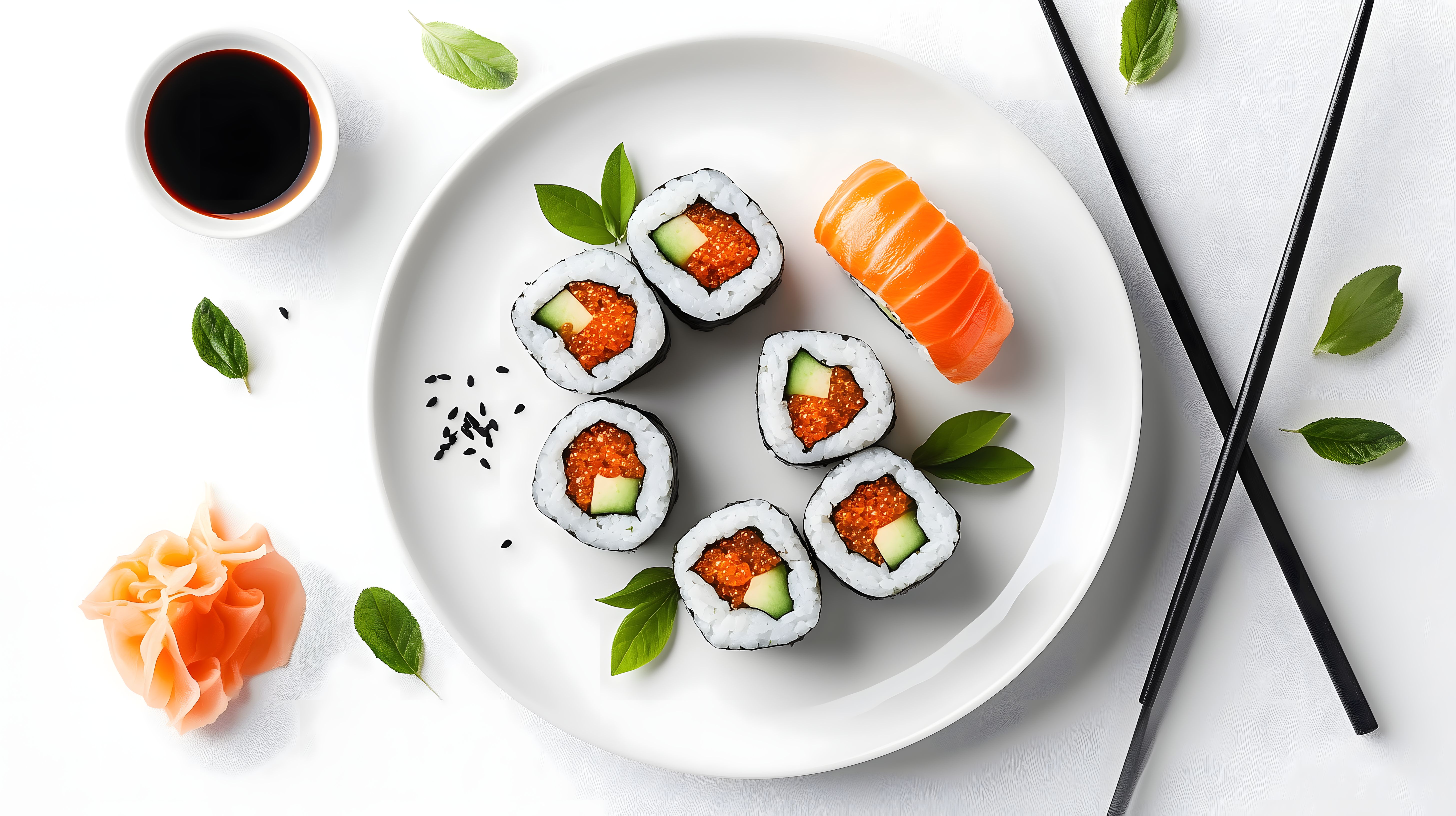 Dieses Bild zeigt eine Anordnung von frisch zubereitetem Sushi auf einem weißen Teller. Die Sushirollen sind mit Lachs und Gurke gefüllt und mit Sojasauce garniert. Neben dem Teller sind weitere japanische Zutaten wie Basilikumblätter und eine Schale mit Sojasauce zu sehen. Die Komposition ist elegant und minimalistisch, was das Sushi als Hauptakteur in den Vordergrund rückt. Dieses hochauflösende Stockfoto in hellen Farben eignet sich ideal für die Verwendung in Rezeptbüchern, Foodblogs, Werbeanzeigen oder Social-Media-Beiträgen zum Thema asiatische Küche und gesunde Ernährung. Das Bild steht unter einer Creative-Commons-Lizenz zur kostenlosen Nutzung zur Verfügung.