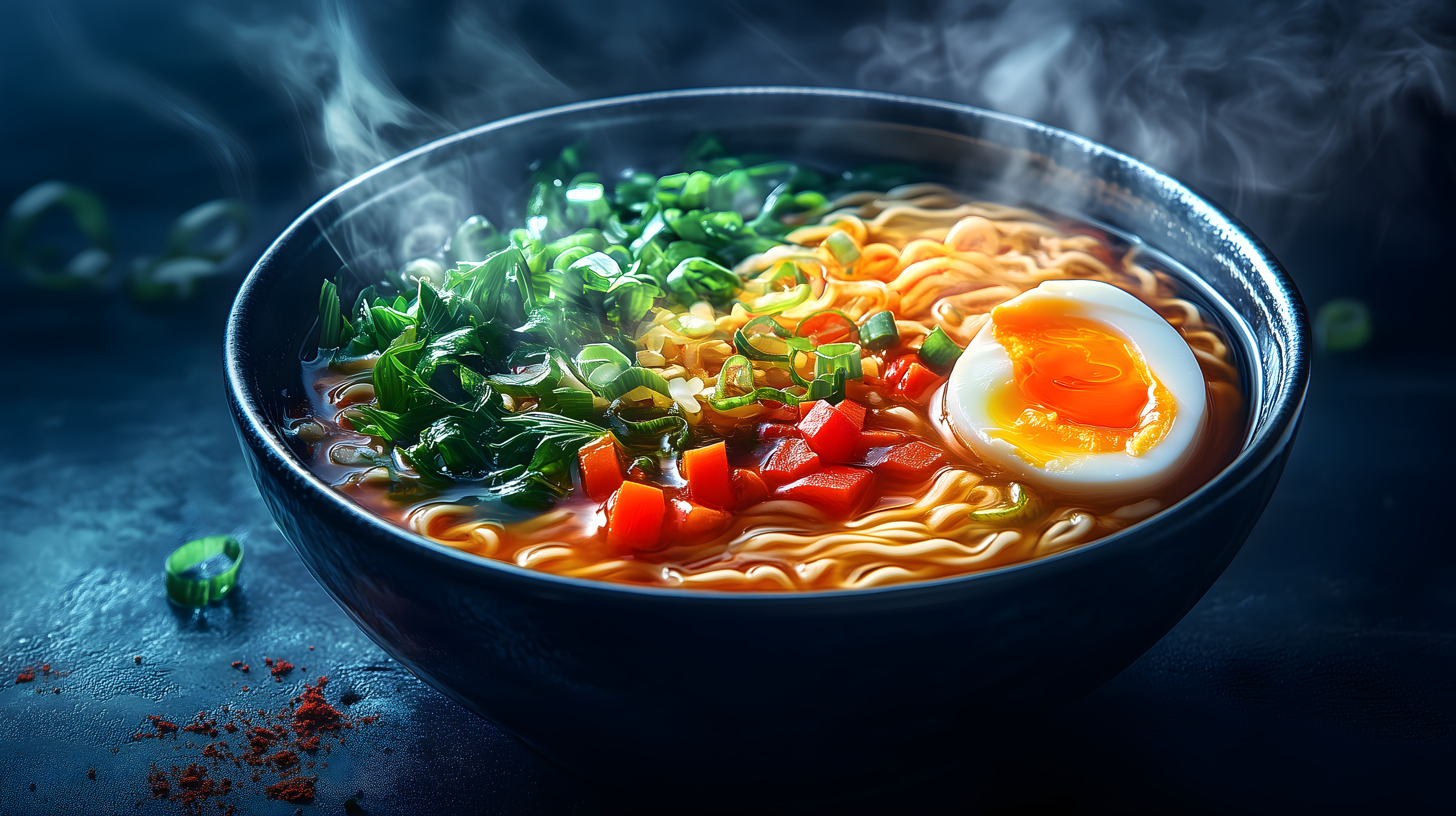 Dieses Stockfoto zeigt eine dampfende Schüssel voller Ramen-Nudelsuppe mit frischen Zutaten. Die Nahaufnahme enthüllt die saftigen Ramen-Nudeln, die von knackigem Gemüse wie Frühlingszwiebeln und Paprika umgeben sind. Ein weiches, gekochtes Ei ziert die Mitte des Gerichts und verleiht der Suppe eine schöne Textur und Farbe. Die Dampfschwaden erzeugen eine appetitanregende Atmosphäre. Dieses hochauflösende Foto eignet sich ideal für die Verwendung in Blogs, Newslettern, Social-Media-Posts oder Werbekampagnen rund um Lebensmittel, asiatische Küche oder Kochen. Als kostenloses Stockfoto unter Creative-Commons-Lizenz ist es frei nutzbar.