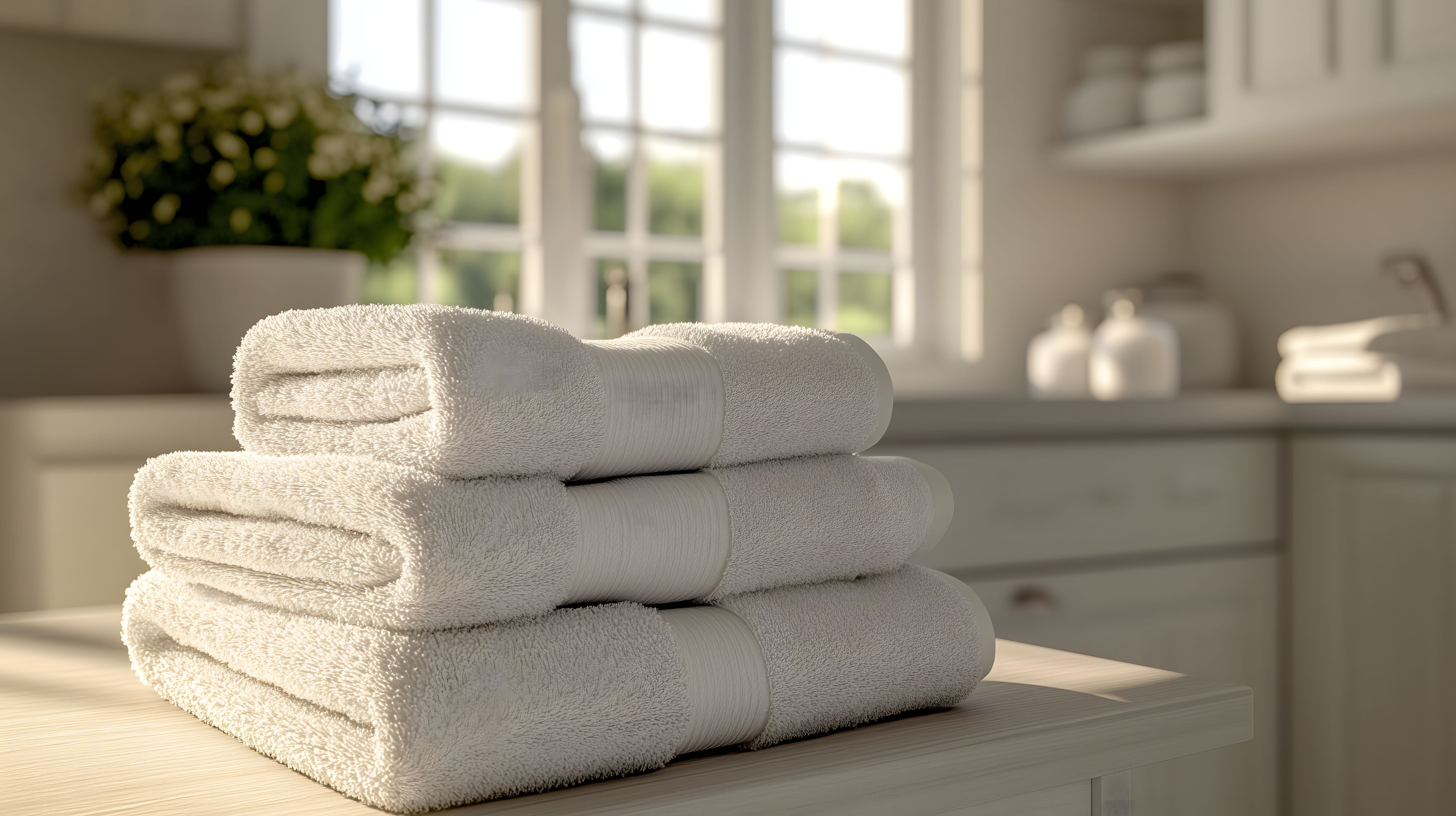 Dieses Foto zeigt einen eleganten Stapel weicher, hochwertig aussehender Handtücher, abgelegt auf einer edlen Holzoberfläche. Der Raum, der durch die großen Fenster sichtbar wird, verleiht dem Arrangement einen hellen, modernen und entspannenden Charakter. Die Kombination aus den flauschigen Textilien und der natürlichen Holzoptik schafft ein stimmungsvolles Bad-Ambiente, das Ruhe und Gemütlichkeit ausstrahlt.