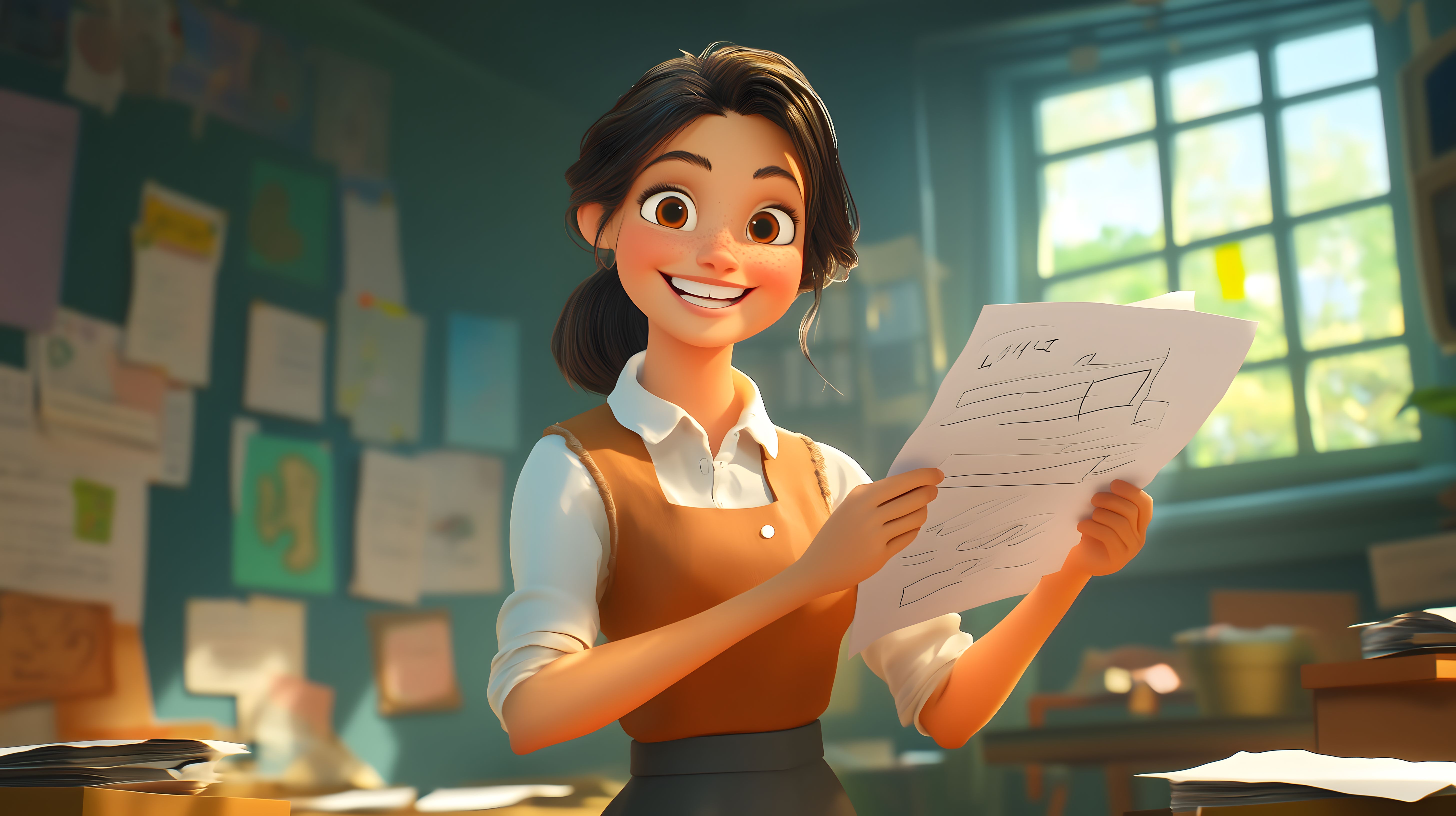 Die Illustration zeigt eine Lehrerin, die einem Schüler lächelnd Schulaufgaben austeilt. Sie steht in einem hellen, bunt gestalteten Klassenzimmer mit Plakaten und Zeichnungen an den Wänden. Der Fokus liegt auf der positiven Interaktion zwischen Lehrkraft und Schüler, die Erfolg und Motivation vermittelt. Diese Szene eignet sich hervorragend als kostenloses, hochauflösendes Stockfoto für Bildungsinhalte, Blogs, Newsletter oder Social-Media-Posts rund um die Themen Schule, Lernen und Lehren. Das Bild ist unter einer Creative-Commons-Lizenz verfügbar.