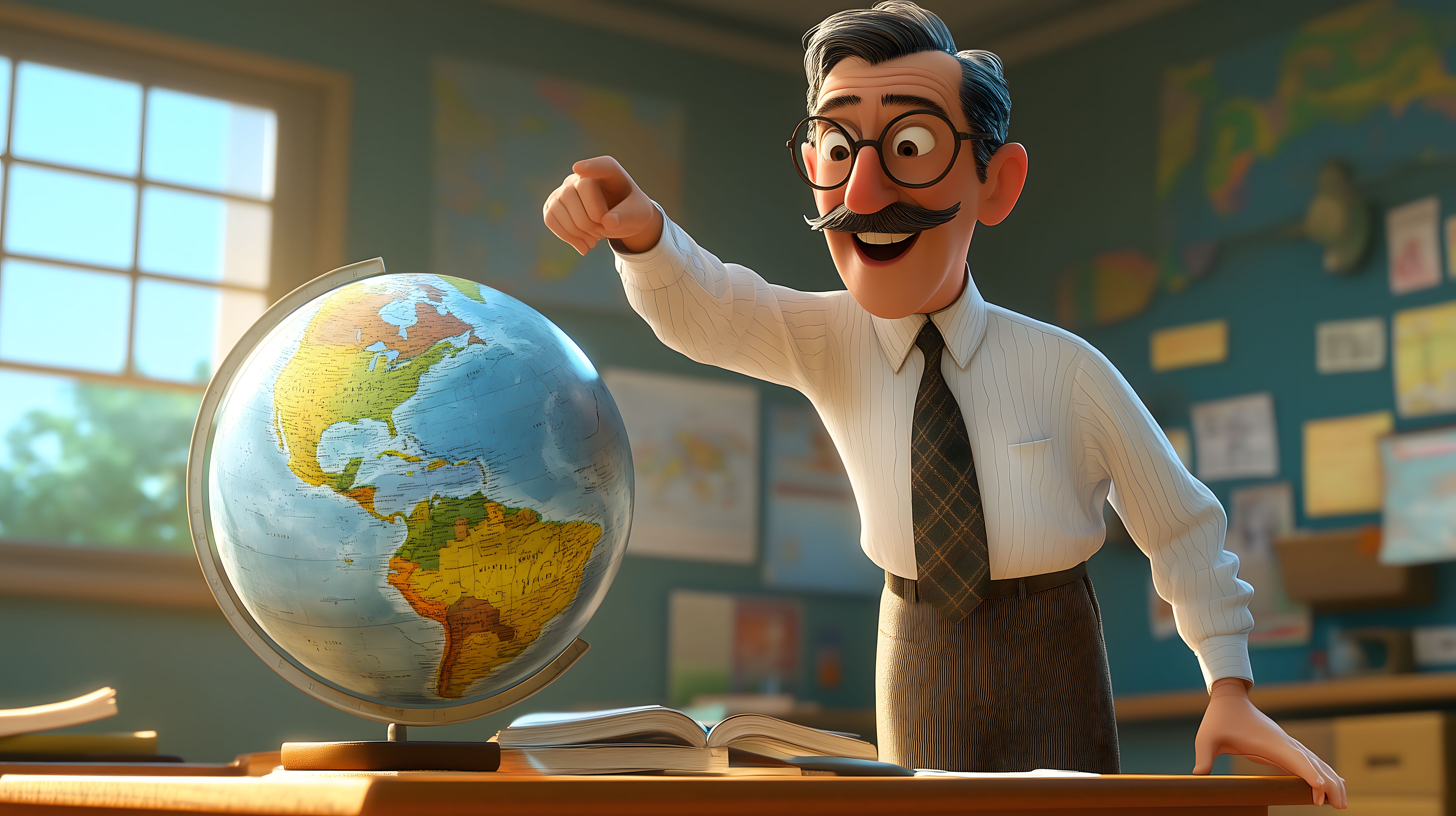 Das Bild zeigt einen fröhlich aussehenden Lehrer oder Geographieprofessor, der begeistert auf einen Globus zeigt. Er steht in einem Klassenzimmer voller Illustrationen, Lernmaterialien und Bücher, was auf seinen Enthusiasmus für Reisen und Geographie hindeutet. Mit seinem großen Lächeln, den Brillen und dem gepflegten Aussehen vermittelt er den Eindruck eines engagierten und kreativen Lehrers, der seine Schüler für Geographie und Weltentdeckung begeistern möchte. Dieses Stockfoto in hoher Auflösung eignet sich hervorragend für Bildungsbeiträge, Reiseblogbeiträge, Werbeanzeigen und Unterrichtsmaterialien, die Neugier und Freude am Lernen vermitteln wollen. Es steht unter einer Creative-Commons-Lizenz zur Verfügung.