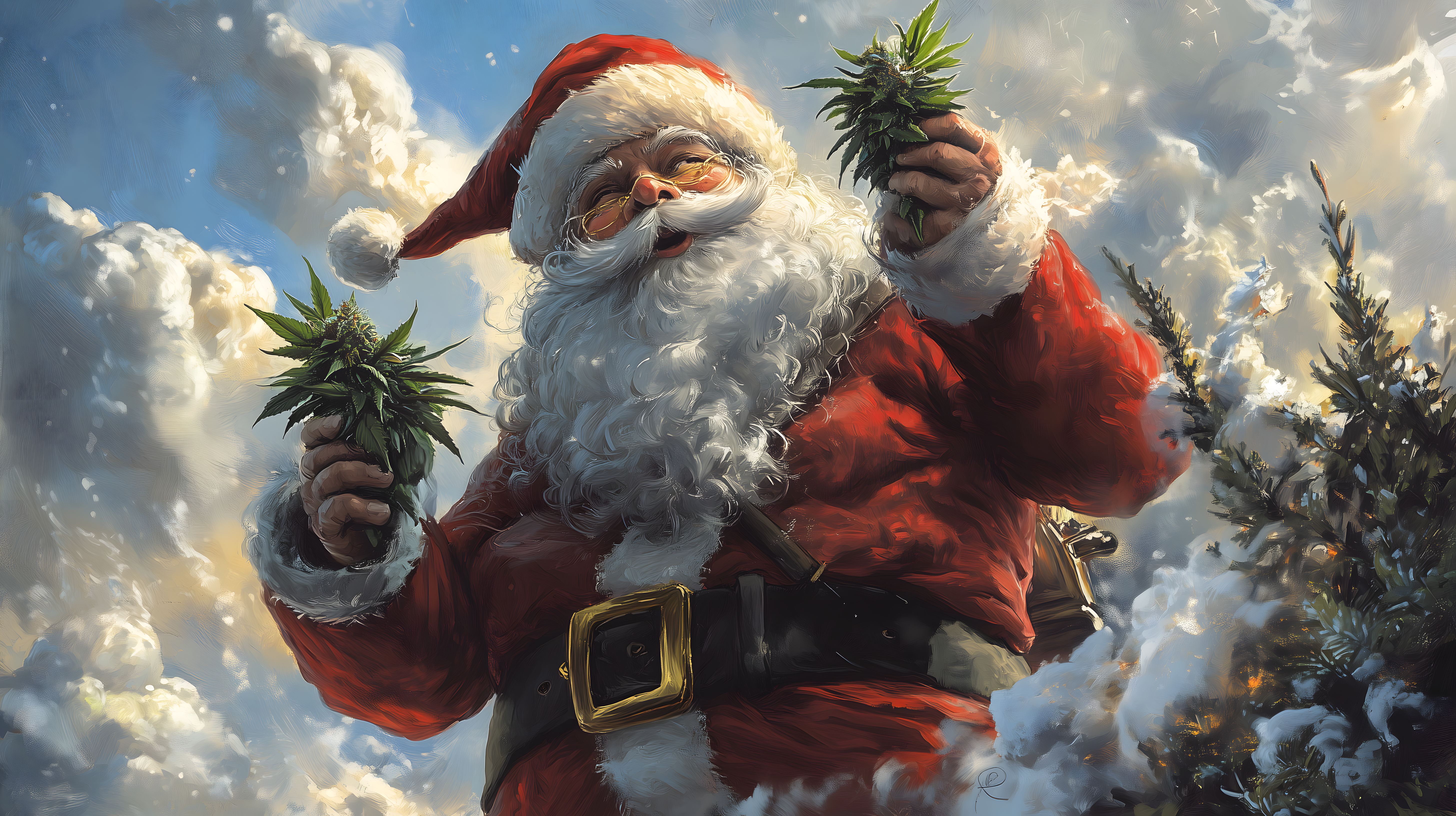 Dieses beeindruckende digitale Kunstwerk zeigt einen detaillierten Weihnachtsmann, der inmitten einer winterlichen Landschaft mit Hanfpflanzen in den Händen steht. Die Szene ist von einer stimmungsvollen, fast mystischen Stimmung umgeben, mit dramatischen Wolkenformationen und schneebedeckten Tannen und Fichten im Hintergrund. Das Bild versprüht eine Mischung aus Festtagsstimmung und Fantasy-Elementen, die es zu einer einzigartigen und auffallenden Darstellung des Weihnachtsmanns machen. Dieses hochauflösende Stockfoto eignet sich hervorragend für den Einsatz in Weihnachtsdekorationen, Blogbeiträgen, Newslettern oder Werbekampagnen und steht unter einer kostenlosen Creative-Commons-Lizenz zur Verfügung.