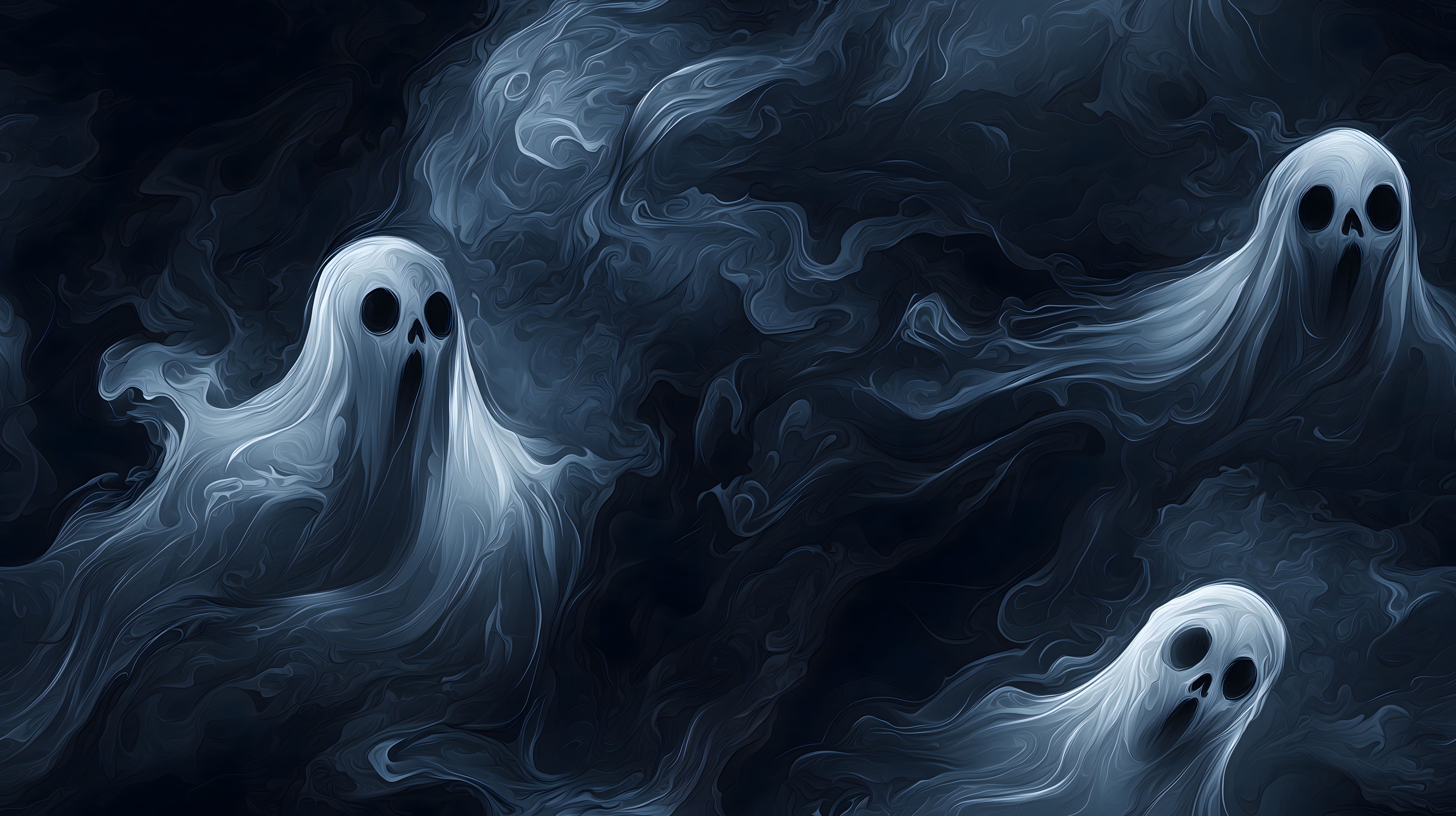 Das Bild zeigt eine düstere und mystische Szene mit schwebenden Geisterwesen in einer dunklen, nebelverhangenen Umgebung. Die transparenten, geisterartigen Formen schweben in verschiedenen Größen und Posen über einem schwarzen Hintergrund, der von einer nebligen, wirbelnden Textur durchzogen ist. Die Stimmung ist beängstigend und übernatürlich, was durch die Farbgebung in Grautönen und das spukhafte Erscheinungsbild der Gestalten verstärkt wird.