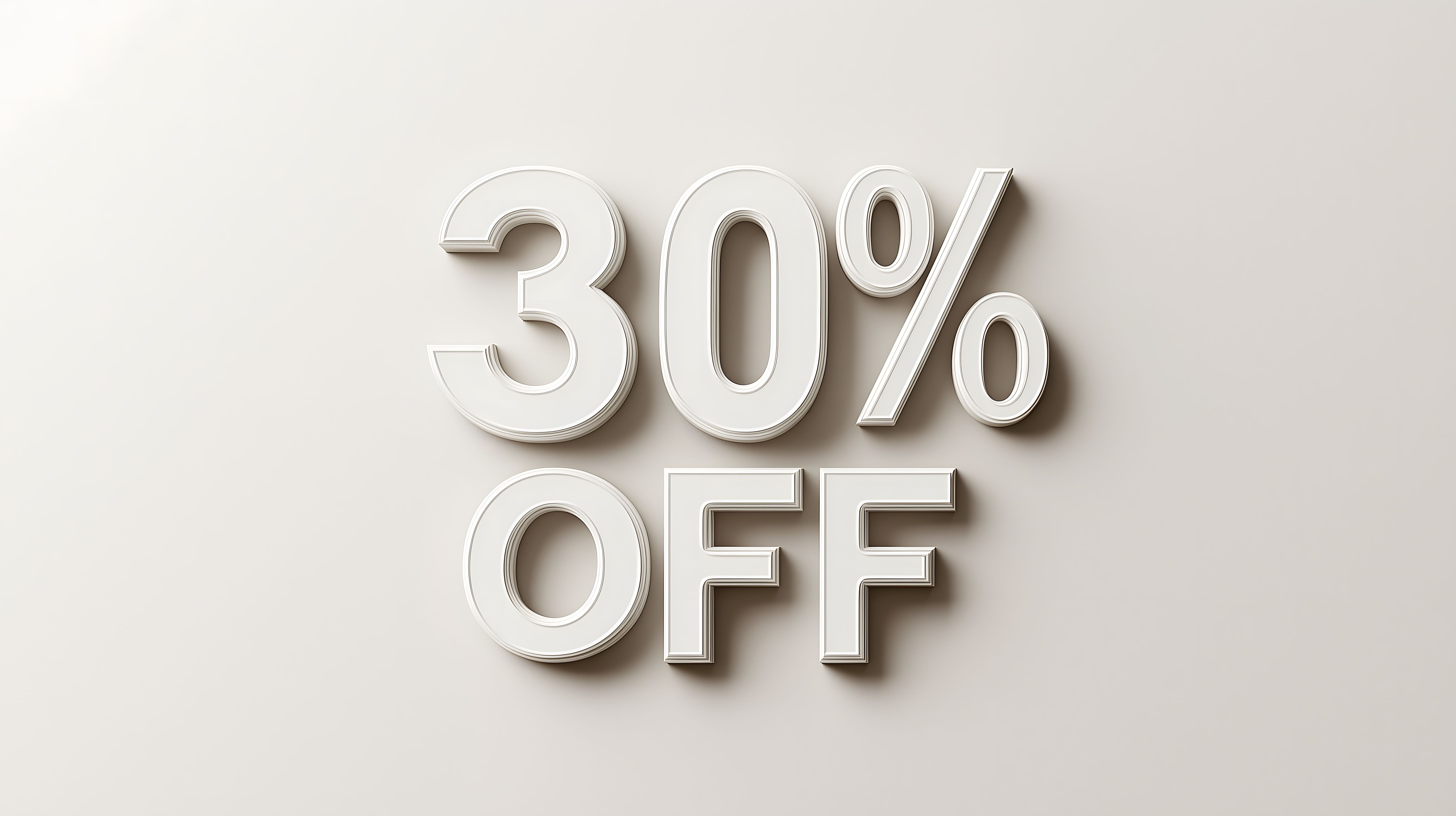 Dieses minimalistisch gestaltete Bild zeigt einen 30%-Rabatt-Verkauf auf hellem, grauem Hintergrund. Die großen, weißen Zahlen '30%' sowie das Wort 'OFF' sind die Hauptelemente des Designs und vermitteln das Verkaufsangebot auf eindrucksvolle Weise. Das Foto eignet sich hervorragend für den Einsatz in Werbematerial, Newslettern, Blogbeiträgen oder Social-Media-Kampagnen, um Kunden auf Sonderangebote und Rabatte aufmerksam zu machen. Das hochauflösende Stockfoto steht unter einer Creative-Commons-Lizenz zur freien Verwendung zur Verfügung.