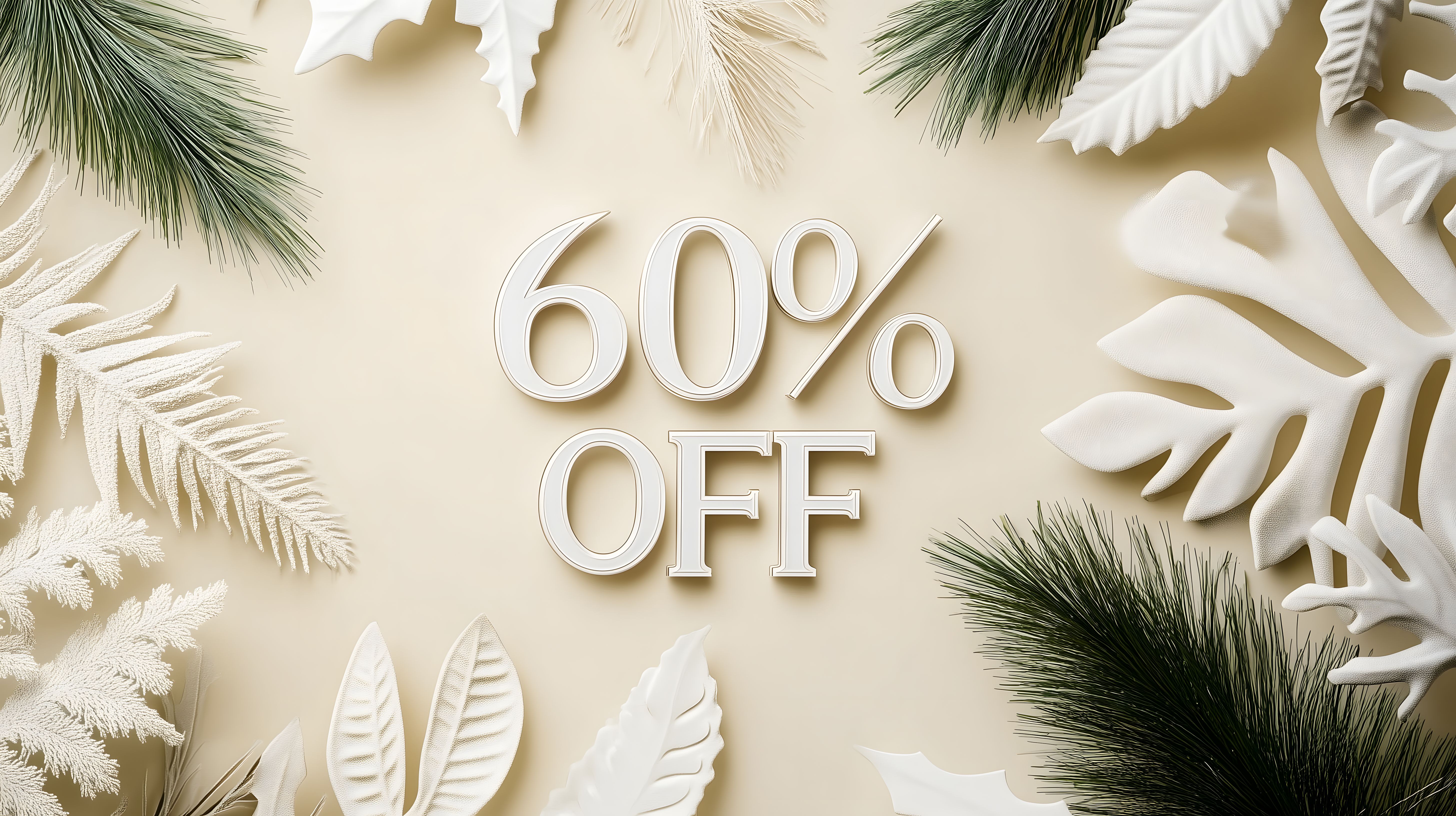 Dieses Foto zeigt eine dezente Rabattanzeige mit einem Anteil von 60% auf einem cremefarbenen Hintergrund. Die Zahlen sind in einem modernen, minimalistischen Stil gestaltet und werden von einer Anordnung natürlicher Elemente, wie Kiefernzweigen und Blattformen, eingerahmt. Diese Komposition verleiht der Anzeige einen eleganten, frischen und einladenden Charakter, der gut für Sommer-Werbung, Verkaufsaktionen oder Präsentationen in Blogs, Newslettern und sozialen Medien geeignet ist. Das hochauflösende Stockfoto steht unter einer Creative-Commons-Lizenz kostenlos zum Download bereit.