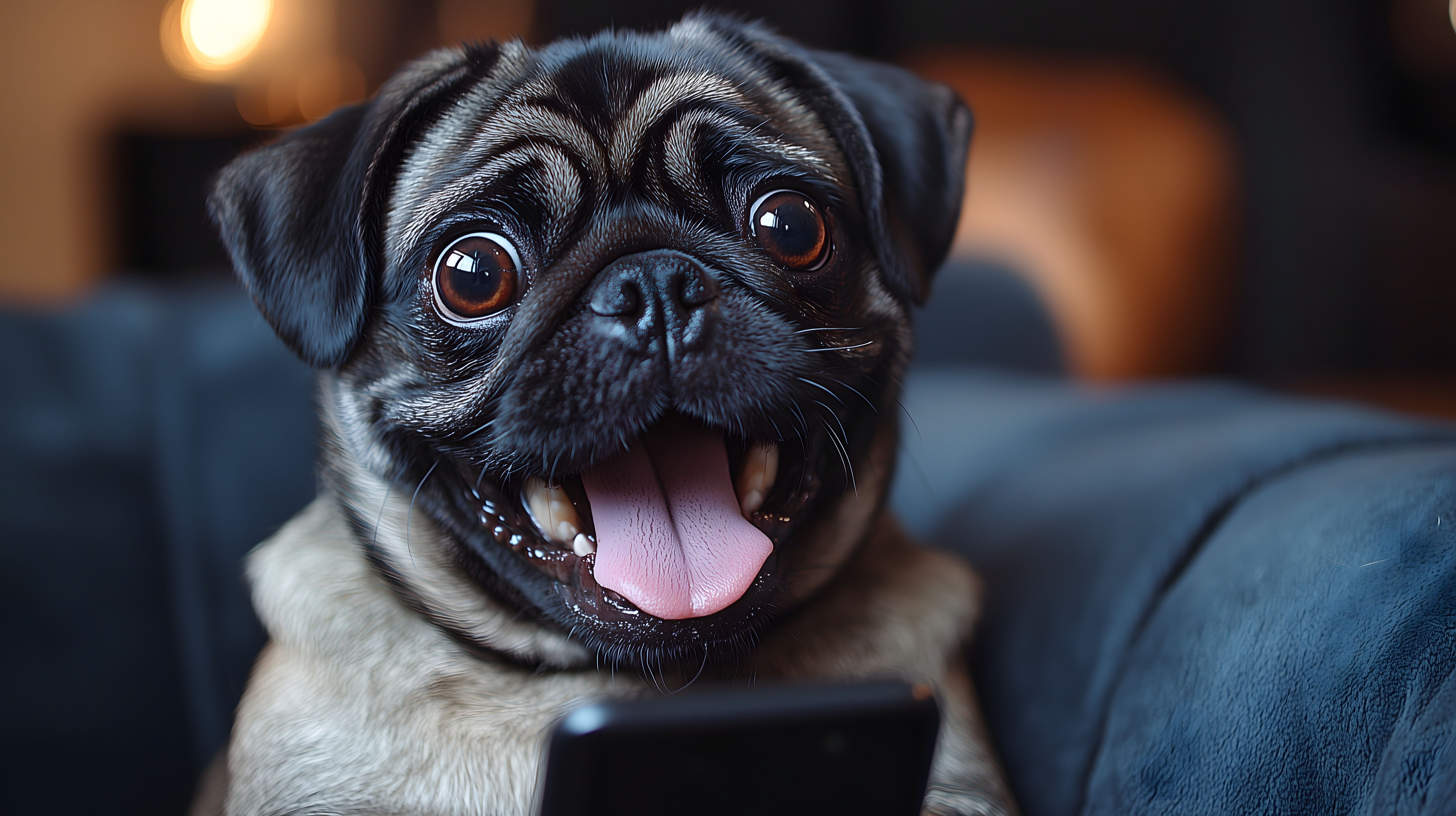 Das Bild zeigt einen schwarzen Mops, der fröhlich lächelnd auf einer blauen Couch sitzt und ein Smartphone in den Pfoten hält. Der Hund blickt direkt in die Kamera mit großen, ausdrucksstarken Augen und einem offenen, glücklichen Gesichtsausdruck. Das Bild ist in einem warmen, gedämpften Licht aufgenommen, wodurch der Mops besonders einladend und kuschelig wirkt. Dieses Stockfoto wäre perfekt für Blog-Beiträge, Newsletter-Designs oder Social-Media-Inhalte rund um Haustiere, Haustierfotografie oder lustige Tiermotive. Das hochauflösende Bild ist in hoher Qualität und unter einer Creative-Commons-Lizenz verfügbar.