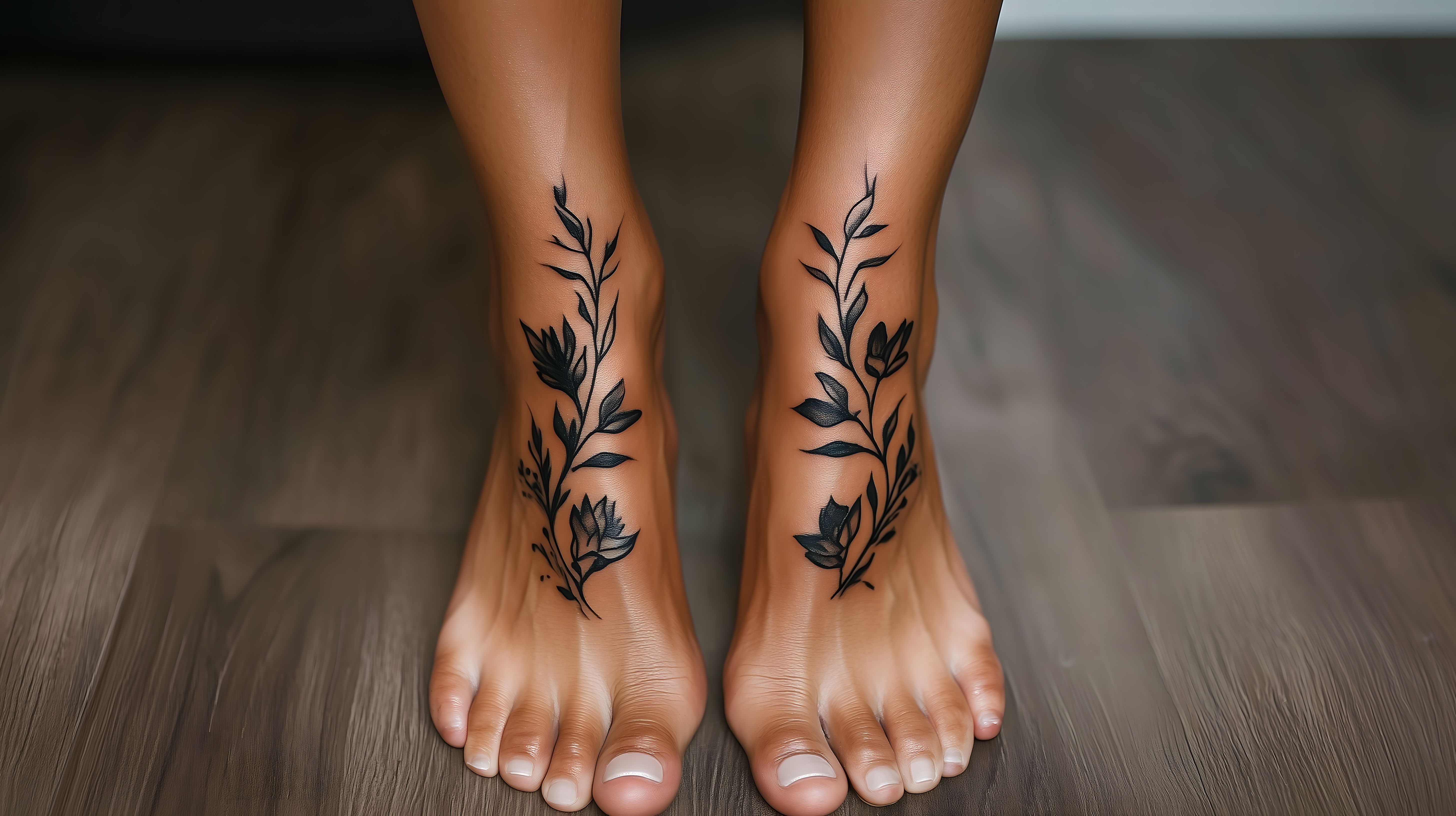 Dieses Stockfoto zeigt die Füße einer Frau, die mit einem eleganten, botanischen Blumentattoo-Design verziert sind. Die Tätowierungen erstrecken sich über die Fußrücken und Knöchel und verleihen dem Motiv einen natürlichen, organischen Look. Die Füße ruhen auf einem hölzernen Fußboden, was dem Bild eine rustikale, minimalistische Ästhetik verleiht. Das Foto bietet eine einzigartige, reduzierte Perspektive und eignet sich hervorragend als hochwertiges Stockfoto für vielfältige Einsatzzwecke - sei es in Blogs, Newslettern, auf Social-Media-Kanälen oder in der Werbung. Dieses kostenlose, hochauflösende Bild unter Creative-Commons-Lizenz lässt sich flexibel und rechtssicher in verschiedensten Kontexten nutzen.