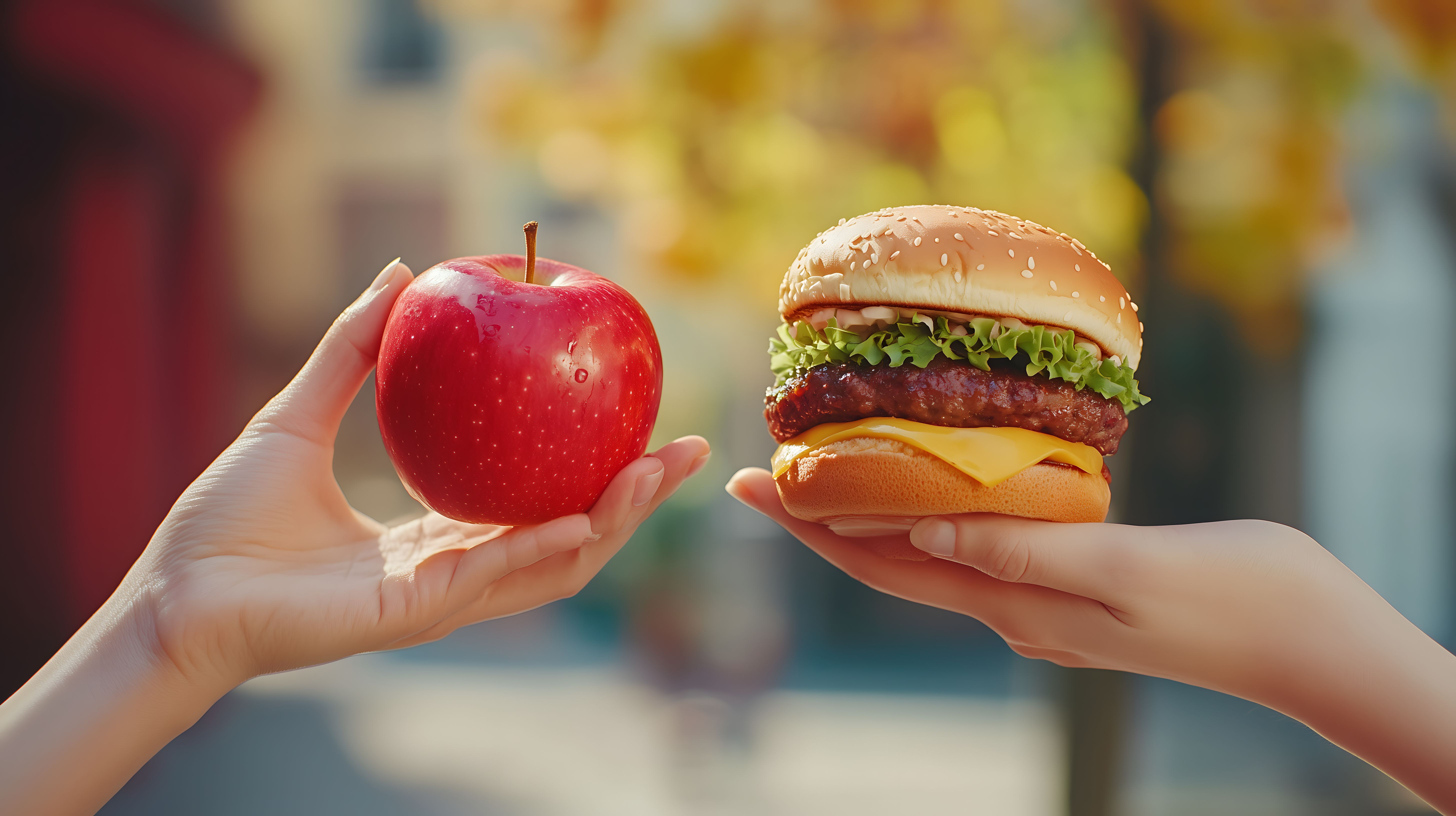 Dieses Foto zeigt einen direkten Kontrast zwischen gesunden und ungesunden Lebensmitteln. Auf der einen Seite ein saftiger, roter Apfel, in der Hand gehalten, auf der anderen Seite ein appetitlich aussehender Hamburger. Diese Gegenüberstellung illustriert die Entscheidung zwischen naturbelassener, frischer Ernährung und Fast Food. Das Bild ist perfekt für Beiträge zum Thema Gesundheit, Lebensstil und Ernährungsbewusstsein, sei es in Blogs, Newslettern oder auf Social-Media-Kanälen. Als hochwertiges Stockfoto in Creative-Commons-Lizenz kann es kostenlos und in hoher Auflösung genutzt werden.