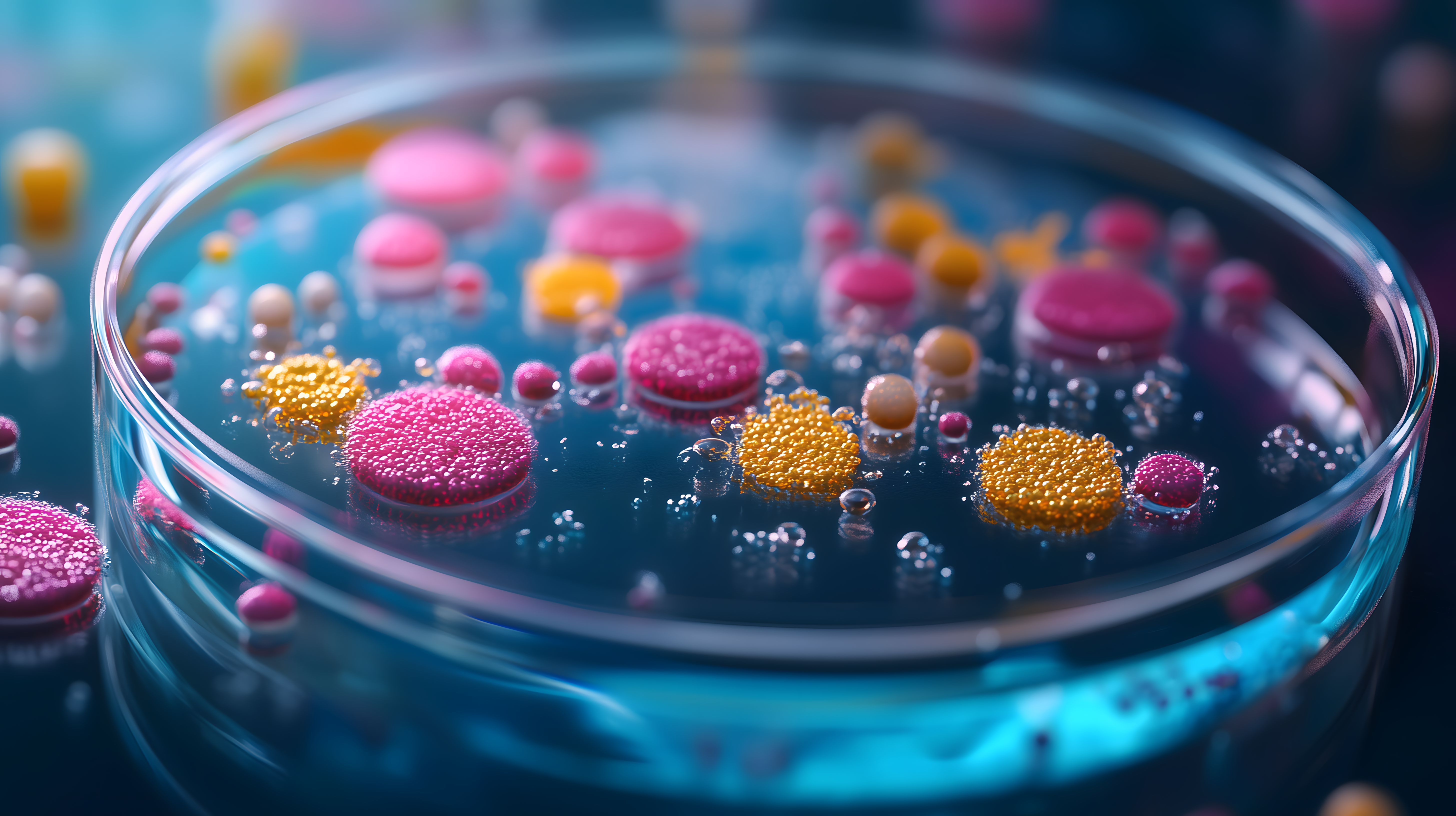 Dieses faszinierende Mikroskopbild zeigt bunte Bakterienkolonien in einer Petrischale. Die Nahaufnahme lässt eine faszinierende, abstrakte Textur mit leuchtenden Farbtönen wie Pink, Gelb und Blau erkennen. Das Bild vermittelt einen Eindruck von der Komplexität und Vielfalt mikroskopischer Lebewesen und ihrer Strukturen. Es eignet sich hervorragend als Hintergrund oder Designelement für Blogs, Newsletter, Social-Media-Posts und Werbekampagnen rund um Themen wie Wissenschaft, Forschung, Biologie oder Mikroskopie. Dieses hochauflösende, kostenlose Stockfoto unter Creative-Commons-Lizenz kann vielfältig eingesetzt werden.