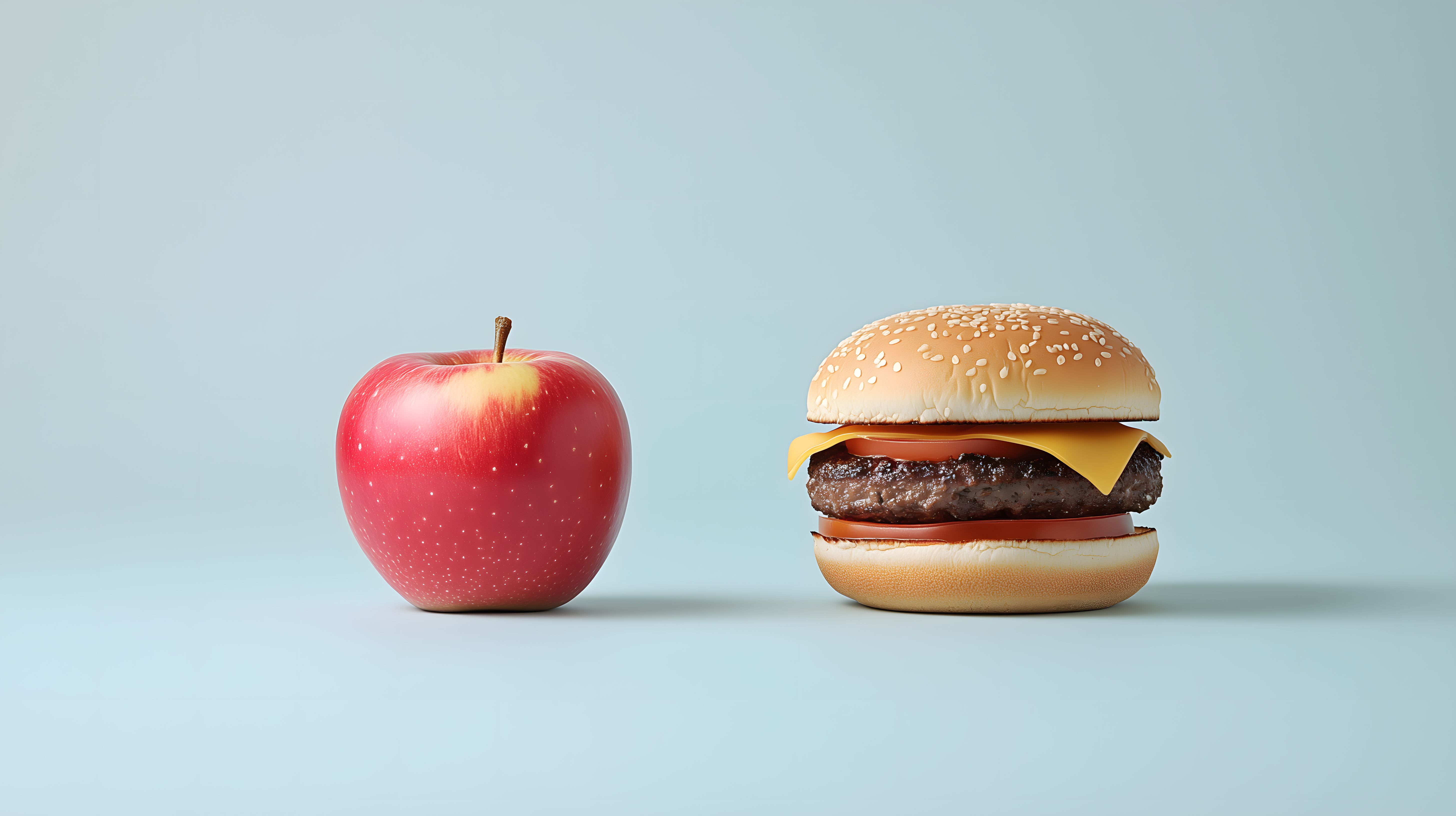 Das Bild zeigt einen Vergleich zwischen einem roten Apfel und einem klassischen Hamburger vor einem minimalistischen hellblauen Hintergrund. Der Kontrast zwischen dem natürlichen, gesunden Obst und dem ungesunden Fast-Food-Gericht ist auffallend. Die Fotografie hat eine klare, reduzierte Komposition, die den Fokus auf die beiden Objekte lenkt. Dieses Stockfoto eignet sich hervorragend für Beiträge zu Themen wie Ernährung, Gesundheit, Lebensstil oder auch Marketingkonzepte, die den Vergleich zwischen gesunden und ungesunden Alternativen aufgreifen. Das hochauflösende Bild steht unter einer Creative-Commons-Lizenz zur kostenlosen Verwendung zur Verfügung.