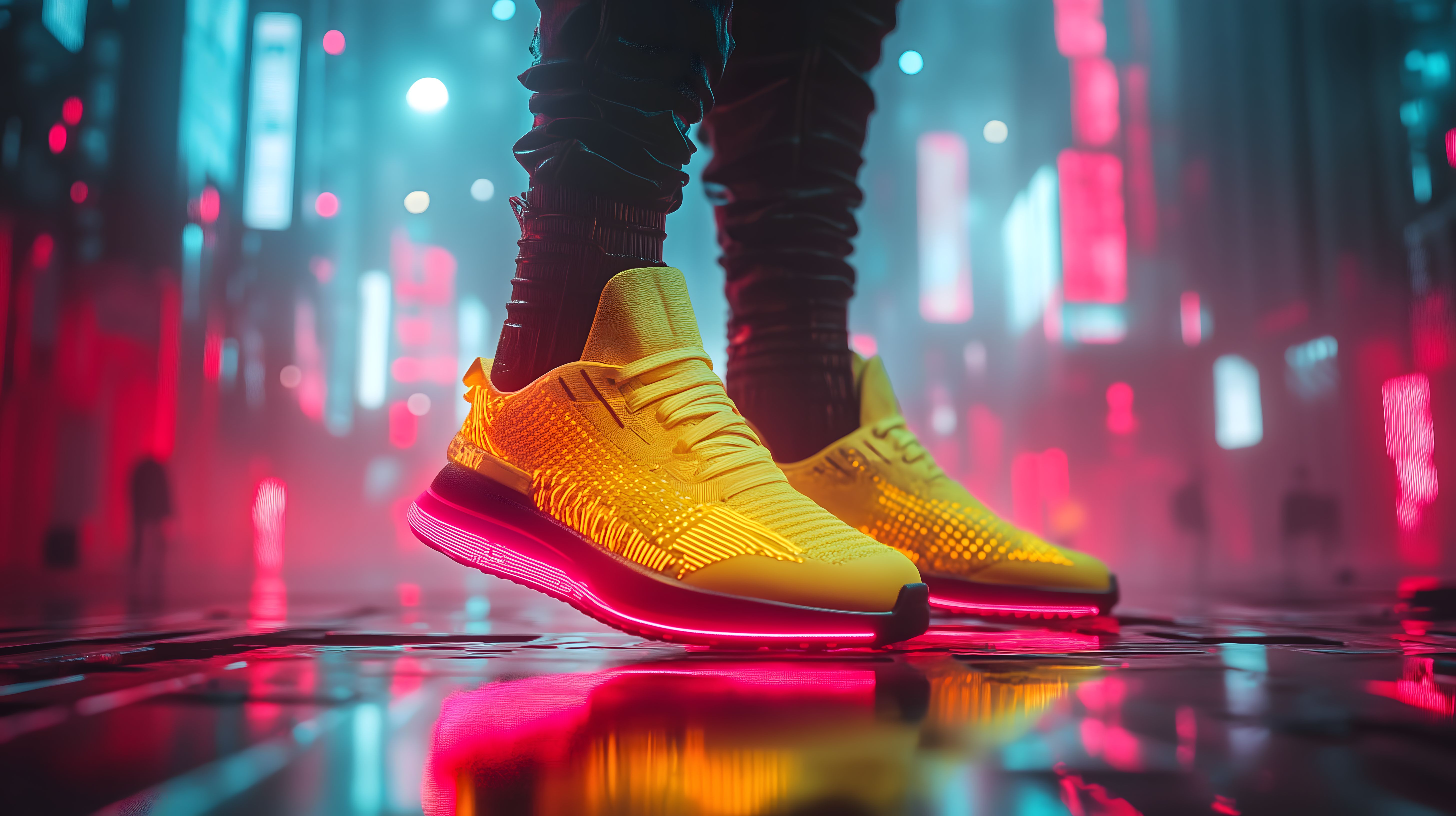 Neonleuchtender Sneaker in futuristischer Stadtlandschaft von Marco Verch unter Creative Commons 2.0