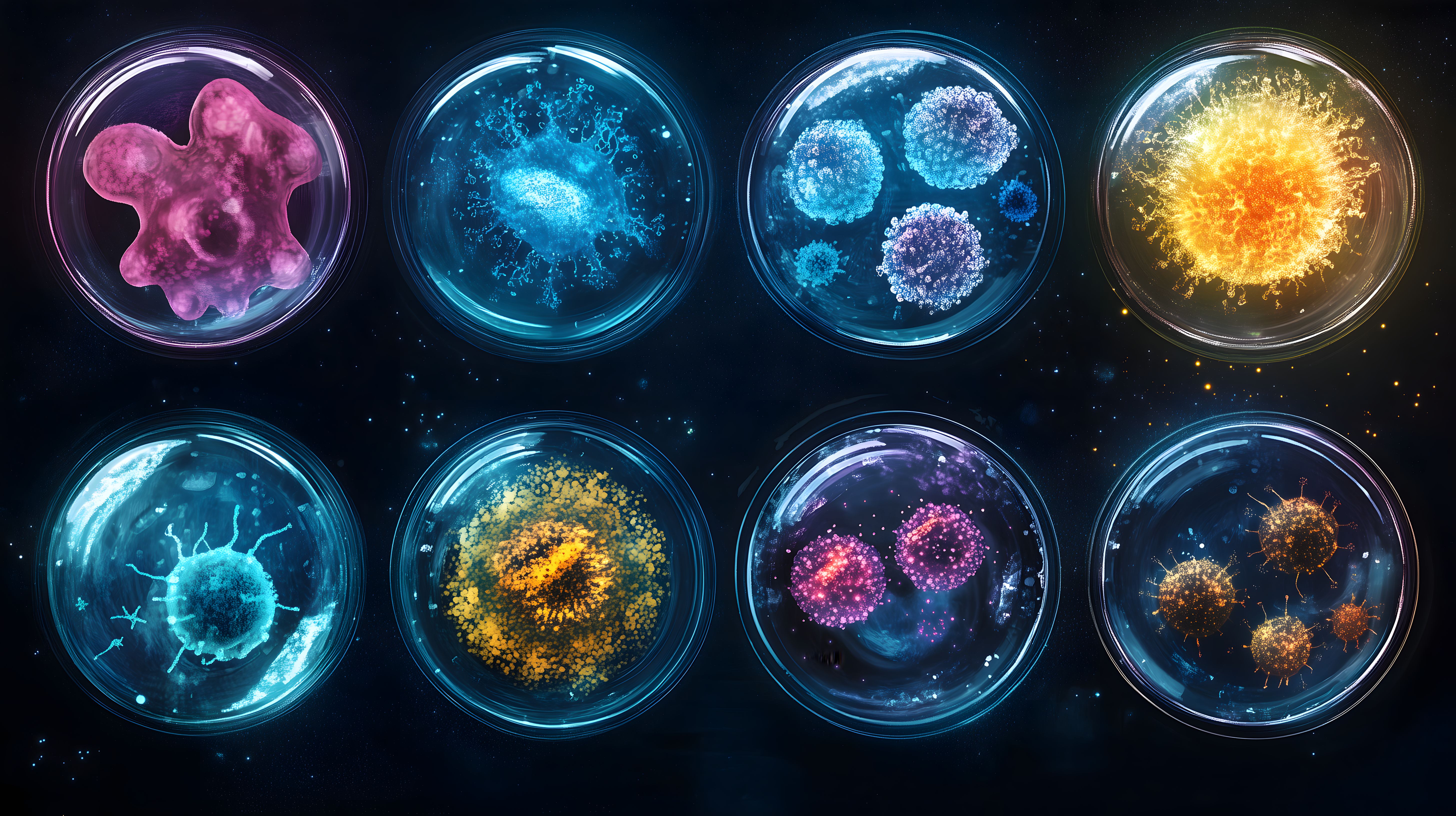 Dieses Bild zeigt eine Reihe von Petrischalen, in denen unterschiedliche, farbige Bakterien-Kolonien zu sehen sind. Die Schalen sind vor einem dunklen Hintergrund angeordnet, wodurch die leuchtenden Farben besonders hervorgehoben werden. Die Bakterien-Kolonien variieren in Form und Farbe - von rosa bis hin zu leuchtend blau und gelb. Dieses Stockfoto eignet sich hervorragend als Hintergrund oder grafisches Element für Blogbeiträge, Newsletter und Social-Media-Veröffentlichungen im Bereich Wissenschaft, Medizin oder Biologie. Das hochauflösende Bild steht unter einer Creative-Commons-Lizenz zur kostenfreien Verwendung zur Verfügung.