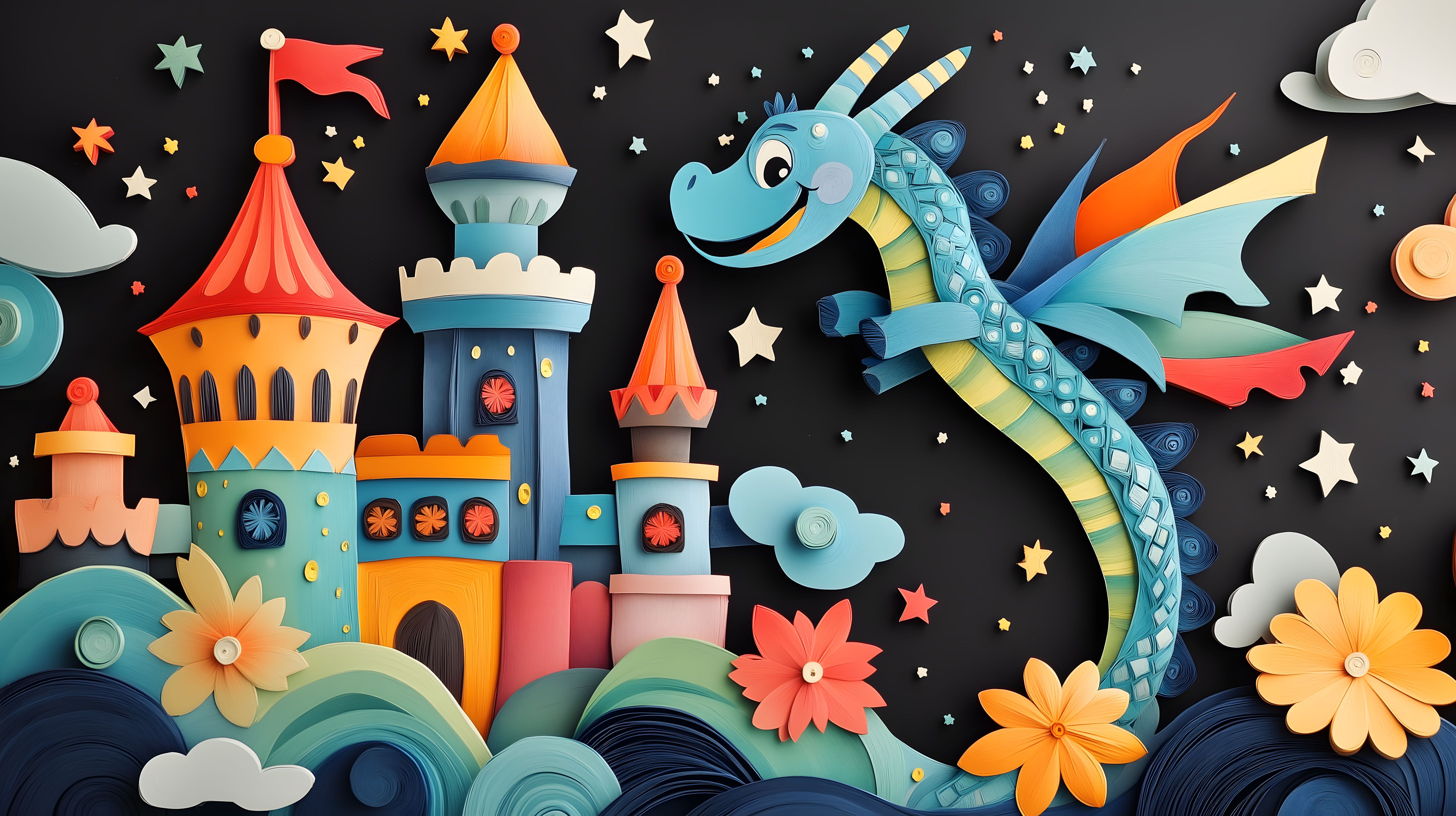 Diese fantasievolle Papercut-Illustration zeigt eine märchenhafte Szene mit einem freundlichen Drachen, der an einem farbenfrohen Schloss in der Nacht vorbeifliegst. Im Hintergrund sind Sterne, Wolken und bunte Blumen zu sehen, die der Szene eine verspielt-dekorative Note verleihen. Die kreativen Papierschnitte in verschiedenen Blautönen, Rottönen und Gelbtönen schaffen eine einzigartige, handgemachte Optik, die sich perfekt für den Einsatz in Blogs, Newslettern, Social-Media-Beiträgen oder Werbematerialien eignet. Dieses hochauflösende, kostenlose Stockfoto unter Creative-Commons-Lizenz bietet Ihnen die Möglichkeit, Ihre Inhalte mit einer fantasievollen, farbenfrohen Illustration aufzuwerten.