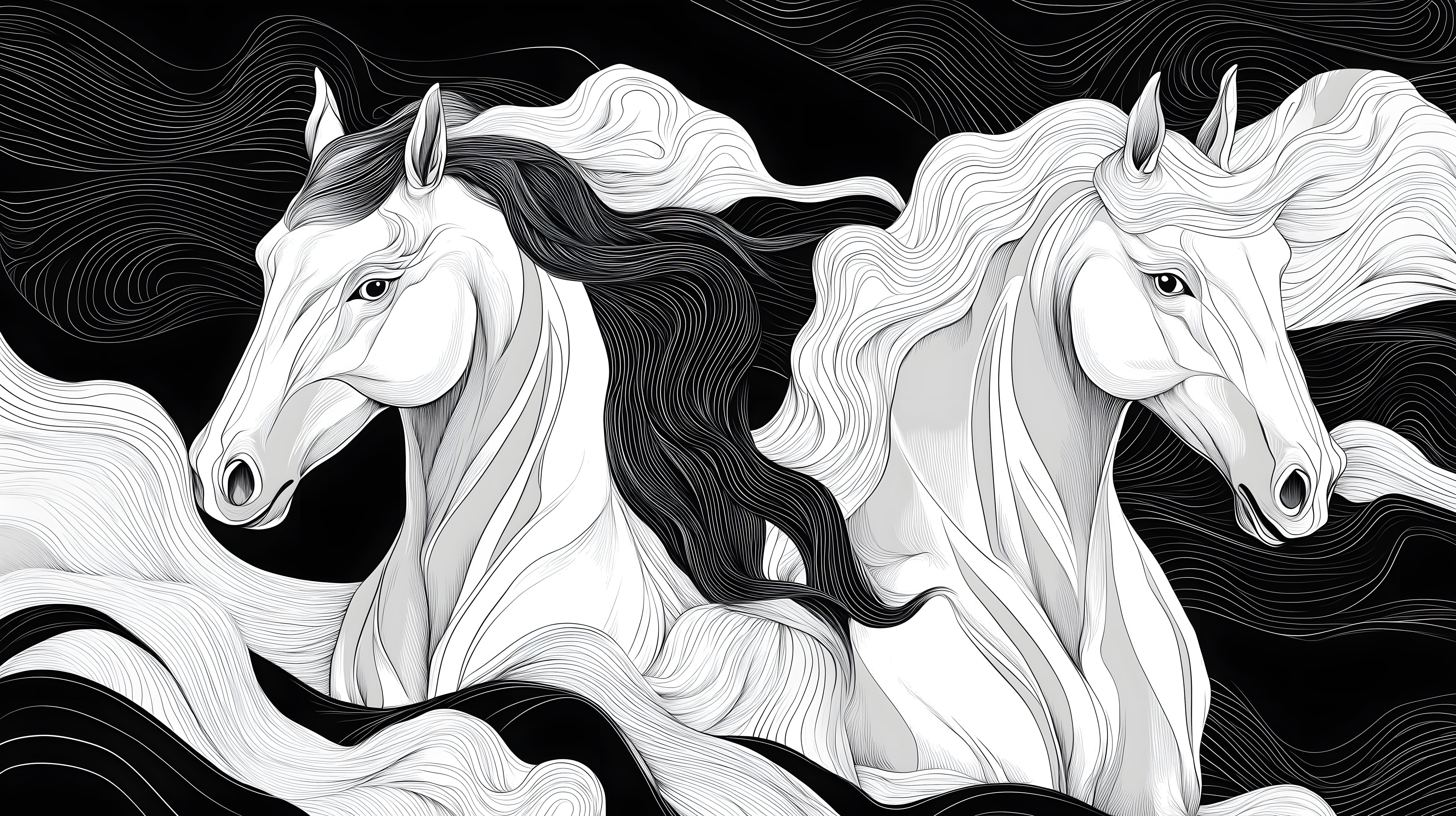 Dieses eindrucksvolle Wandbild zeigt zwei majestätische Pferde in einem dynamischen Linoldruck-Stil. Die schwarz-weiße Farbgebung und die fließenden, abstrakten Linien verleihen der Szene eine elegante, grafische Ästhetik. Die Pferde wirken in ihrer Bewegung lebendig und kraftvoll, während der reduzierte Hintergrund den Fokus ganz auf die Tiere lenkt. Dieses Motiv bietet sich hervorragend als Wanddekoration in modernen Wohnräumen, Büros oder Geschäften an und kann auch für Werbe- und Marketingzwecke, etwa in Blogs, Newslettern oder sozialen Medien, eingesetzt werden. Das hochauflösende Stockfoto ist kostenfrei und unter einer Creative-Commons-Lizenz verfügbar.