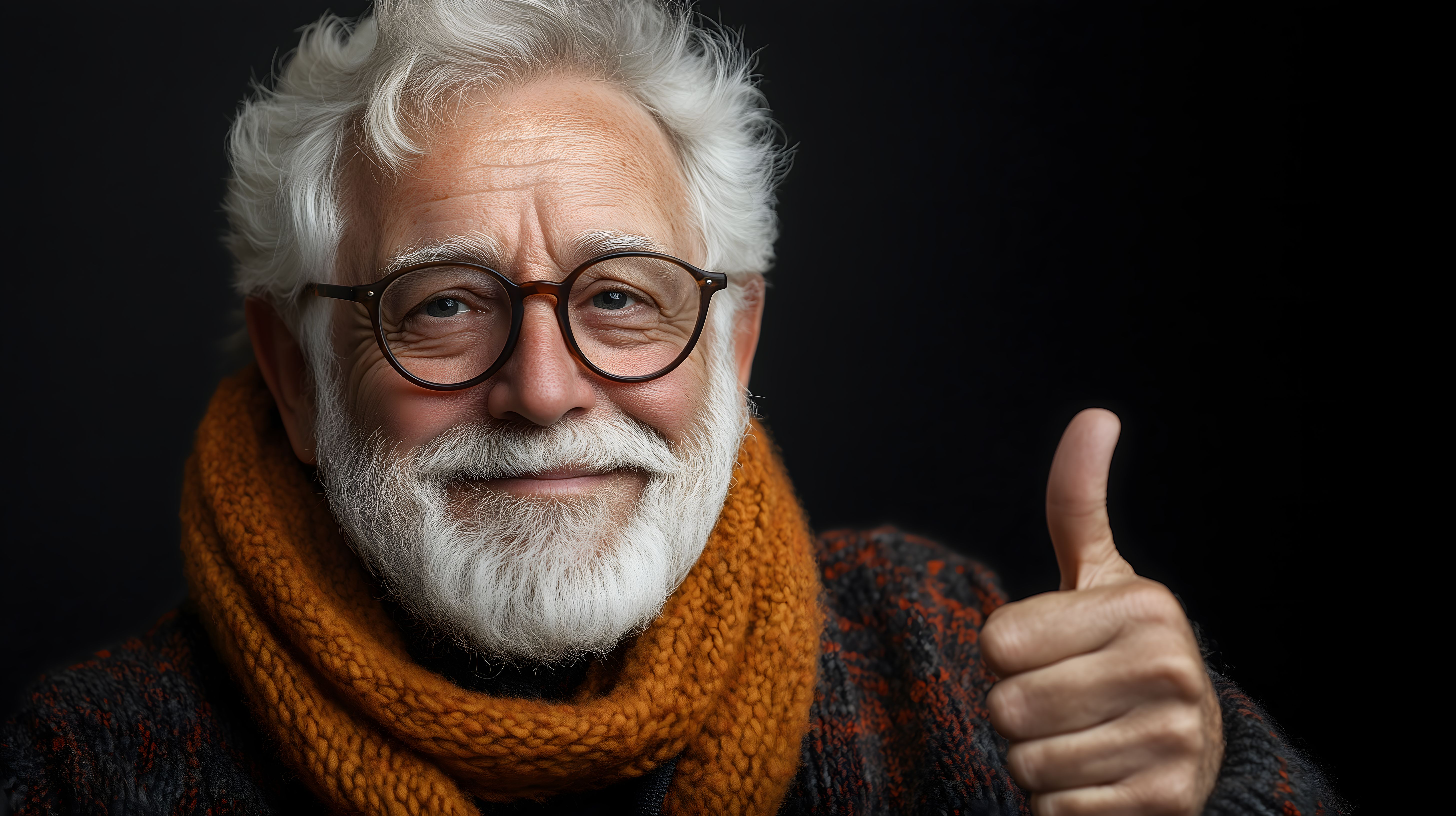 Dieses Porträt zeigt einen fröhlichen, älteren Mann mit weißem Bart und Brille, der lächelnd in die Kamera blickt und seinen Daumen nach oben hebt. Der dunkle Hintergrund lenkt den Fokus ganz auf das Gesicht des Mannes, dessen Ausdruck Zufriedenheit, Dankbarkeit und Selbstvertrauen ausstrahlt. Die warmen Farbtöne seines Pullovers und Schals verleihen dem Bild eine gemütliche, einladende Atmosphäre. Dieses hochauflösende Stockfoto eignet sich ideal für die Verwendung in Blogbeiträgen, Newslettern, Social-Media-Kanälen oder Werbematerialien, bei denen ein authentisches, positives Menschenbild vermittelt werden soll. Es steht unter einer kostenlosen Creative-Commons-Lizenz zur Verfügung.