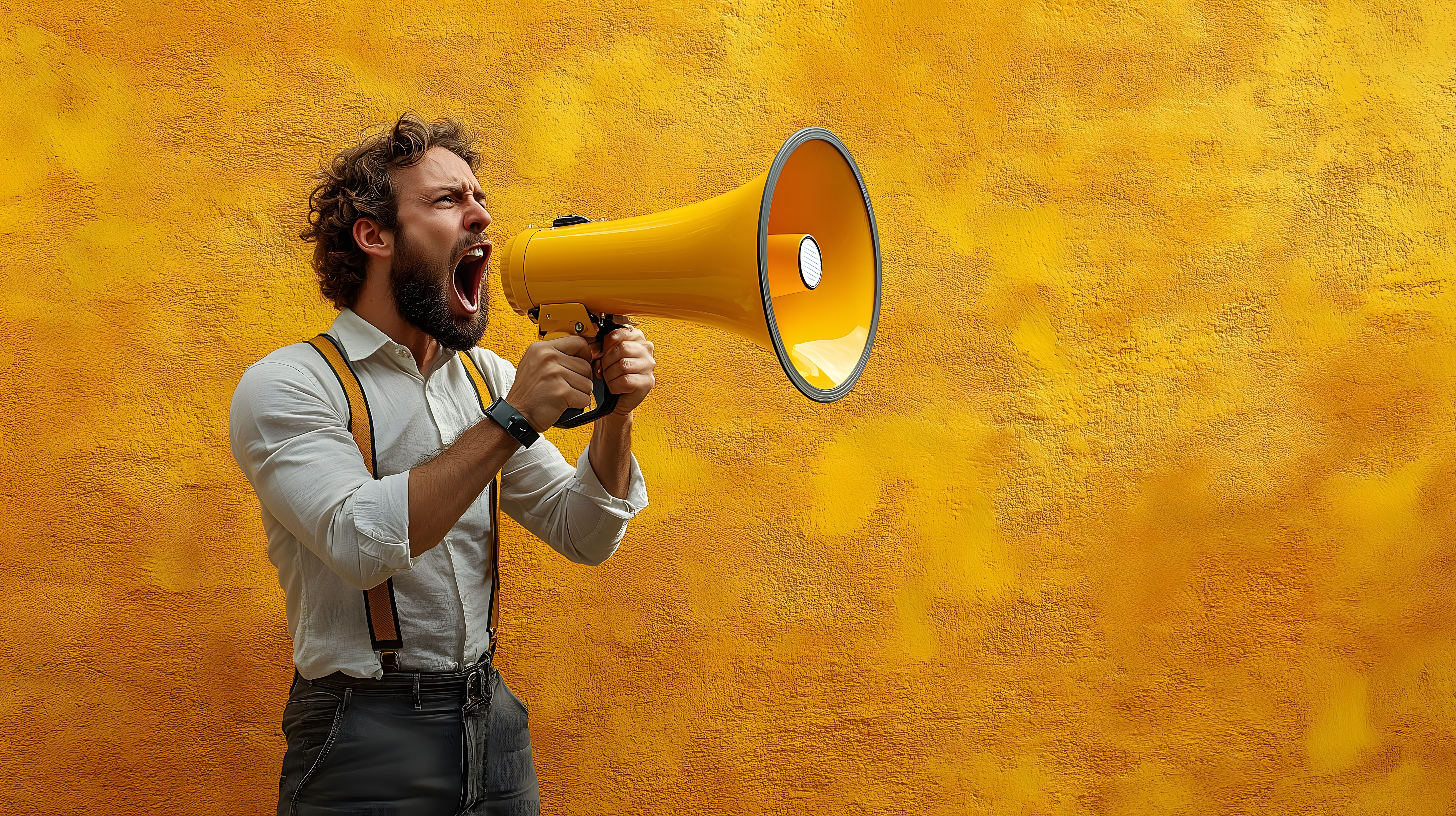 Das Foto zeigt einen Geschäftsmann, der einen gelben Megaphon in die Luft hält und lautstark etwas zu rufen scheint. Der Mann hat einen Bart und trägt eine graue Jacke mit Hosenträgern. Der Hintergrund ist einfarbig in einem kräftigen Gelborange, was dem Bild eine vintage-artige Atmosphäre verleiht.