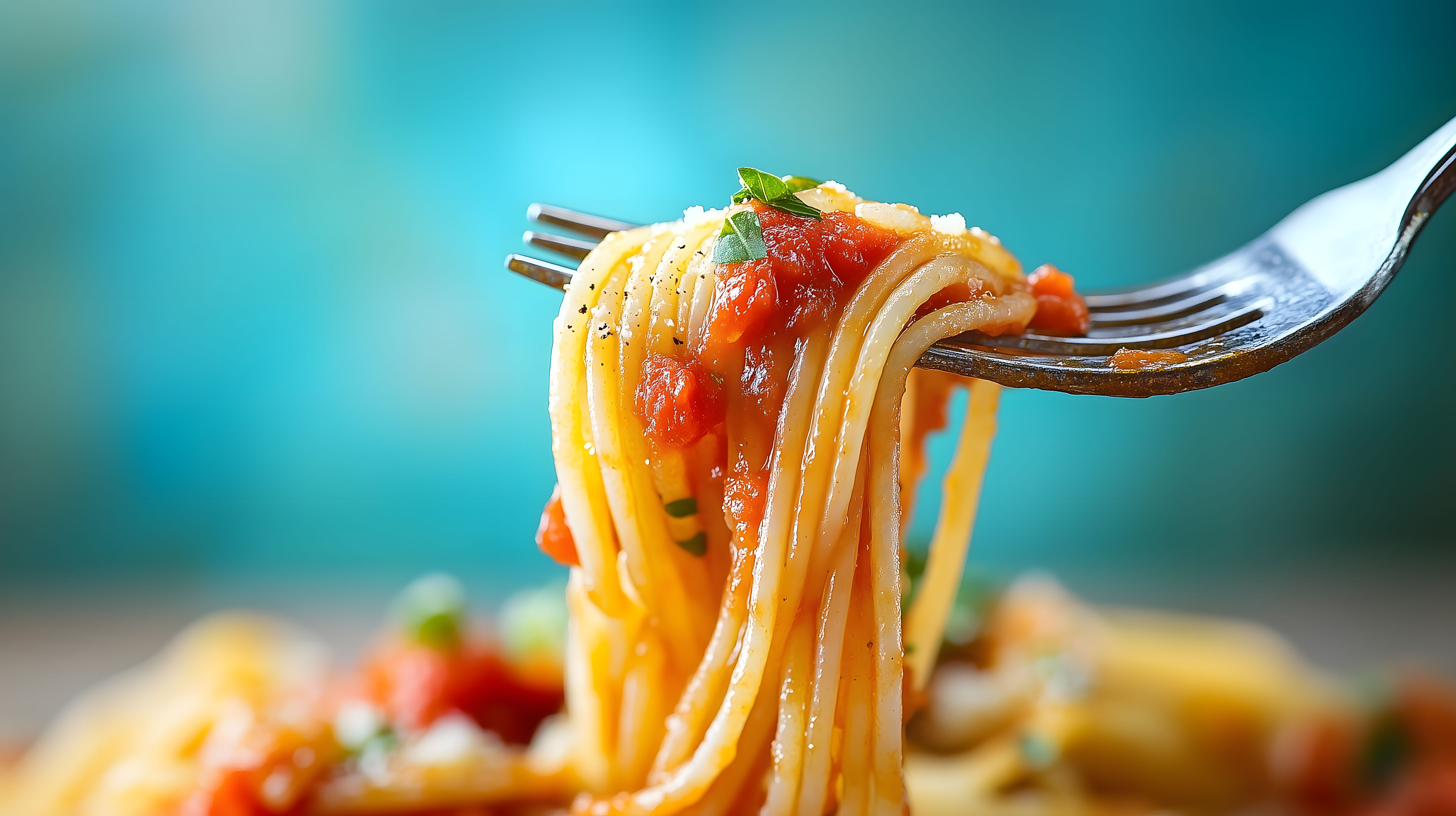 Das Bild zeigt ein köstliches Gericht aus italienischen Spaghetti, die mit einer frischen Tomatensoße serviert werden. Die Nudeln sind auf einer Gabel aufgespießt und lassen den leckeren Geschmack erahnen. Die Soße, die mit grünen Kräuterblättern garniert ist, verleiht dem Gericht eine appetitliche, rustikale Optik. Das Foto ist in einer warmen Farbgebung aufgenommen, was eine einladende und gemütliche Stimmung schafft. Dieses Bild eignet sich hervorragend für den Einsatz in Rezepten, Blogs zum Thema italienische Küche, aber auch für Werbezwecke in der Gastronomie oder für den Verkauf von hochauflösenden Stockfotos unter einer Creative-Commons-Lizenz.