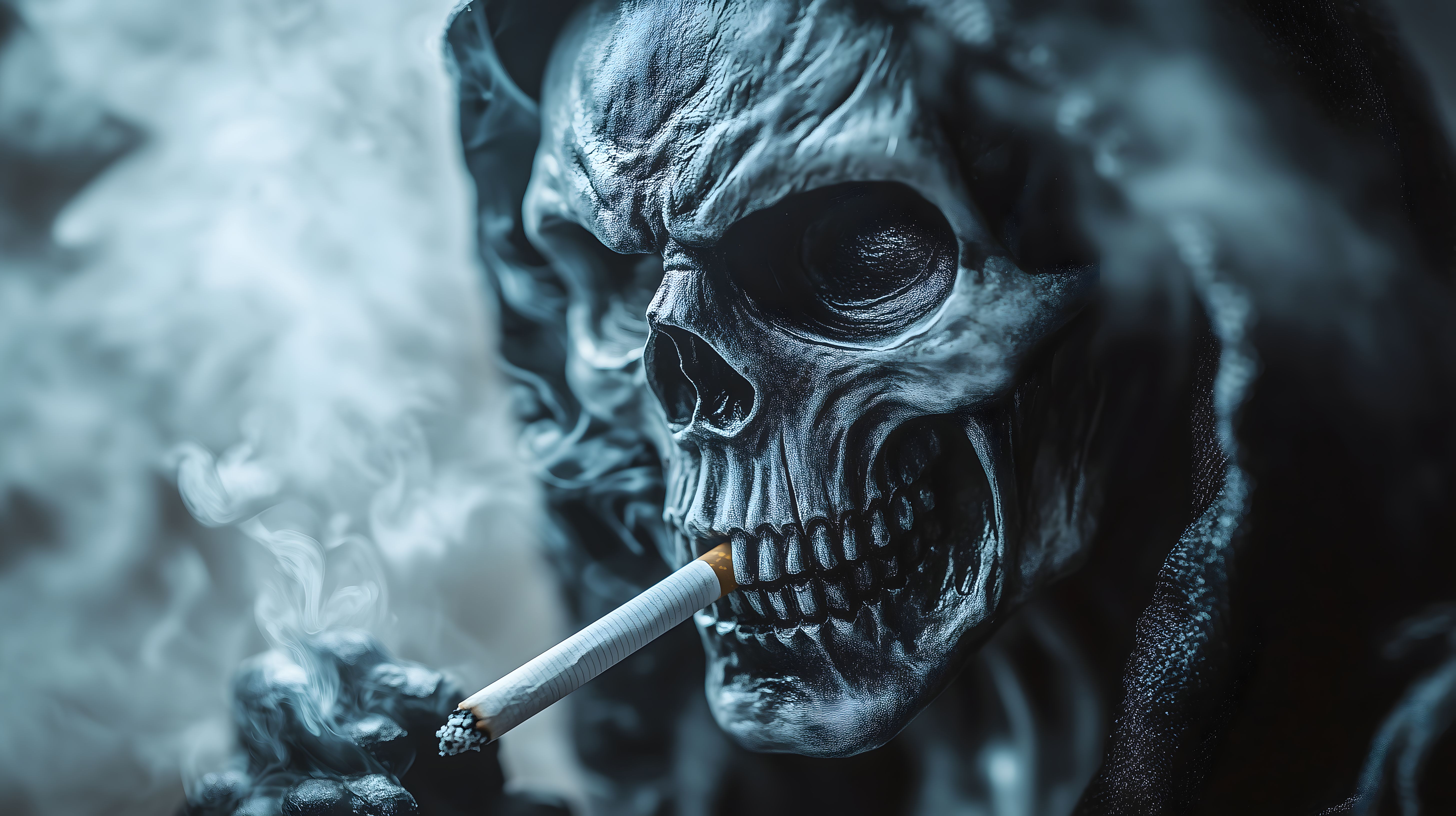 Das Bild zeigt ein Skelett, das eine Zigarette raucht. Es steht symbolisch für die Gefahren und Gesundheitsrisiken des Rauchens. Die düstere, schwarz-weiße Darstellung und der erschreckende, skelettartige Kopf sollen eine bedrohliche und warnende Stimmung vermitteln. Das Foto kann als eindringlicher Warnhinweis für Präventionskampagnen, in Gesundheitsberichten oder als emotionales Hintergrundbild in Social-Media-Postings zum Thema Rauchen und Suchtprävention eingesetzt werden. Dieses hochauflösende und kostenpflichtig nutzbare Stockfoto ist unter einer Creative-Commons-Lizenz verfügbar.