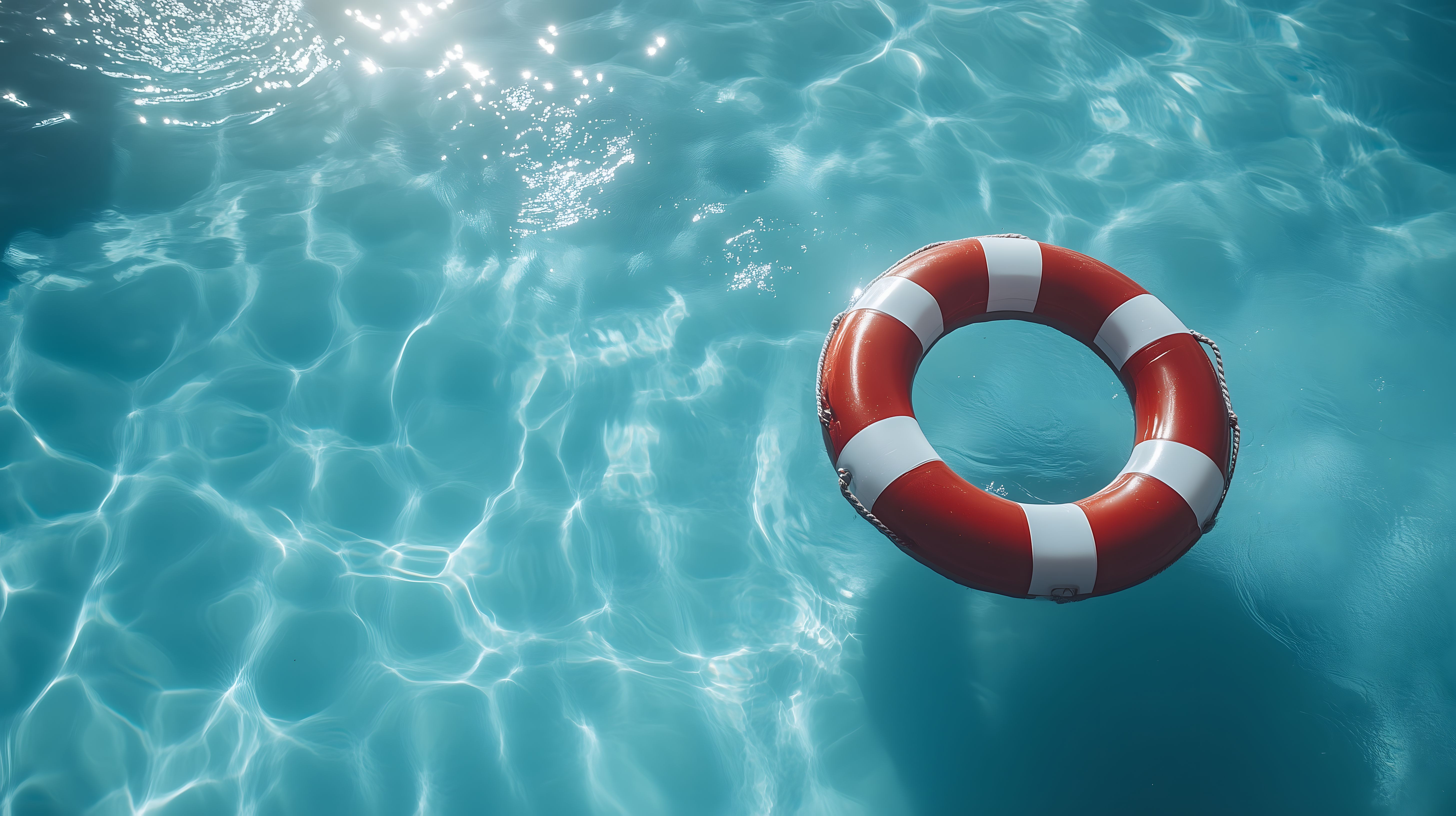Das Bild zeigt einen roten Rettungsring, der auf der Oberfläche eines türkisfarbenen Gewässers schwimmt. Das Wasser ist von Wellenmuster und Lichtreflexionen geprägt, was dem Bild eine frische, erholsame Atmosphäre verleiht. Der Rettungsring symbolisiert Sicherheit und Schutz inmitten der natürlichen Schönheit.