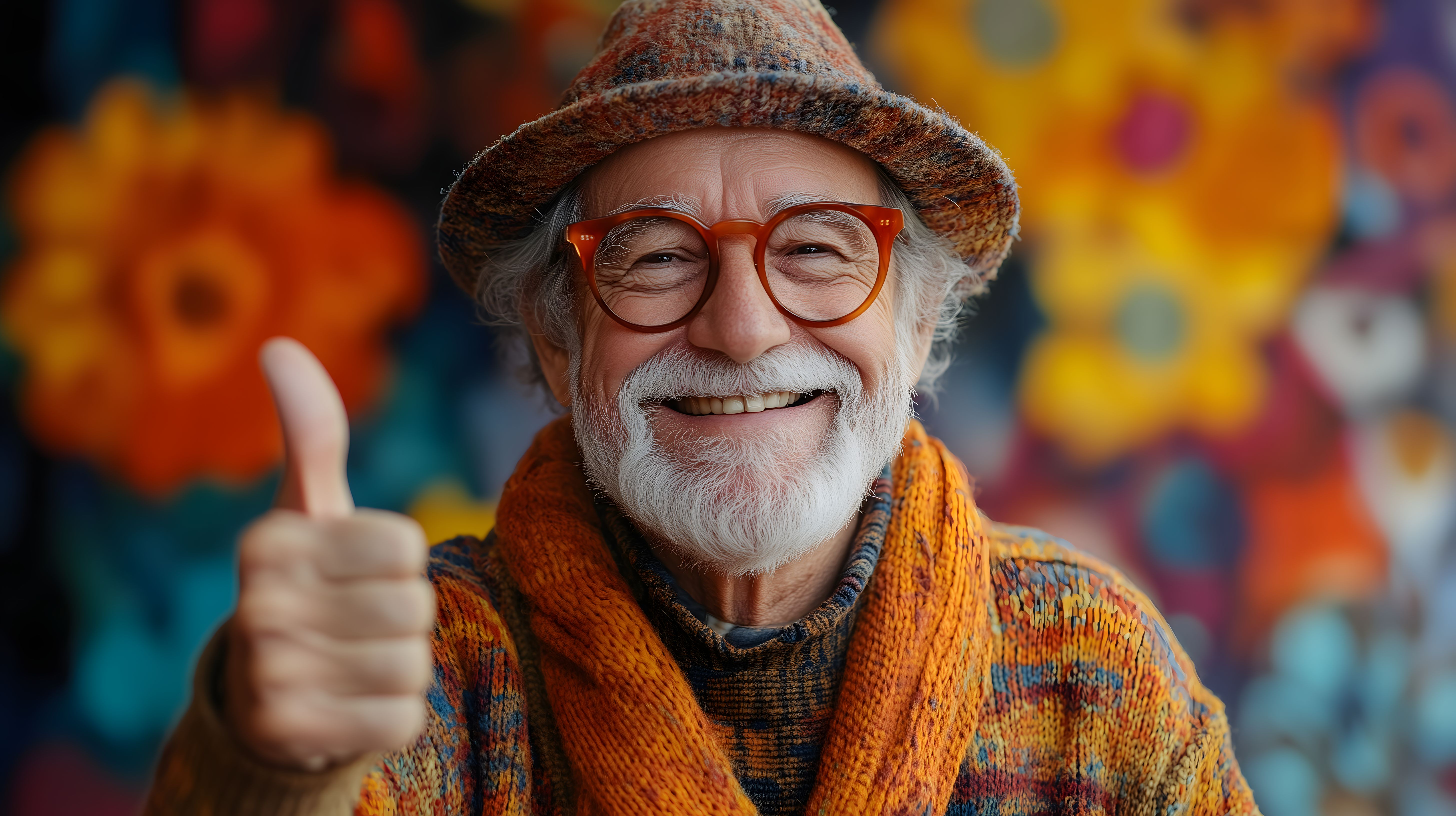 Das Bild zeigt einen älteren Mann mit freundlichem Lächeln und Daumen hoch. Er trägt eine Strickmütze, eine auffällig gemusterte Strickjacke und eine Brille mit runden Gläsern. Der Hintergrund ist verschwommen und farbig. Das Foto vermittelt eine positive, lebendige Stimmung und könnte für Werbung, Social-Media-Beiträge oder Illustrationen in Artikeln zum Thema Rentnerdasein, Lebensfreude oder Altersaktivität eingesetzt werden. Das hochwertige Stockfoto ist in hoher Auflösung und unter Creative-Commons-Lizenz frei verfügbar.