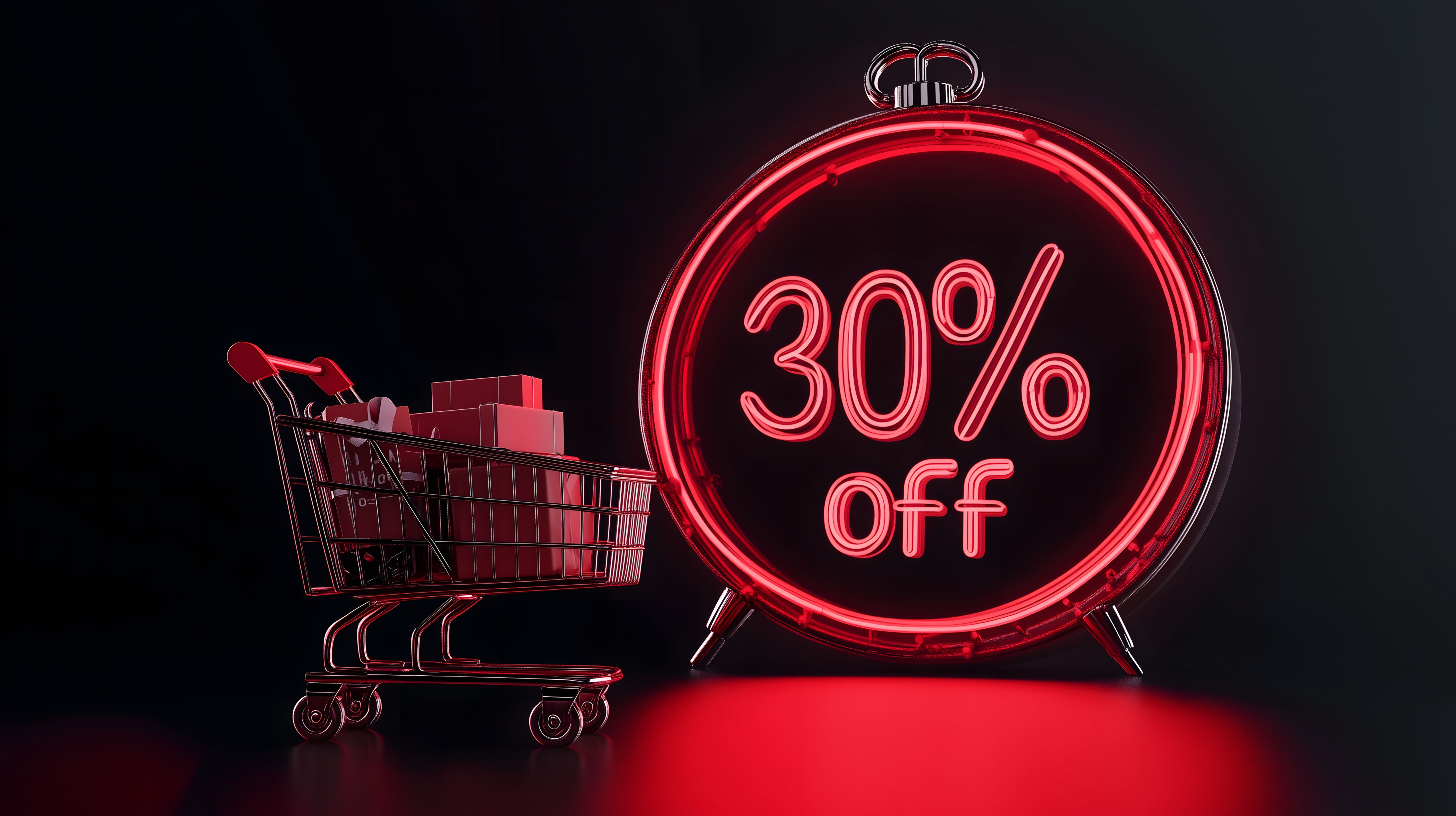 Das Bild zeigt einen roten Einkaufswagen vor einem dunklen Hintergrund, der von einem leuchtend roten Neonschild mit der Aufschrift '30% OFF' dominiert wird. In dem Einkaufswagen befinden sich mehrere Geschenkboxen, die den Eindruck eines Sonderangebots oder einer Rabattaktion vermitteln. Die kontraststarke Farbgebung und das moderne, minimalistisch-industrielle Design des Motivs lassen sich gut in Blogbeiträgen, Newsletter-Grafiken oder Social-Media-Posts zur Ankündigung von Verkaufsaktionen, Sonderangeboten und Preisreduktionen einsetzen. Dieses hochauflösende und frei nutzbare Stockfoto ist unter der Creative-Commons-Lizenz verfügbar.