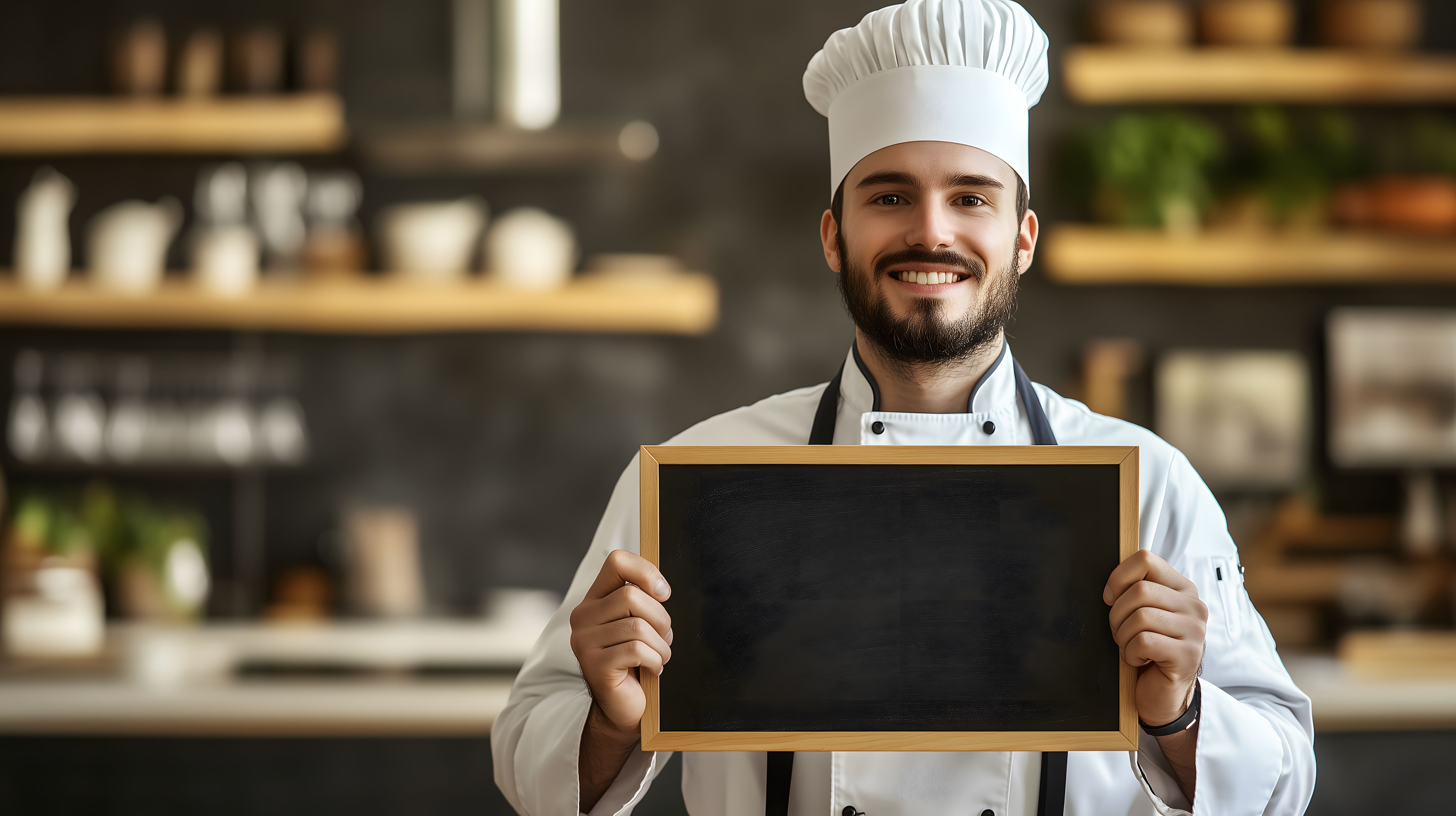 Dieses Bild zeigt einen freundlichen, lächelnden Koch in einer weißen Kochuniform, der ein leeres schwarzes Schild in den Händen hält. Er steht in einer rustikalen Küche mit Holzregalen im Hintergrund, was eine traditionelle, gemütliche Atmosphäre vermittelt. Das Foto könnte ideal für die Präsentation von Speisekarten, Aktionen oder Angeboten in Restaurants, Cafés oder Lebensmittelgeschäften verwendet werden. Als hochwertiges, kostenloses Stockfoto in hoher Auflösung und unter einer Creative-Commons-Lizenz eignet es sich hervorragend für diverse visuelle Inhalte wie Blogs, Websites, Newsletter oder Social-Media-Kanäle.