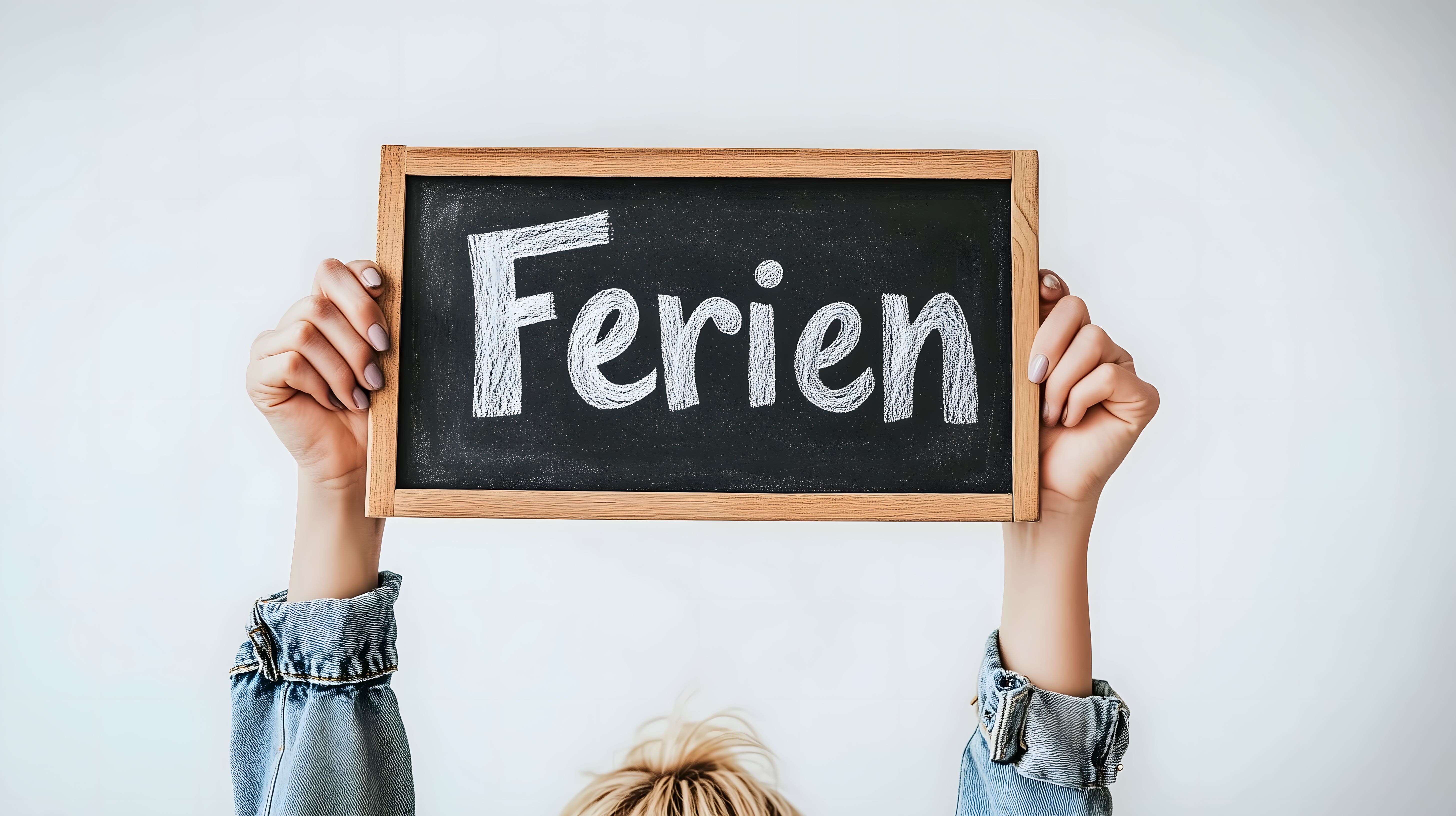 Dieses Stockfoto zeigt eine Tafel mit der Aufschrift 'Ferien' in weißer Kreide auf schwarzem Hintergrund. Die Tafel wird von zwei Händen gehalten, die aus dem Bildrand herausragen. Die Komposition ist minimalistisch und fokussiert den Schriftzug 'Ferien' als Sinnbild für Urlaub, Erholung und Freizeit. Das Bild eignet sich hervorragend für den Einsatz in Blogs, Newslettern, Social-Media-Posts oder Werbematerialien rund um das Thema Ferien, Urlaub und Bildung. Als kostenloses Stockfoto in hoher Auflösung und unter Creative-Commons-Lizenz ist es frei nutzbar.