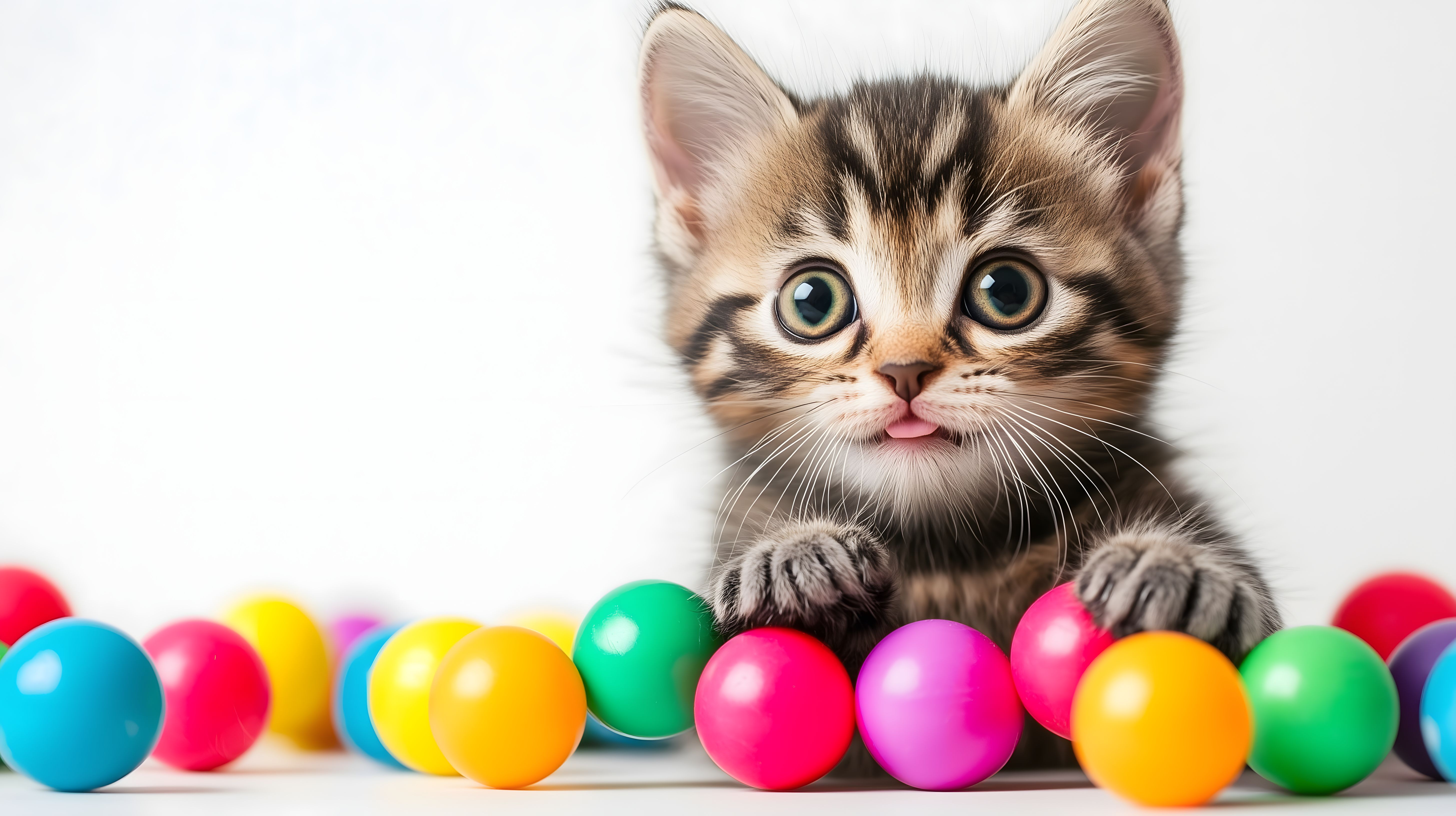 Das Foto zeigt ein niedliches Kätzchen, das neugierig zwischen bunten Spielbällen hervorschaut. Das Kätzchen hat ein getigertes Fell und große, runde Augen, die es dem Betrachter zuzuwenden scheint. Die farbenfrohen Kugeln in Pink, Gelb, Grün und Blau bilden einen schönen Kontrast zu dem weichen, flauschigen Fell des Tieres. Das Bild strahlt eine verspielt-freundliche Atmosphäre aus und eignet sich hervorragend für den Einsatz in Blogs, Newslettern, Social-Media-Beiträgen oder Werbematerialien, bei denen ein niedliches, süßes Motiv gefragt ist. Das Foto ist in hoher Auflösung verfügbar und kann unter den Bedingungen der Creative Commons-Lizenz kostenfrei genutzt werden.