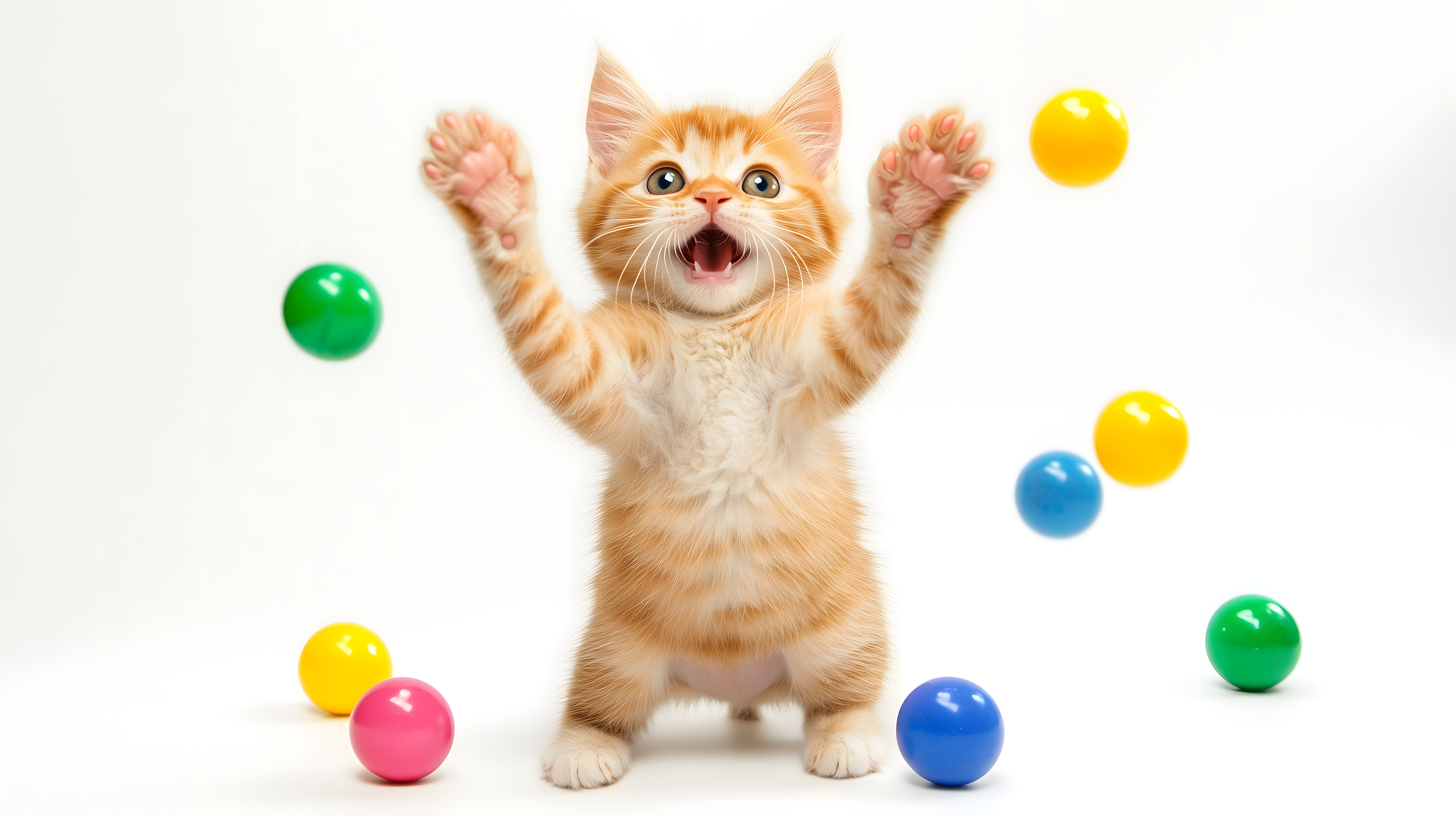 Das Bild zeigt ein entzückendes, rothaariges Kätzchen, das vor einem weißen Hintergrund mit bunten Bällen spielt. Das Kätzchen streckt seine Pfoten nach den Bällen aus, sein Gesichtsausdruck ist voller Spielfreude und Enthusiasmus. Die Farbpalette ist fröhlich und lebendig, mit leuchtenden Gelb-, Grün- und Blautönen, die den Eindruck von Leichtigkeit und Lebendigkeit vermitteln.