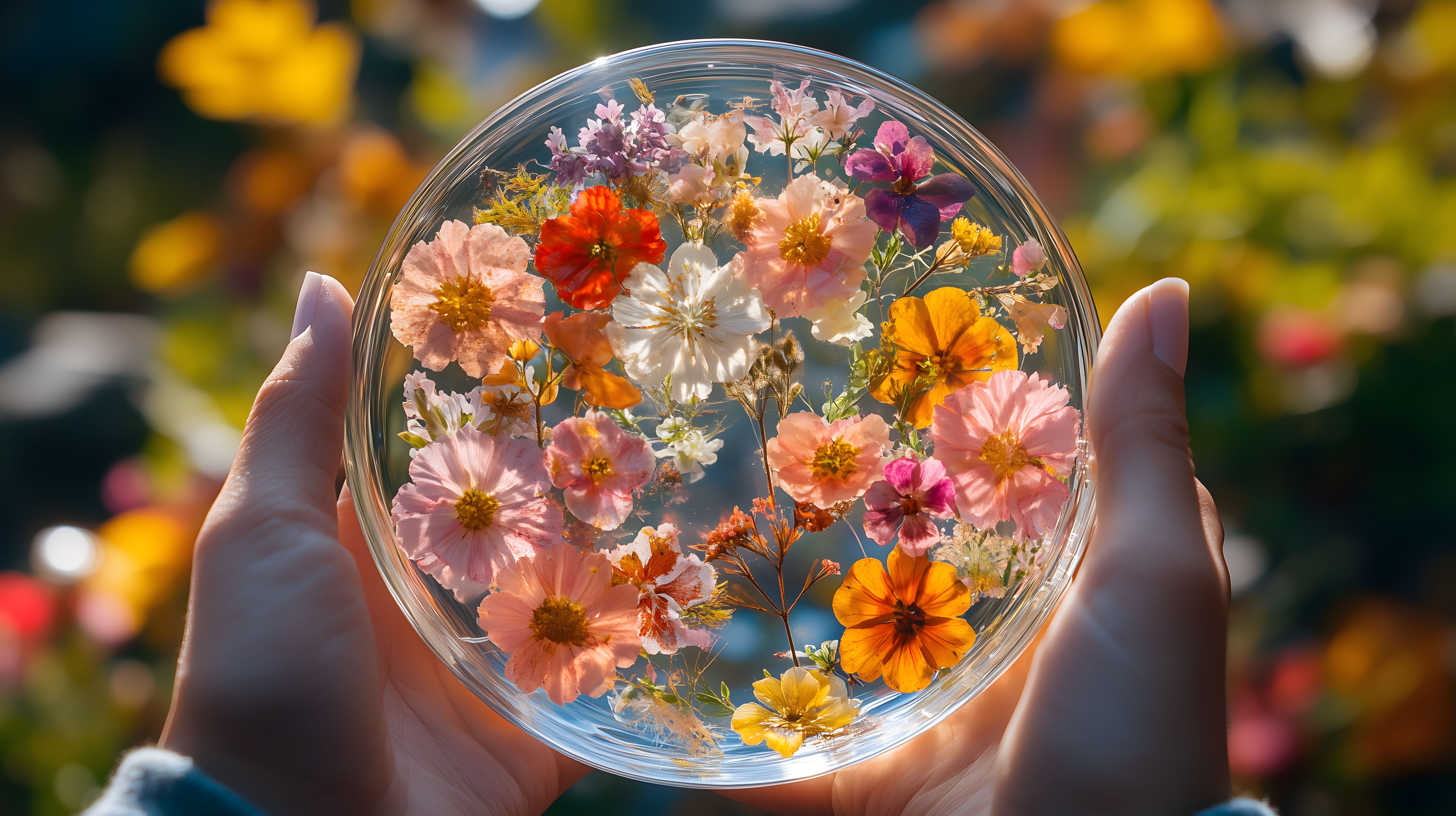 Dieses lebendige Foto zeigt eine Glaskugel, in der ein bunter Blumenstrauß mit verschiedensten Blüten wie Dahlien, Cosmeen und anderen Gartenblumen anmutig arrangiert ist. Die Blüten erstrahlen in vielen warmen Farbtönen wie Orange, Rot, Rosa und Gelb und werden von hellen, zarten Akzenten ergänzt. Die Glaskugel wird von Händen gehalten, die die Schönheit des Arrangements perfekt in Szene setzen. Das Bild strahlt eine natürliche, fröhliche Atmosphäre aus und eignet sich hervorragend als kostenloses Stockfoto für Newsletter, Blogs, Social Media-Posts oder Werbematerialien in hoher Auflösung und unter Creative Commons-Lizenz.