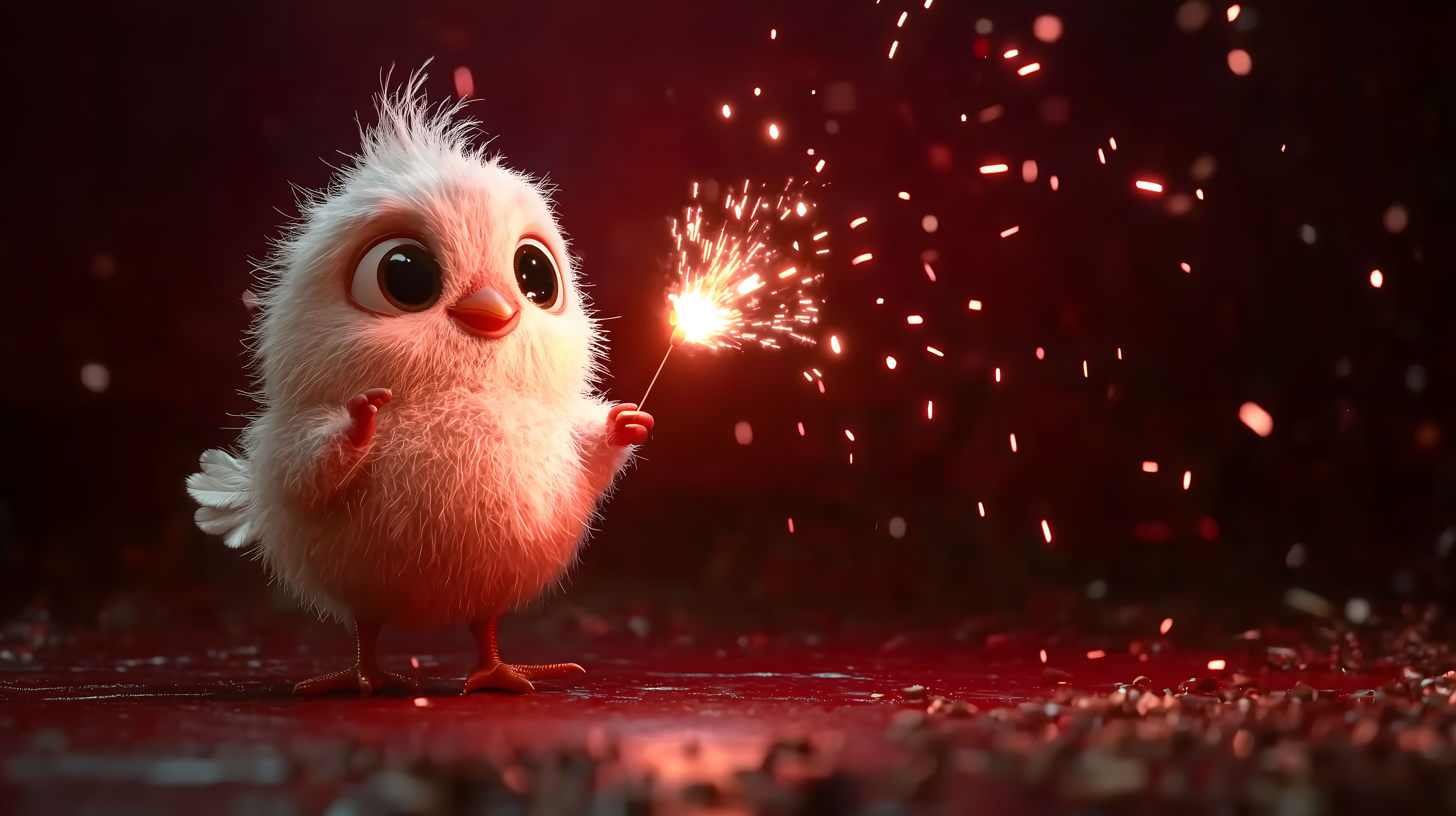 Das Bild zeigt ein entzückendes, flauschiges weißes Küken, das eine leuchtende Wunderkerze in seinen kleinen Füßen hält. Vor einem dunklen, roten Hintergrund sprühen bunte Funken und Explosionen in die Szene, die an eine festliche Silvesteratmosphäre erinnern. Das Küken schaut mit großen, neugierigen Augen direkt in die Kamera, was dem Bild eine freudige und fröhliche Stimmung verleiht. Dieses hochwertige Stockfoto in hoher Auflösung eignet sich hervorragend für den Einsatz in Blogs, Newslettern, Social-Media-Beiträgen oder Werbematerialien rund um Silvester und Neujahr. Es steht unter einer Creative-Commons-Lizenz zur kostenlosen Verwendung zur Verfügung.