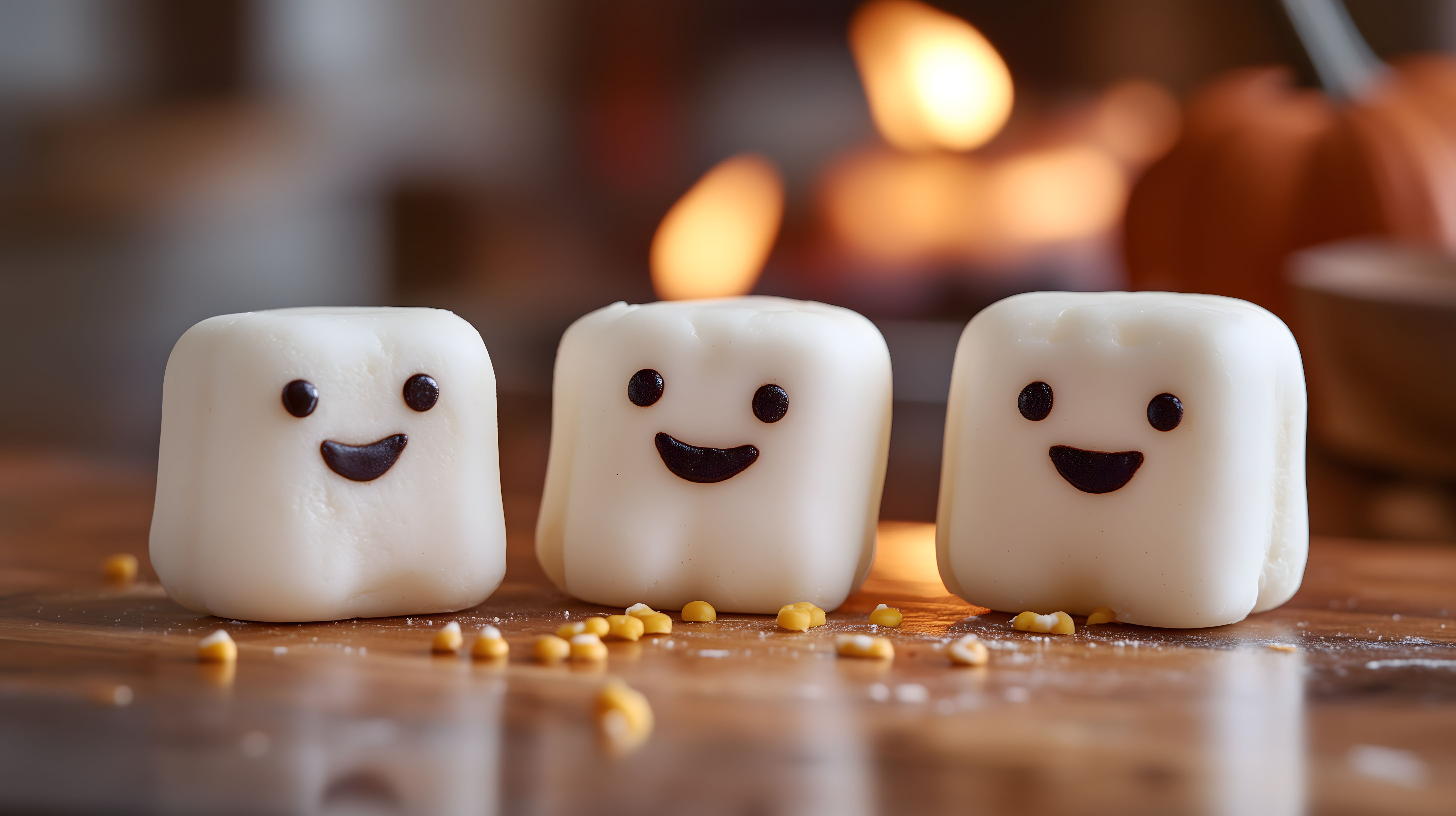 Dieses Foto zeigt drei niedliche, lächelnde Marshmallow-Figuren auf einem Holztisch. Die Marshmallows sind in eine warme, orange-rötliche Beleuchtung getaucht, was eine festliche Herbststimmung erzeugt. Die Oberfläche des Tischs ist mit Zuckerkristallen übersät, die an den Füßen der Figuren funkeln. Das Bild wirkt durch die Schärfe der Marshmallows und den unscharfen Hintergrund sehr stimmungsvoll und einladend. Es eignet sich hervorragend für den Einsatz in Blogs, Newslettern, Social-Media-Beiträgen oder Werbekampagnen rund um Themen wie Süßigkeiten, Desserts, Halloween oder die Herbststimmung. Als kostenloses Stockfoto in hoher Auflösung und unter der Creative-Commons-Lizenz ist es flexibel nutzbar.