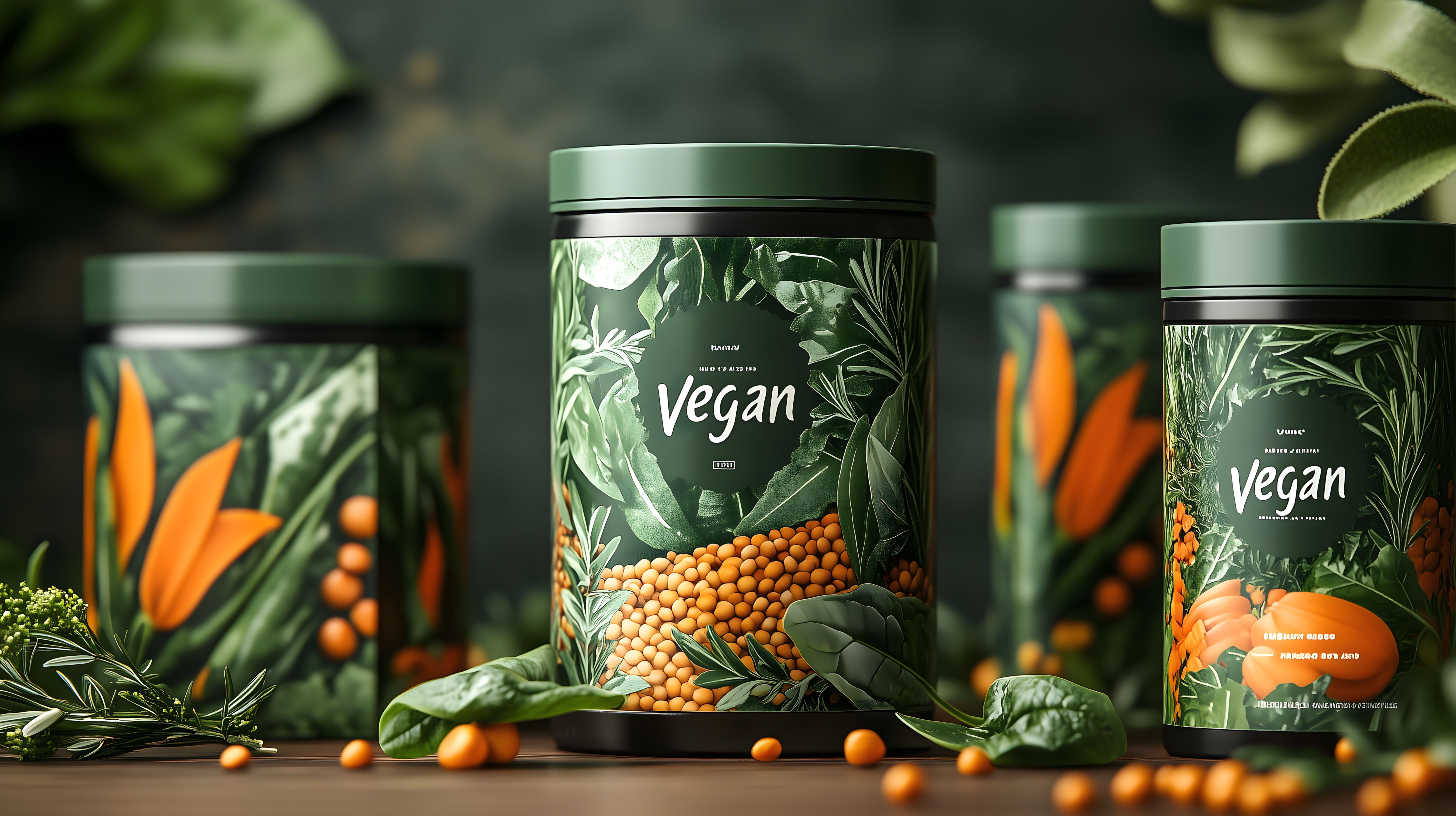 Dieses Foto zeigt eine Reihe von Dosen mit nachhaltigem veganen Verpackungsdesign vor einem natürlichen, grünen Hintergrund. Die Dosen sind mit Motiven von Blättern, Gemüse und Beeren bedruckt, die eine frische und ökologische Optik vermitteln. Die Anordnung der Dosen und das Arrangement mit Gemüseteilen und Blättern im Vordergrund schaffen eine einladende und authentische Präsentation der veganen Produkte. Dieses Foto eignet sich hervorragend für den Einsatz in Blogbeiträgen, Social-Media-Kampagnen oder Werbemitteln, die ein nachhaltiges, gesundheitsbewusstes Image transportieren wollen. Das hochauflösende Bild ist als kostenloses Stockfoto unter Creative-Commons-Lizenz verfügbar.