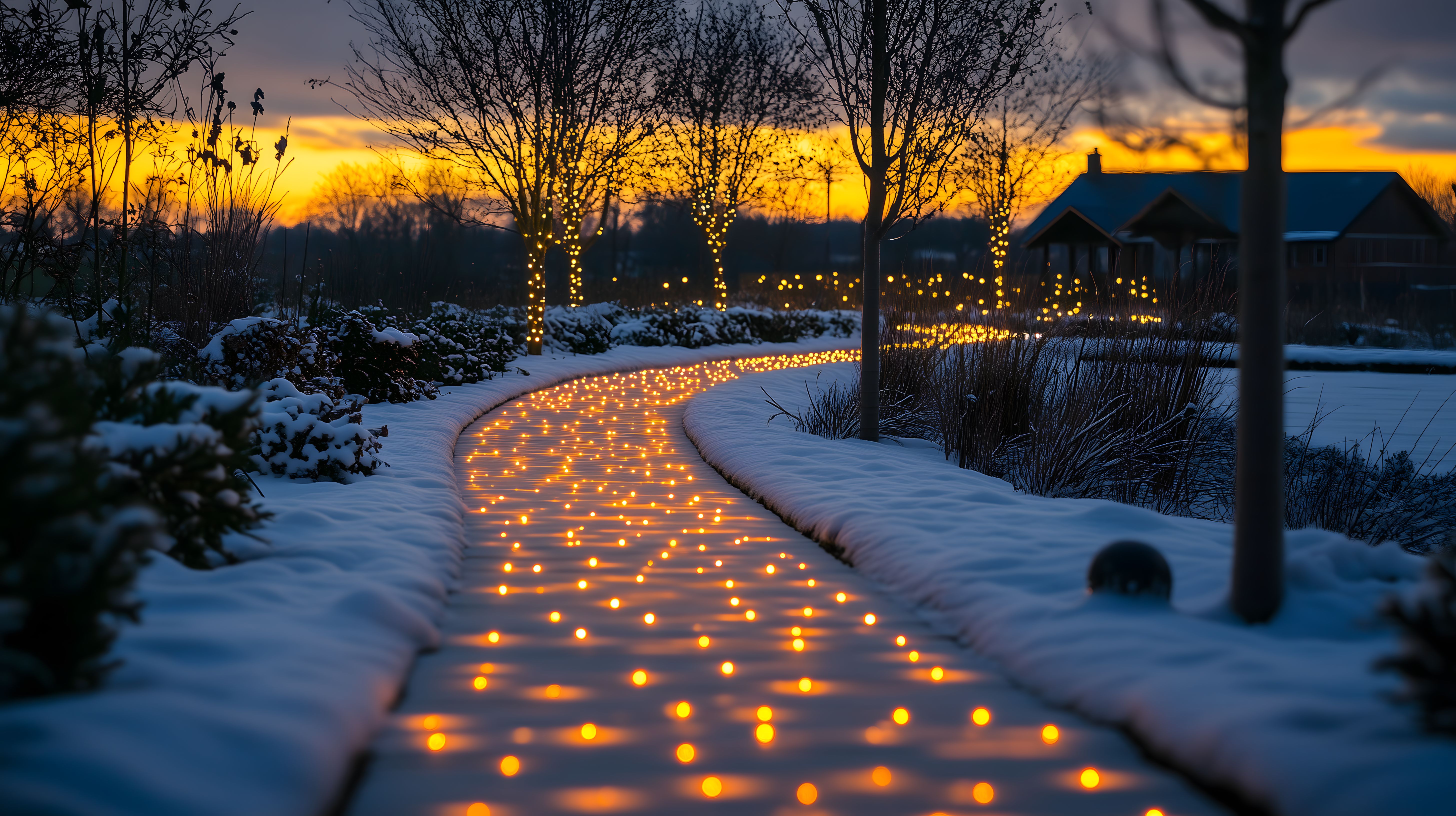 Dieses winterliche Foto zeigt einen verschneiten Weg, der stimmungsvoll mit Lichterketten gesäumt ist. Der Weg schlängelt sich durch eine verschneite Landschaft mit Bäumen und führt zu einem Haus im Hintergrund. Die warmen Lichter der Lichterketten erstrahlen in der Dämmerung und verleihen der Szene eine märchenhafte, romantische Atmosphäre. Dieses kostenfreie Hochauflösungs-Stockfoto unter Creative-Commons-Lizenz eignet sich perfekt für Blogs, Newsletter, Social-Media-Posts oder Werbemotive in der Weihnachts- und Winterzeit.