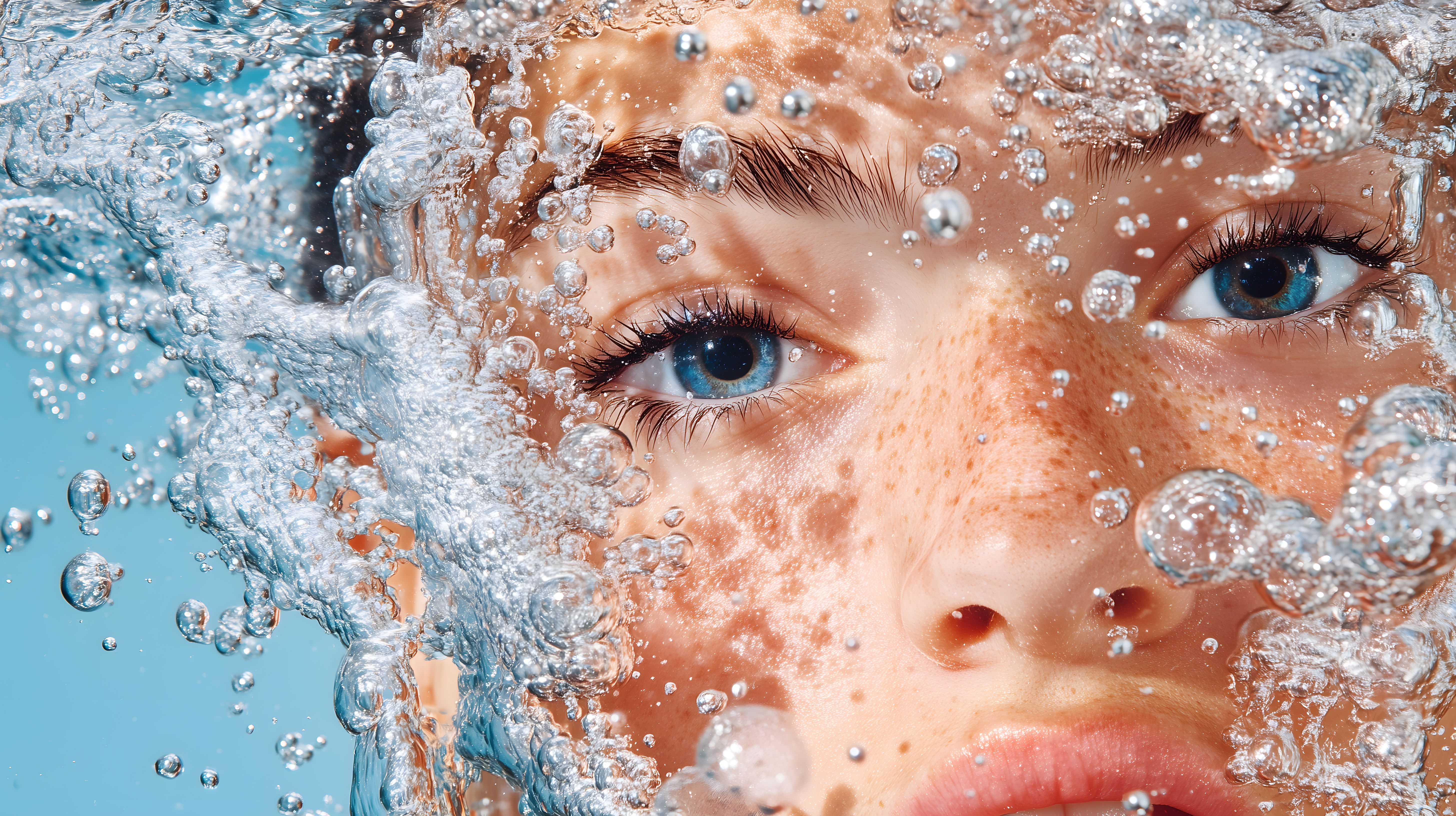 Dieses faszinierende Foto zeigt eine Nahaufnahme eines Frauengesichts, das unter Wasser aufgenommen wurde. Die Augen der Frau sind geschlossen und ihre Haut ist von Wassertropfen und Luftblasen bedeckt. Das Bild strahlt eine erfrischende und beruhigende Atmosphäre aus und könnte hervorragend für Webseiten, Blogs, Newsletter oder soziale Medien rund um die Themen Wellness, Spa oder Sommerfrische eingesetzt werden. Das hochauflösende Foto steht unter einer Creative-Commons-Lizenz zur Verfügung und kann daher kostenfrei genutzt werden.