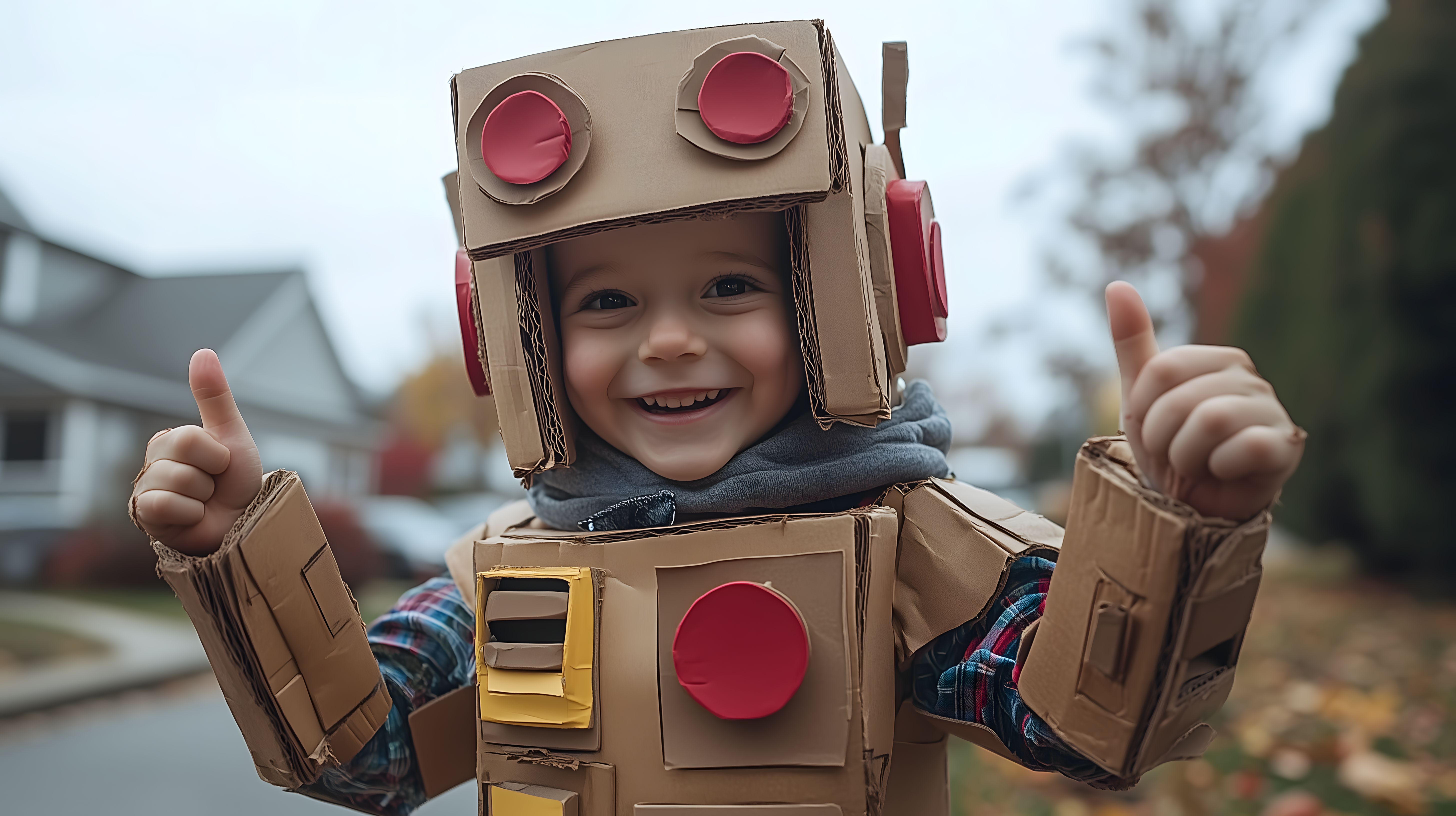 Das Bild zeigt ein fröhliches, lächelndes Kind, das ein selbst gebasteltes Roboterkostüm aus Karton trägt. Das Kind steht draußen in einem Wohngebiet und hat die Arme und Daumen nach oben gestreckt, offensichtlich voller Begeisterung über sein Kostüm. Das bunte Outfit besteht aus roten Kreisen als Augen und einer gelben Verkleidung, die an einen Roboter erinnert. Im Hintergrund sind Bäume und Häuser zu sehen, die eine natürliche Umgebung schaffen. Dieses Stockfoto eignet sich hervorragend für Beiträge in Blogs, Newslettern oder sozialen Medien rund um das Thema Kreativität, Fantasie und Kinderfreude. Es ist in hoher Auflösung und unter einer Creative-Commons-Lizenz verfügbar.