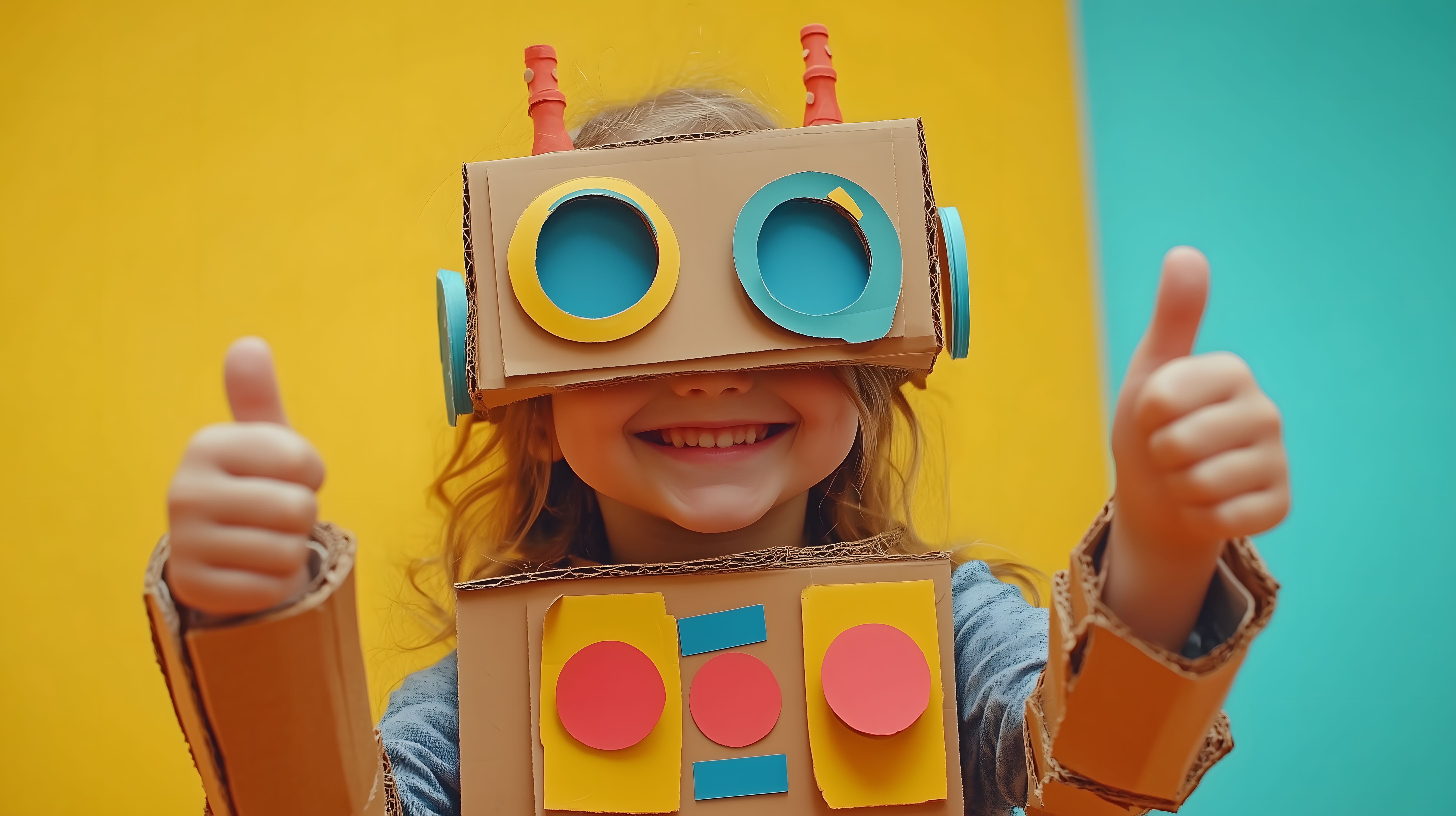 Das Foto zeigt ein lächelndes Mädchen, das ein selbst gebasteltes Roboterkostüm aus Karton trägt. Es hat einen freudigen Gesichtsausdruck und gibt dem Betrachter beide Daumen nach oben. Der Kontrast zwischen den leuchtend gelben und türkisfarbenen Elementen des Kostüms und dem fröhlichen Gesichtsausdruck des Mädchens erzeugt einen lebendigen, kreativen Eindruck. Dieses Stockfoto in hoher Auflösung ist ideal für den Einsatz in Blogbeiträgen, Newslettern oder Social-Media-Kanälen zum Thema Kreativität, Kindheit, Bildung und Technologie. Es steht unter einer kostenlosen Creative-Commons-Lizenz zur Verfügung.