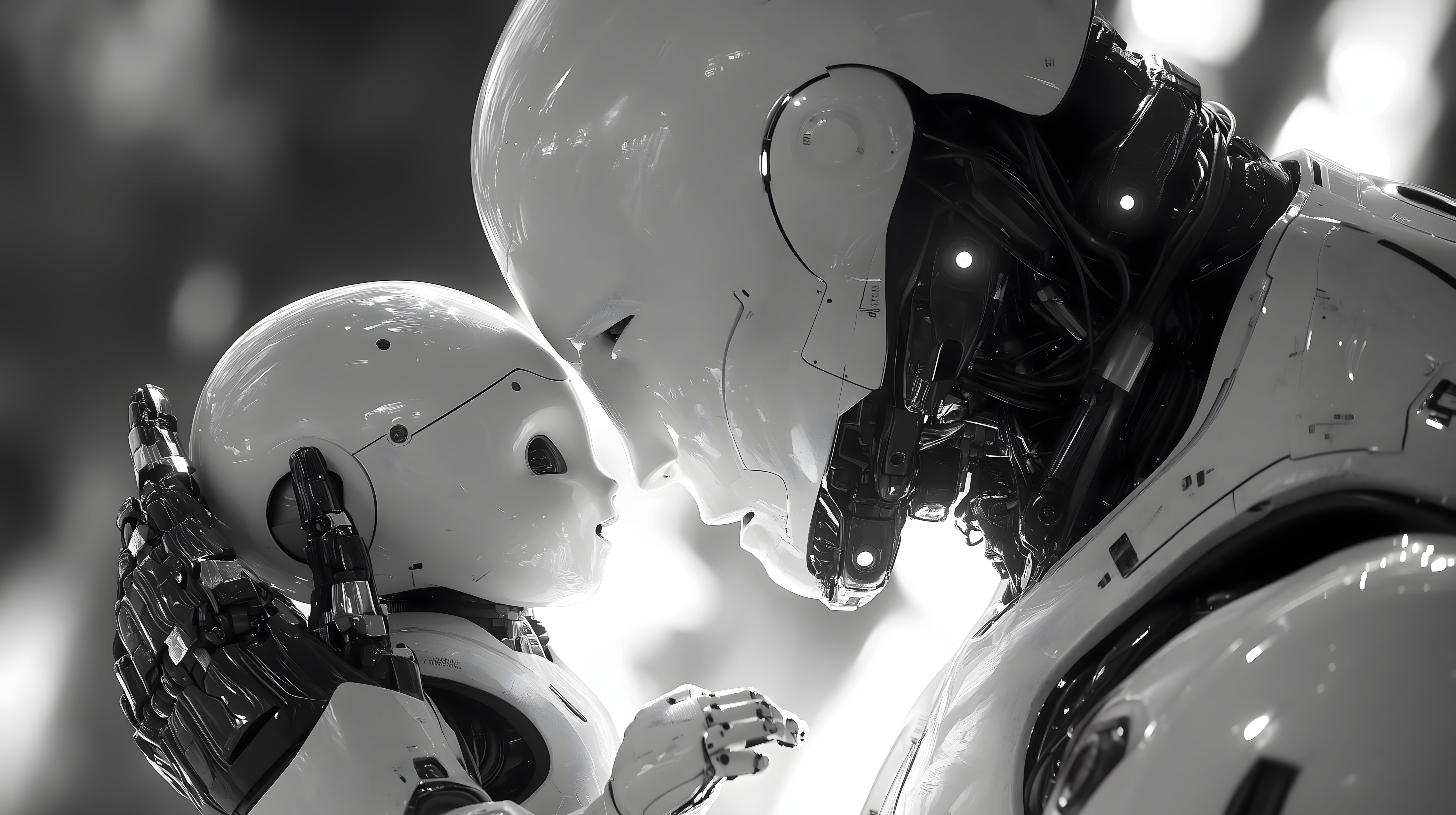 Dieses schwarz-weiße Bild zeigt eine faszinierende Darstellung der Interaktion zwischen zwei Robotern. Die Szene hat einen abstrakten, futuristischen Charakter, bei der sich die beiden Maschinen in sanfter, fast zärtlicher Art und Weise zu berühren scheinen. Die minimalistischen Formen und der hohe Kontrast verleihen dem Bild eine surreale, konzeptionelle Ästhetik. Es lässt den Betrachter über die Beziehung zwischen Mensch und Maschine, über Künstliche Intelligenz und deren mögliche Zukunft nachdenken. Dieses hochwertige Stockfoto in hoher Auflösung kann kostenfrei unter der Creative-Commons-Lizenz verwendet werden, z.B. für Blogbeiträge, Soziale Medien oder Werbematerialien mit einem Fokus auf Technologie, Zukunft und digitale Kunst.