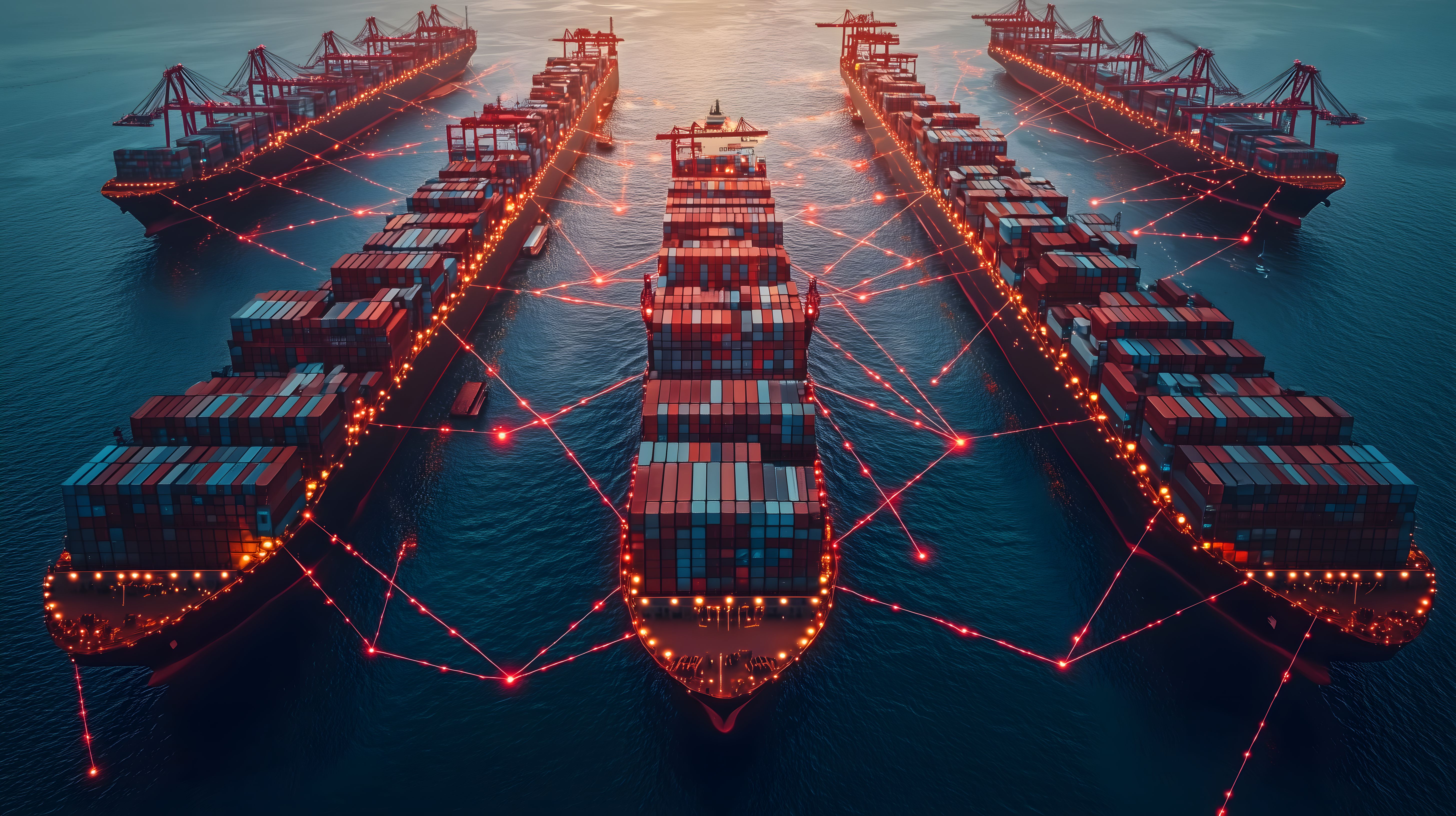 Dieses faszinierende Bild zeigt ein Netzwerk von Frachtcontainerschiffen auf dem Meer, die über ein komplexes System von Lichtern und Signalen miteinander verbunden sind. Die Schiffe sind in einer symmetrischen Anordnung dargestellt, die den globalen Charakter der Frachtlogistik widerspiegelt. Die Kombination aus den roten Leuchtsignalen, den dunklen Containerschiffen und dem blauen Wasser erzeugt eine beeindruckende, fast futuristische Atmosphäre. Dieses Foto eignet sich hervorragend für die Verwendung in Artikeln, Blogbeiträgen oder Werbematerialien, die sich mit Themen wie Globalisierung, Digitalisierung oder internationaler Handel befassen. Als kostenloses, hochauflösendes Stockfoto unter Creative-Commons-Lizenz ist es frei für den kommerziellen und redaktionellen Einsatz.