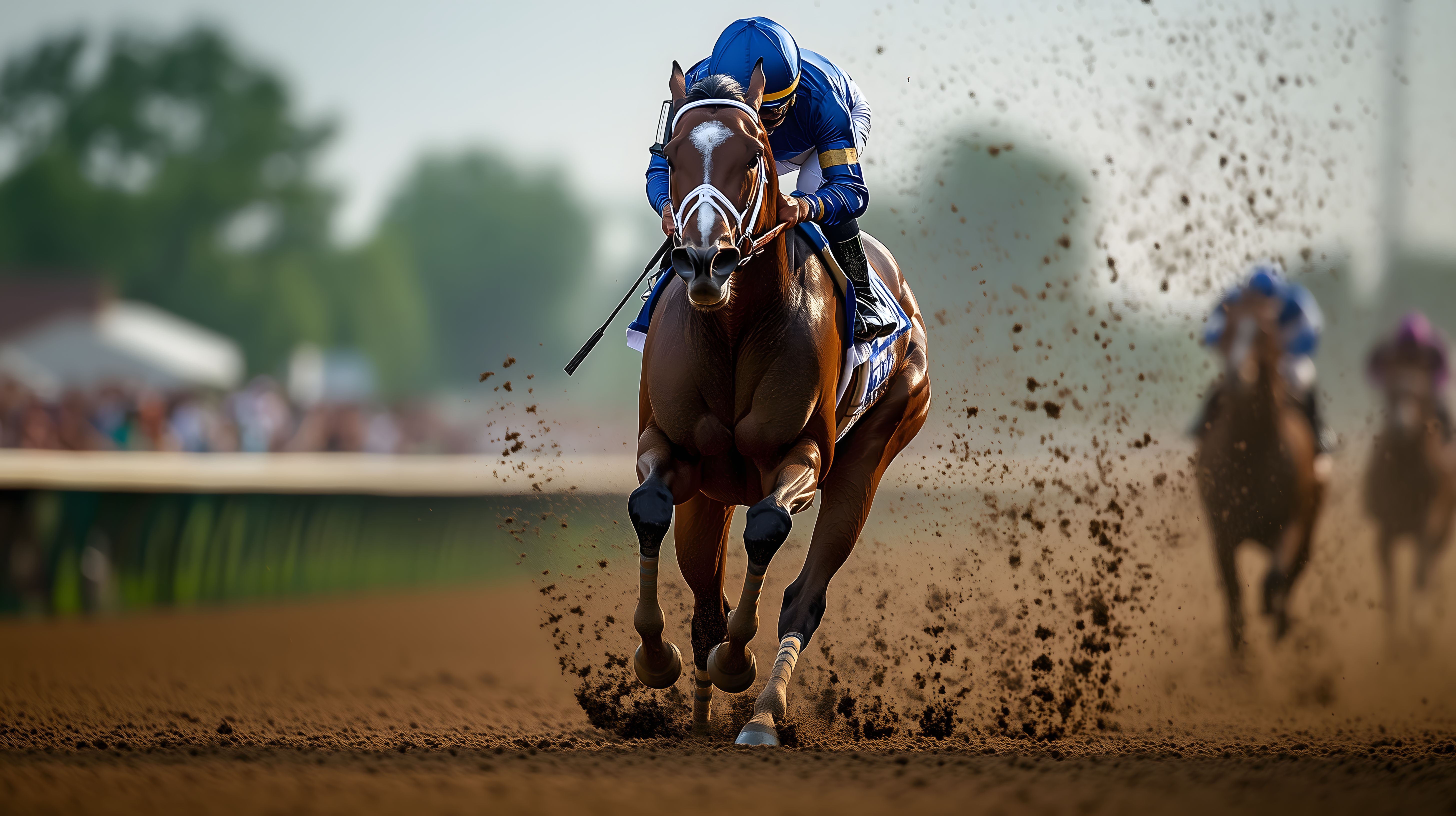Dieses Foto zeigt ein aufregendes Pferderennen, wahrscheinlich den legendären Kentucky Derby. Ein Rennpferd rast in voller Geschwindigkeit über die Rennstrecke, dabei wird eine enorme Menge an Staub aufgewirbelt. Der Jockey ist konzentriert und lenkt das Pferd mit aller Kraft. Im Hintergrund sind weitere Pferde zu sehen, die ebenfalls um den Sieg kämpfen. Das Bild fängt die pure Dynamik und Spannung eines solchen Rennens perfekt ein und wäre ein ideales kostenloses Stockfoto in hoher Auflösung für verschiedene Verwendungszwecke, wie zum Beispiel Sportberichterstattung, Werbung oder soziale Medien. Die Veröffentlichung unter einer Creative Commons-Lizenz würde es vielen Menschen zugänglich machen.