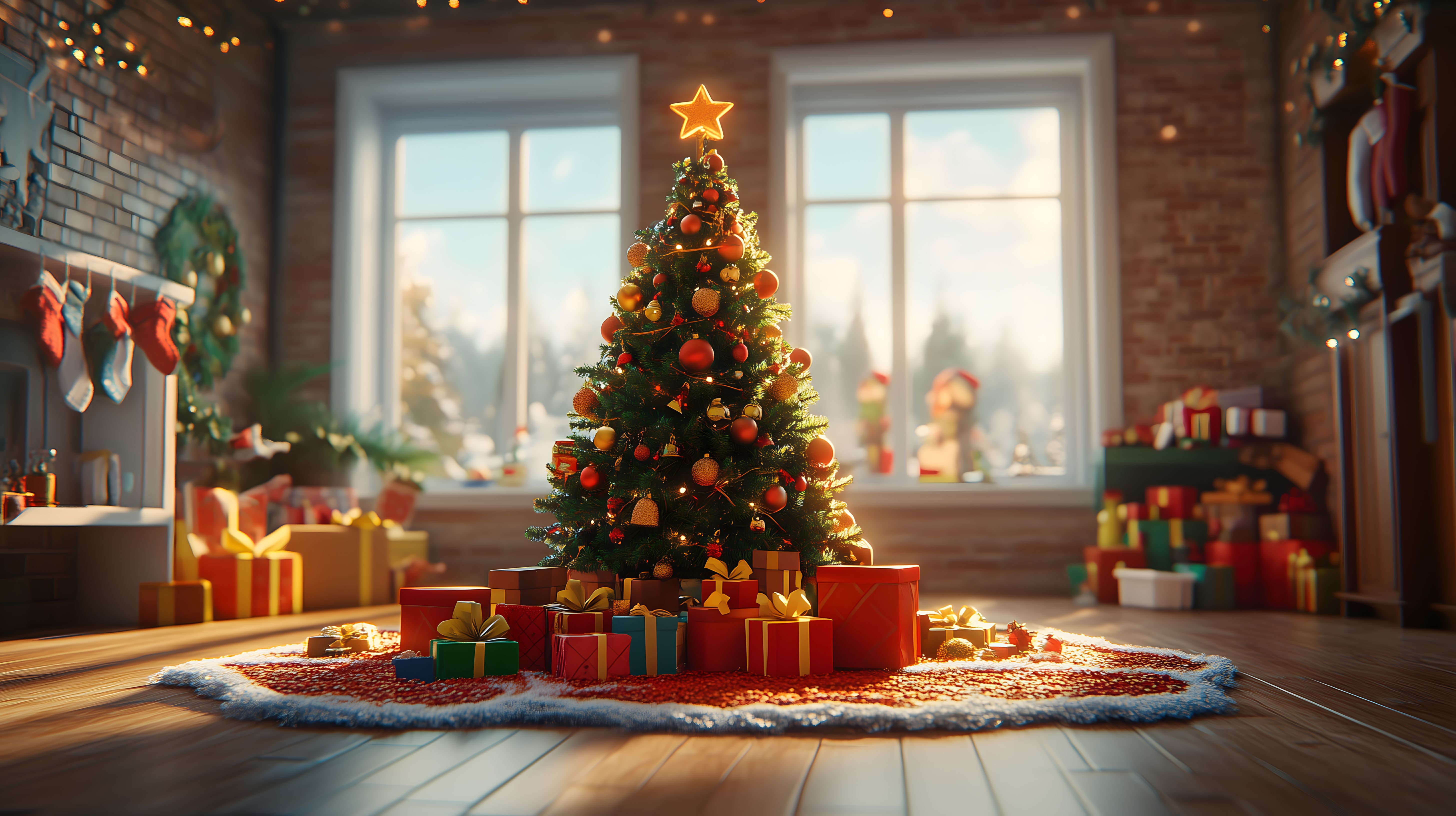 Das Bild zeigt ein gemütliches Weihnachtszimmer mit einem prächtigen, dekorativ geschmückten Weihnachtsbaum in der Mitte. Vor dem Baum sind zahlreiche Geschenke in Rot und Gold angeordnet, die eine festliche Atmosphäre schaffen. Im Hintergrund sind große Fenster zu sehen, durch die der Blick nach draußen in eine winterliche Landschaft fällt. Die Wände sind aus Ziegelsteinen, was dem Raum einen rustikalen Charme verleiht. Insgesamt vermittelt das Bild eine stimmungsvolle, familiäre Weihnachtsstimmung, die sich perfekt für Weihnachtsdekorationen, Weihnachtsgrüße oder Marketingmaterialien rund um die Feiertage eignet. Dieses hochauflösende Foto steht unter der Creative Commons-Lizenz zur kostenlosen Nutzung zur Verfügung.