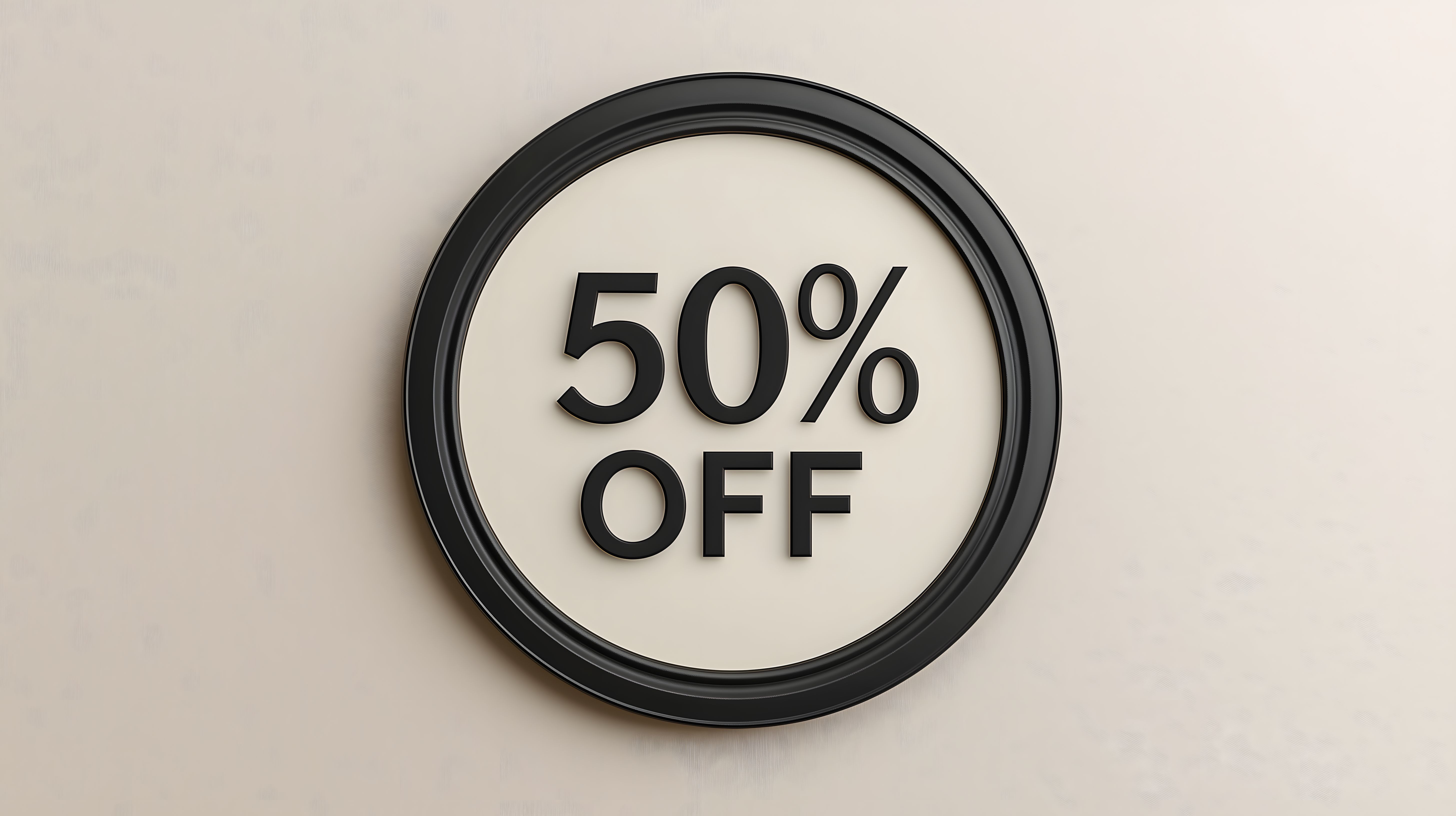Dieses Bild zeigt ein einfaches, aber wirkungsvolles Sonderangebot-Schild mit einem Prozentsatz von 50% Rabatt. Das Schild ist in einem schwarzen Rahmen auf einem hellen, beigen Hintergrund platziert, was einen modernen und minimalistischen Charakter verleiht. Die Typographie hebt den Rabattwert deutlich hervor und macht ihn zum Blickfang. Dieses Stockfoto eignet sich perfekt für den Einsatz in Werbekampagnen, Verkaufsannoncen, Newslettern oder sozialen Medien, um Kunden auf besondere Angebote aufmerksam zu machen. Das hochauflösende Bild steht unter einer Creative Commons-Lizenz zur freien Nutzung zur Verfügung.